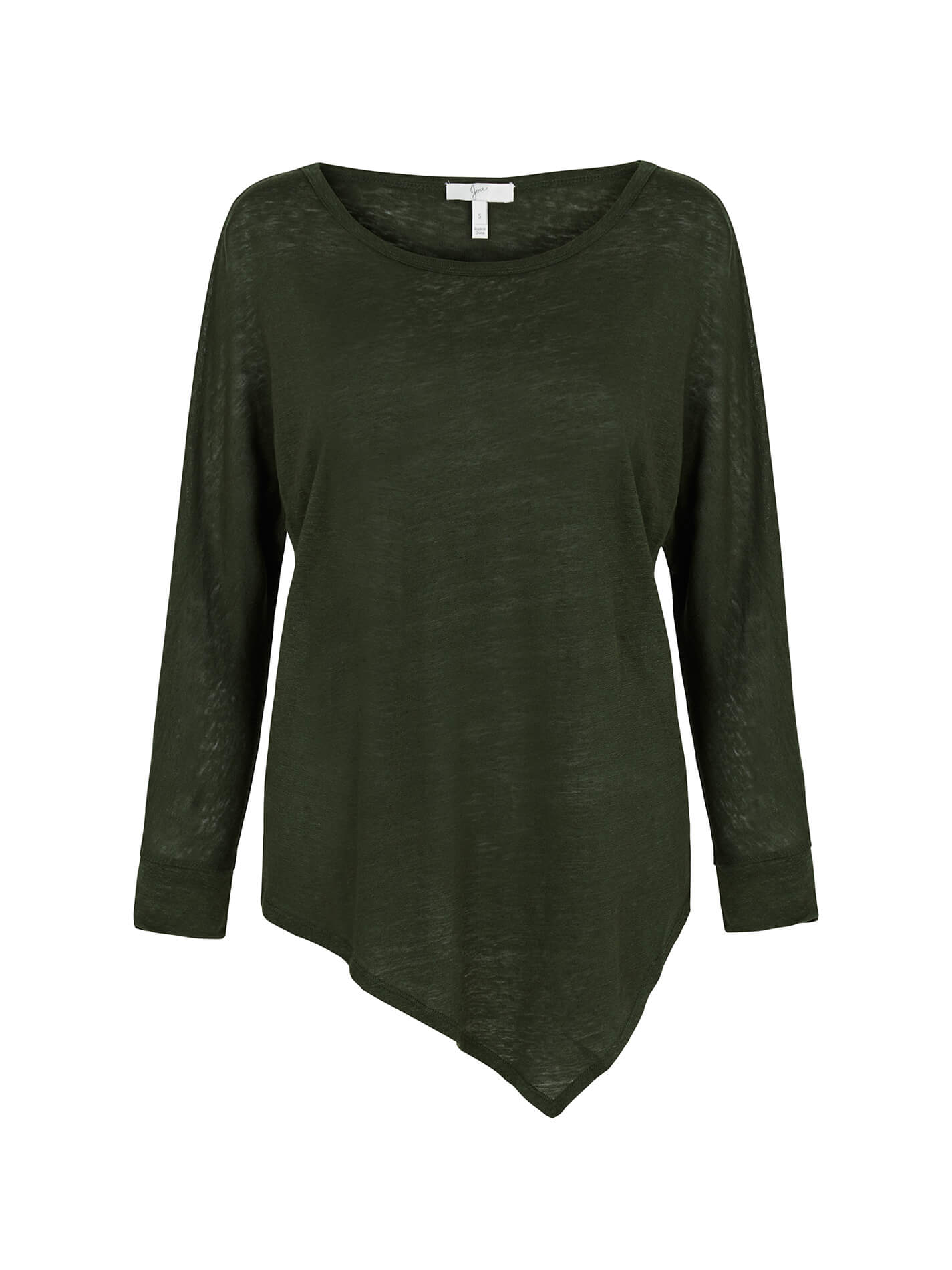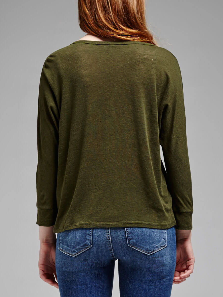The Marvette Top from Joie is a lightweight linen top, and comes in a deep military green colour. It features a boat neck, 3/4 length sleeves, and an asymmetrical hem.