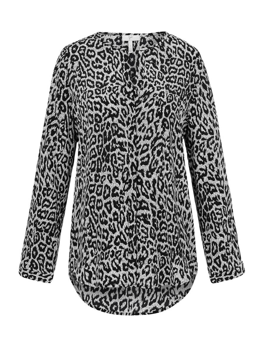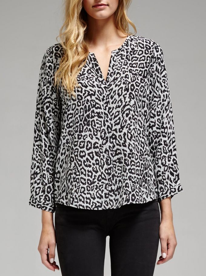 The Purine Blouse from Joie is a gorgeous white and black leopard print. Featuring a notched V neckline, covered-button placket, and curved shapes hem. The blouse has cuffed bracelet length sleeves.