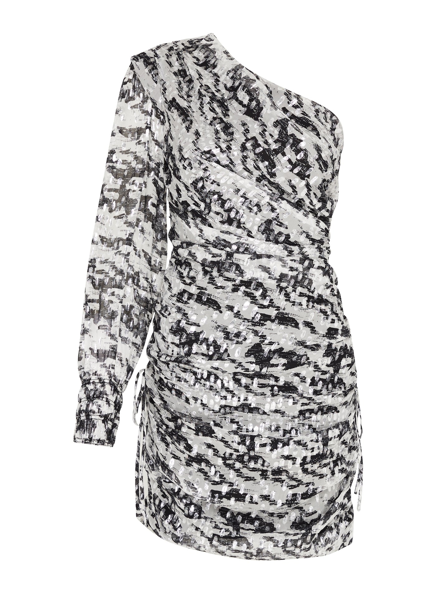 Let the celebrations begin with the IRO Paris Kallar Dress in Black White Silver. Constructed from a viscose, silk blend with metallic silver detailing this dress features an asymmetrical design with a single sleeve, ruched detailing with a tie finish on the sides and a draped silhouette.