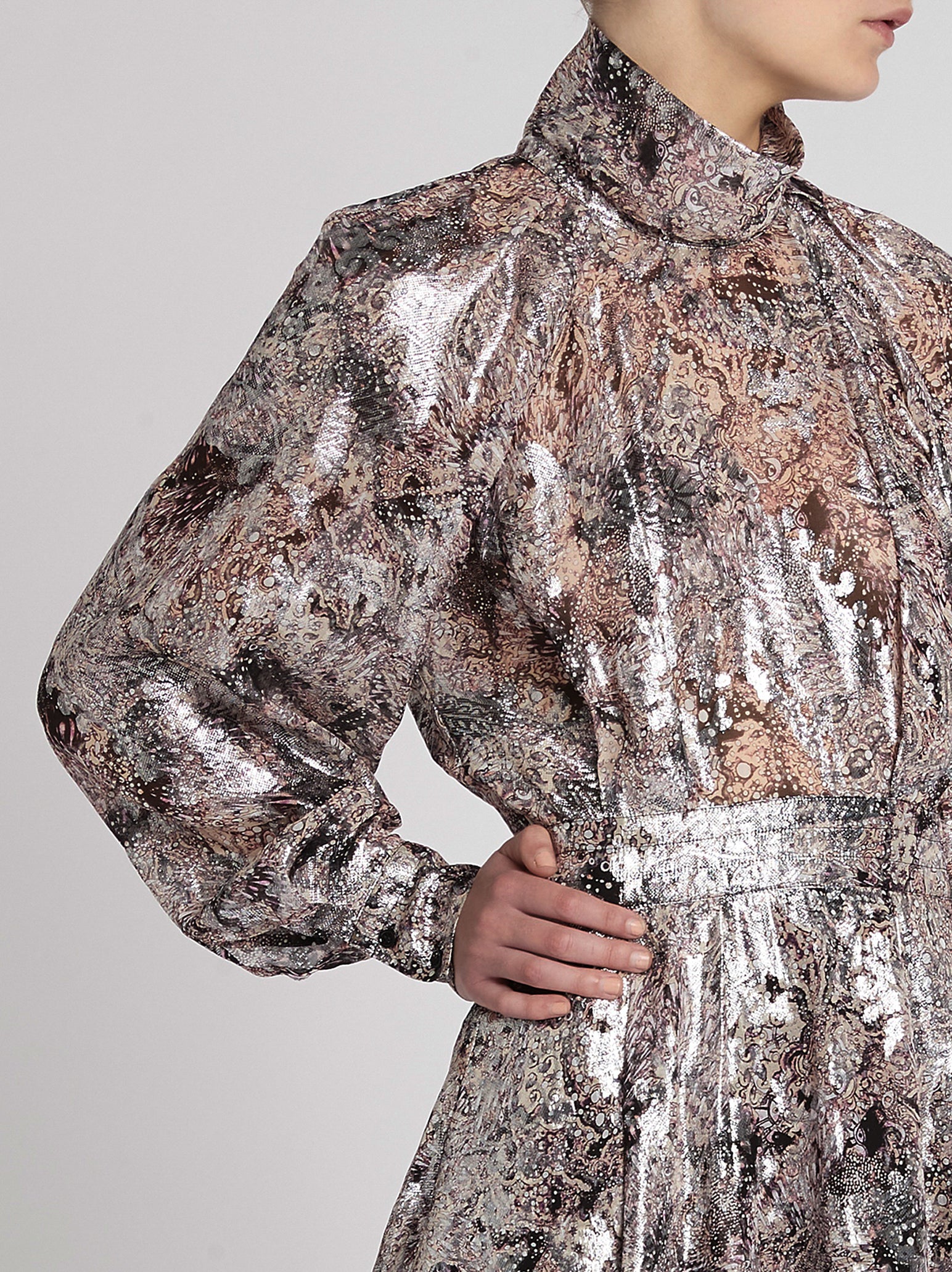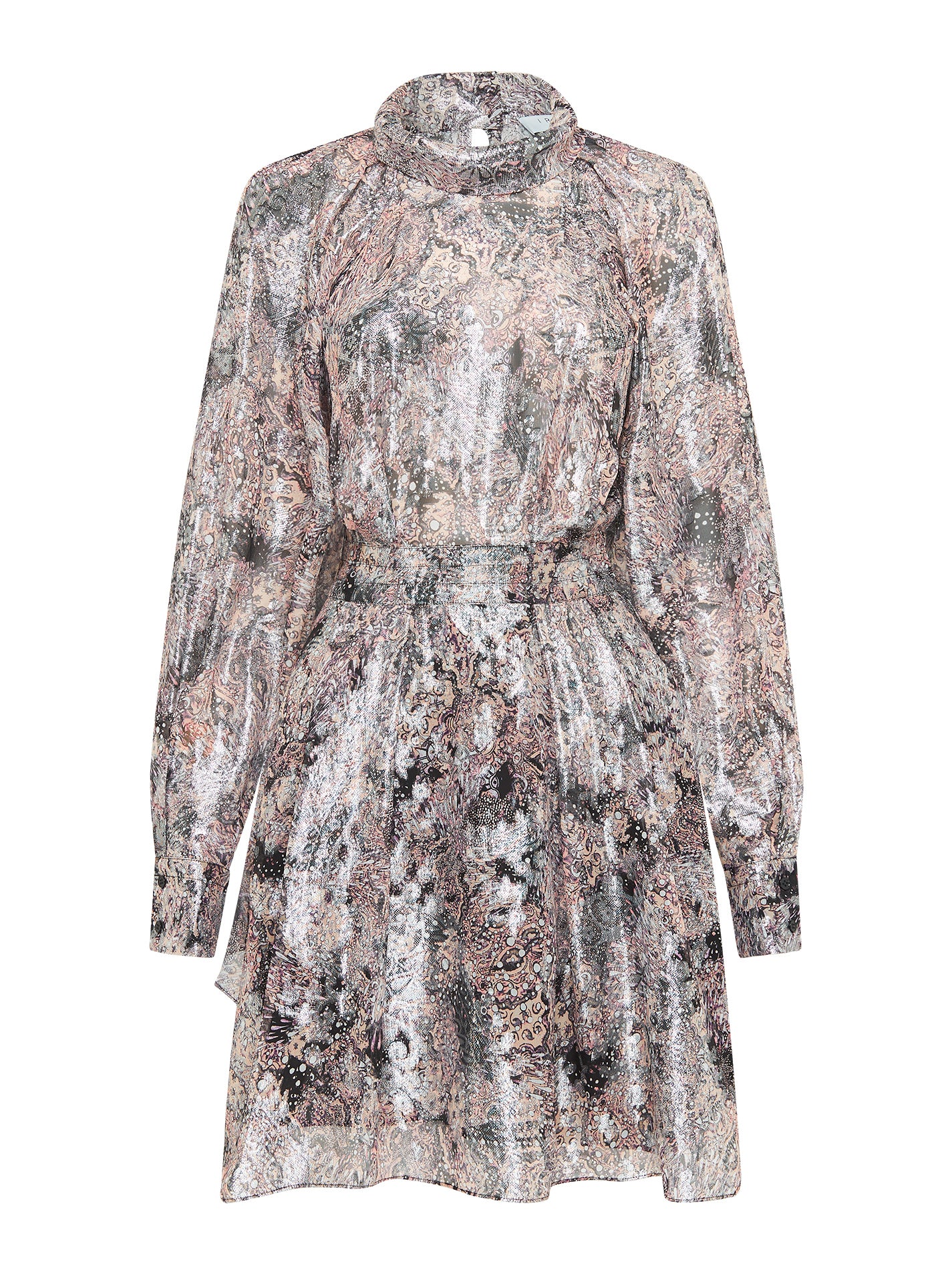Make the ultimate statement in the IRO Rosalia Dress in Grey this event season. Crafted from an ultra luxe silk blend this mini, long sleeve dress features a high buttoned fastened empire neckline with a stunning IRO original print that shimmers and shines and is finished with a cinched in waistband panel and asymmetric hemline. Team with a strappy heel and dance the night away.