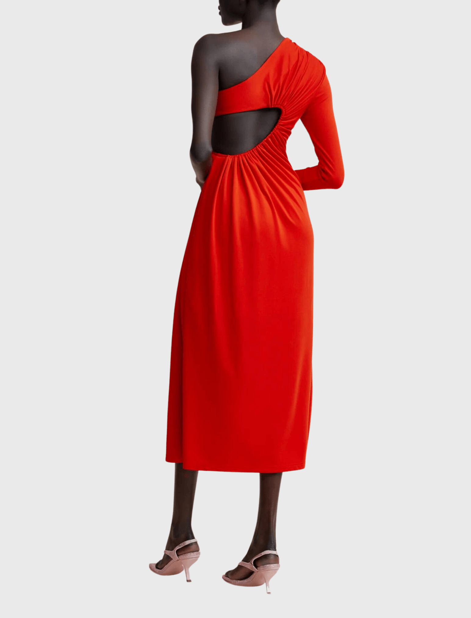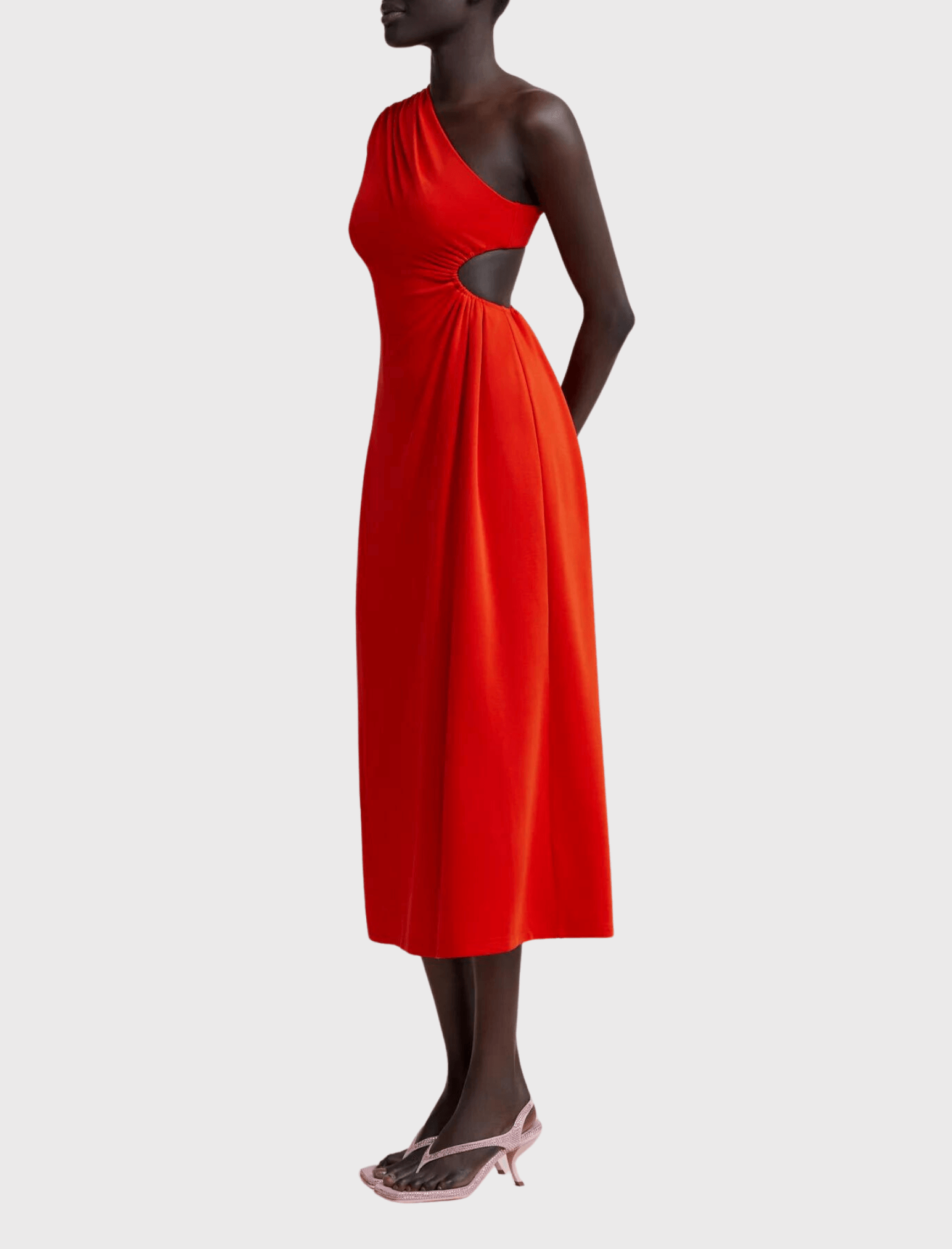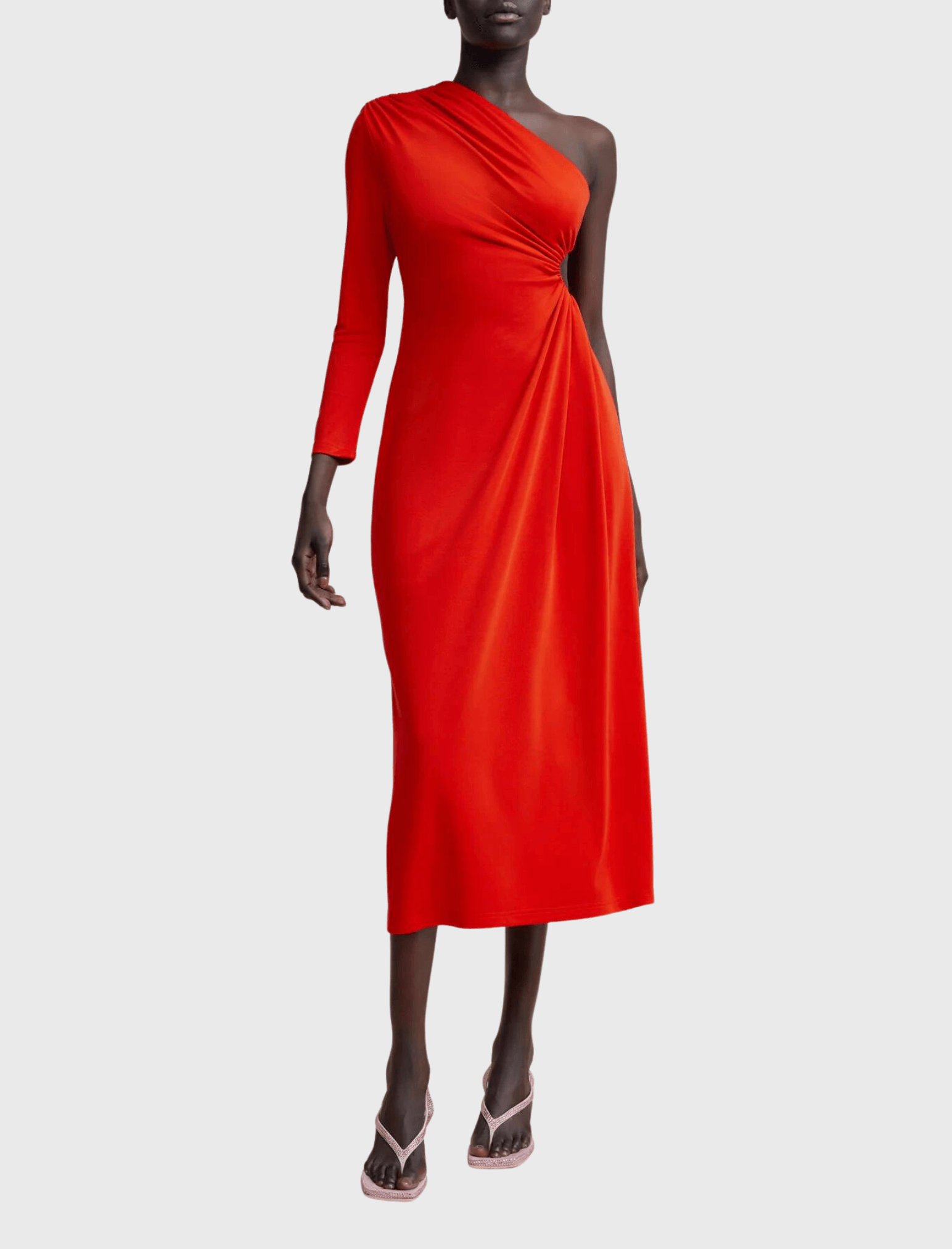 The Acler Stanmore One Shoulder Dress in Scarlet is made from 70% Modal, 30% Polyester
