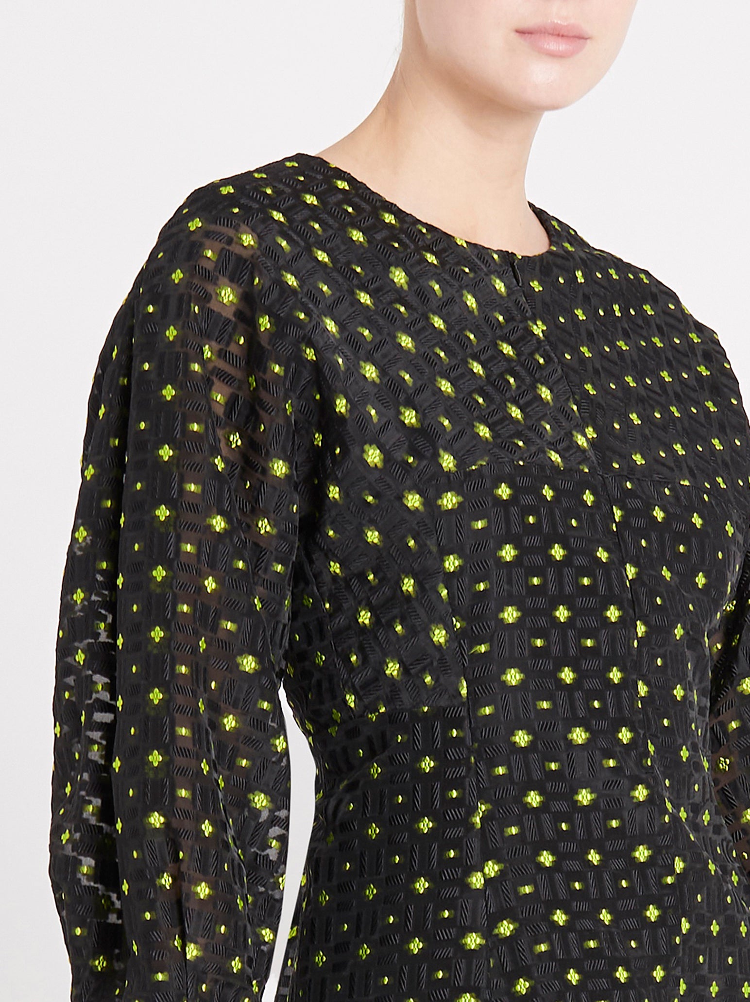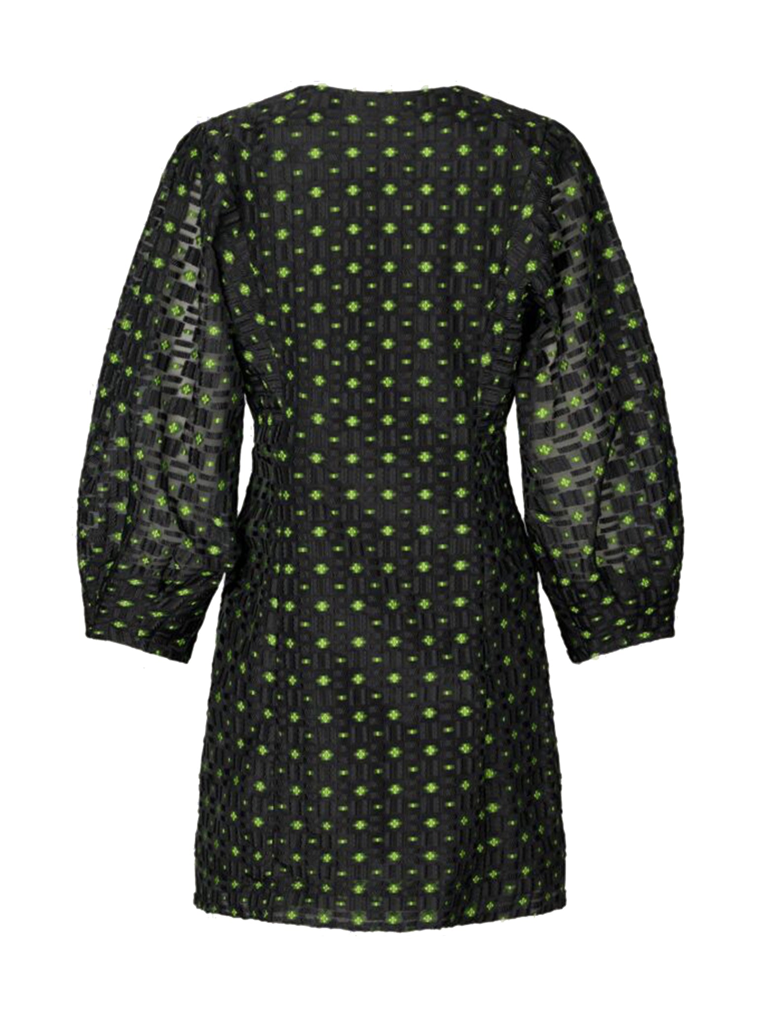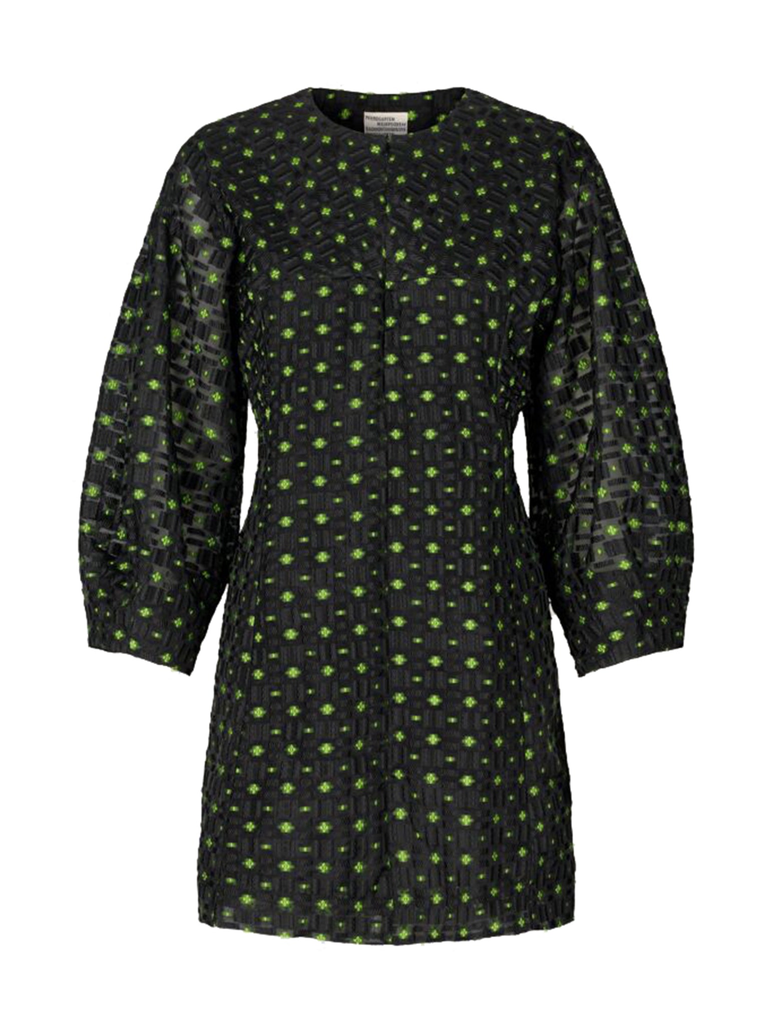 The perfect winter mini dress is here with the Baum Und Pferdgarten Amina Dress in Black Star. Constructed from recycled polyester this pieces features puffed, sheer bracelet length sleeves, a round neckline, embroidered overlay with contrast neon green stitching, a sewn in lining and an invisible zip at the centre back.