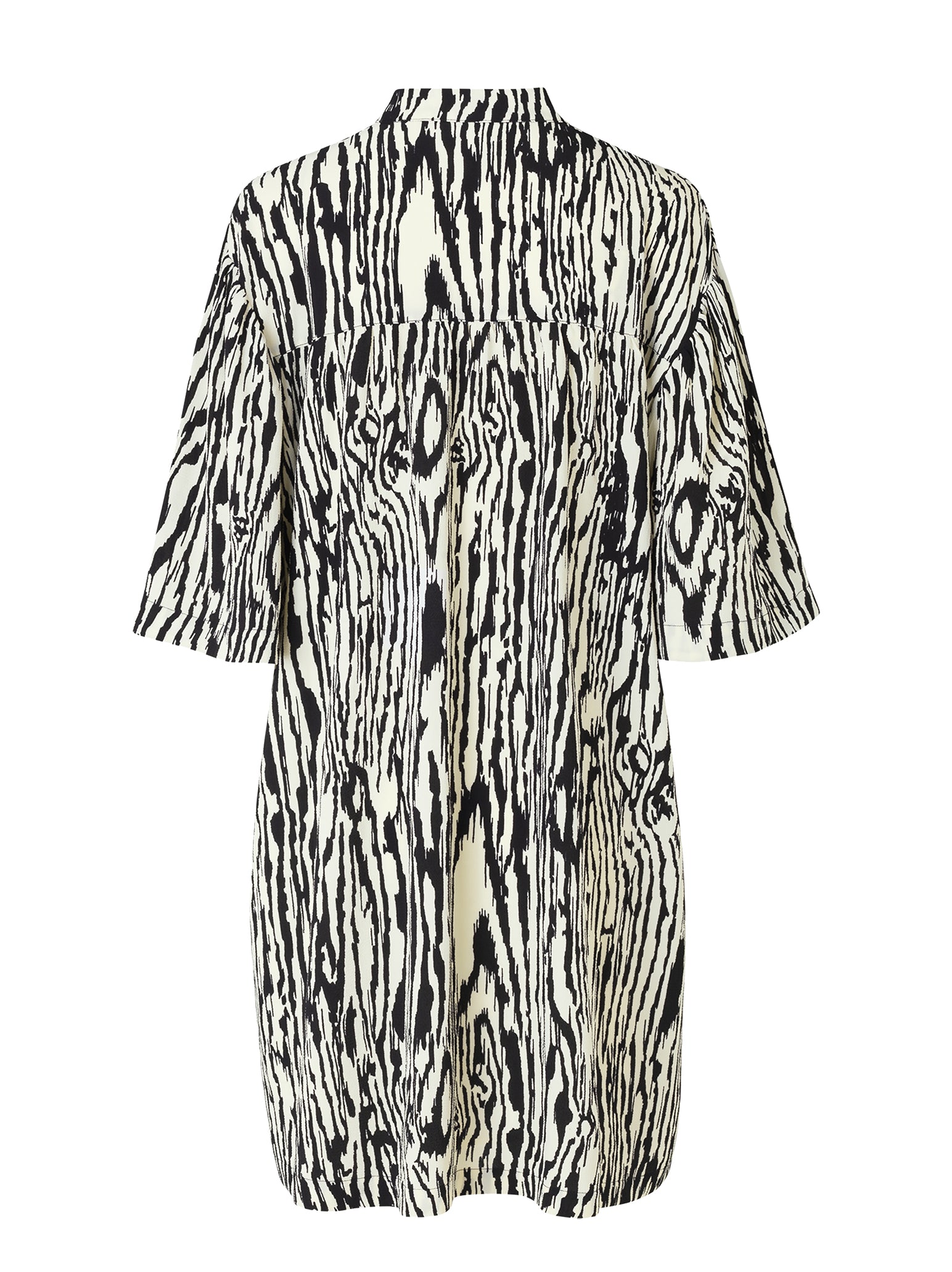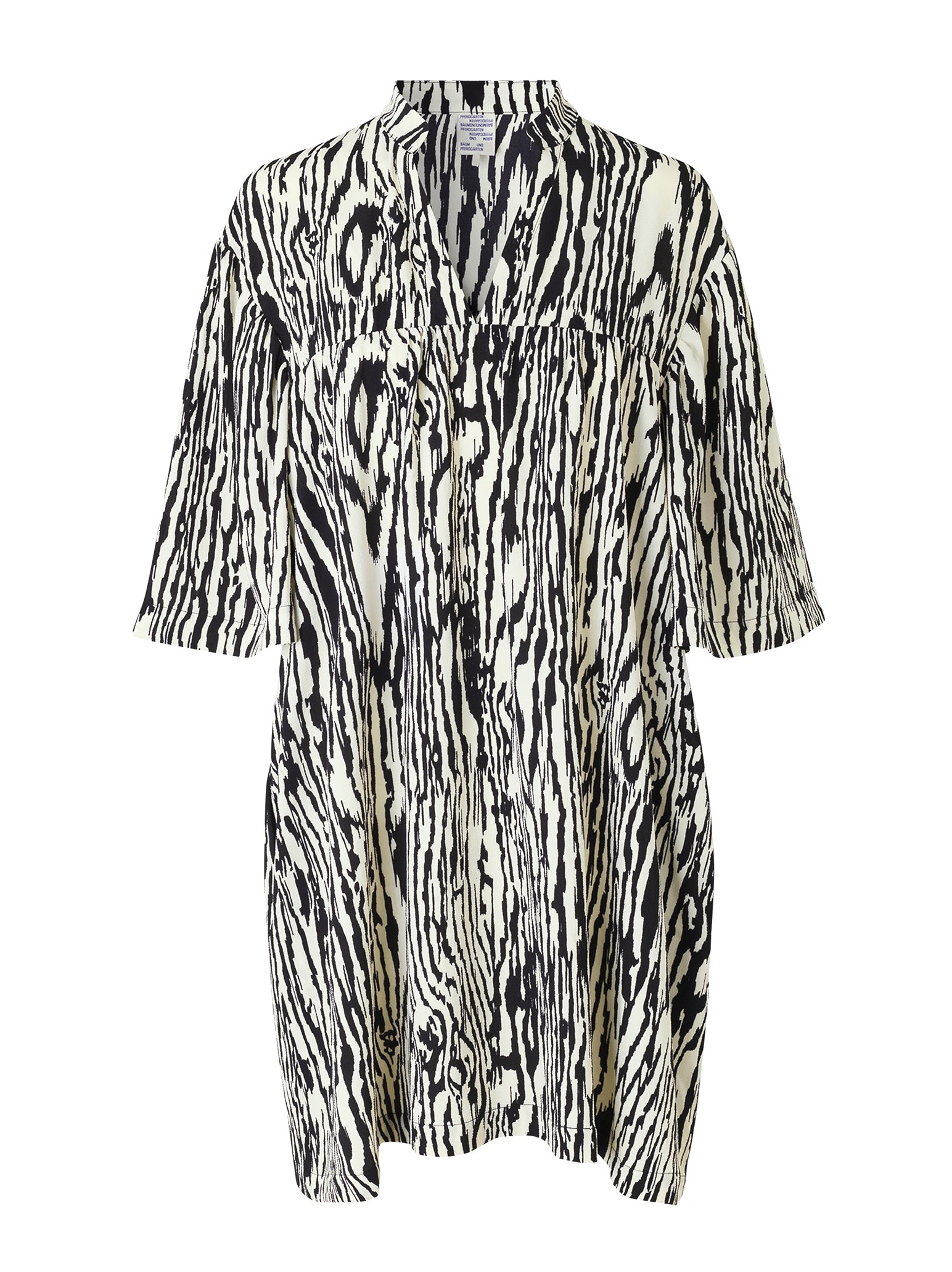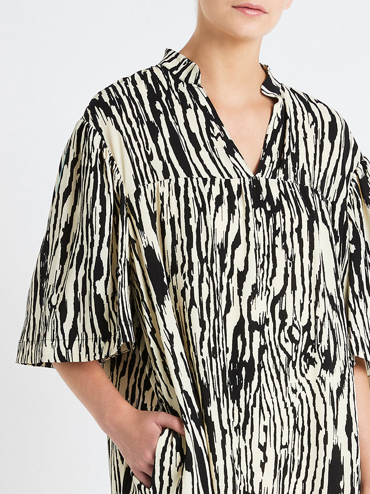 The Baum Und Pferdgarten Apia Dress in Pale Yellow Wood is the perfect addition to your wardrobe this summer. Constructed from a recycled polyester blend this mini dress features an open v neck collar, short sleeves and is finished with a black and beige wood grain print reminiscent of zebra stripes. Team with your favourite black flats for easy summer style.