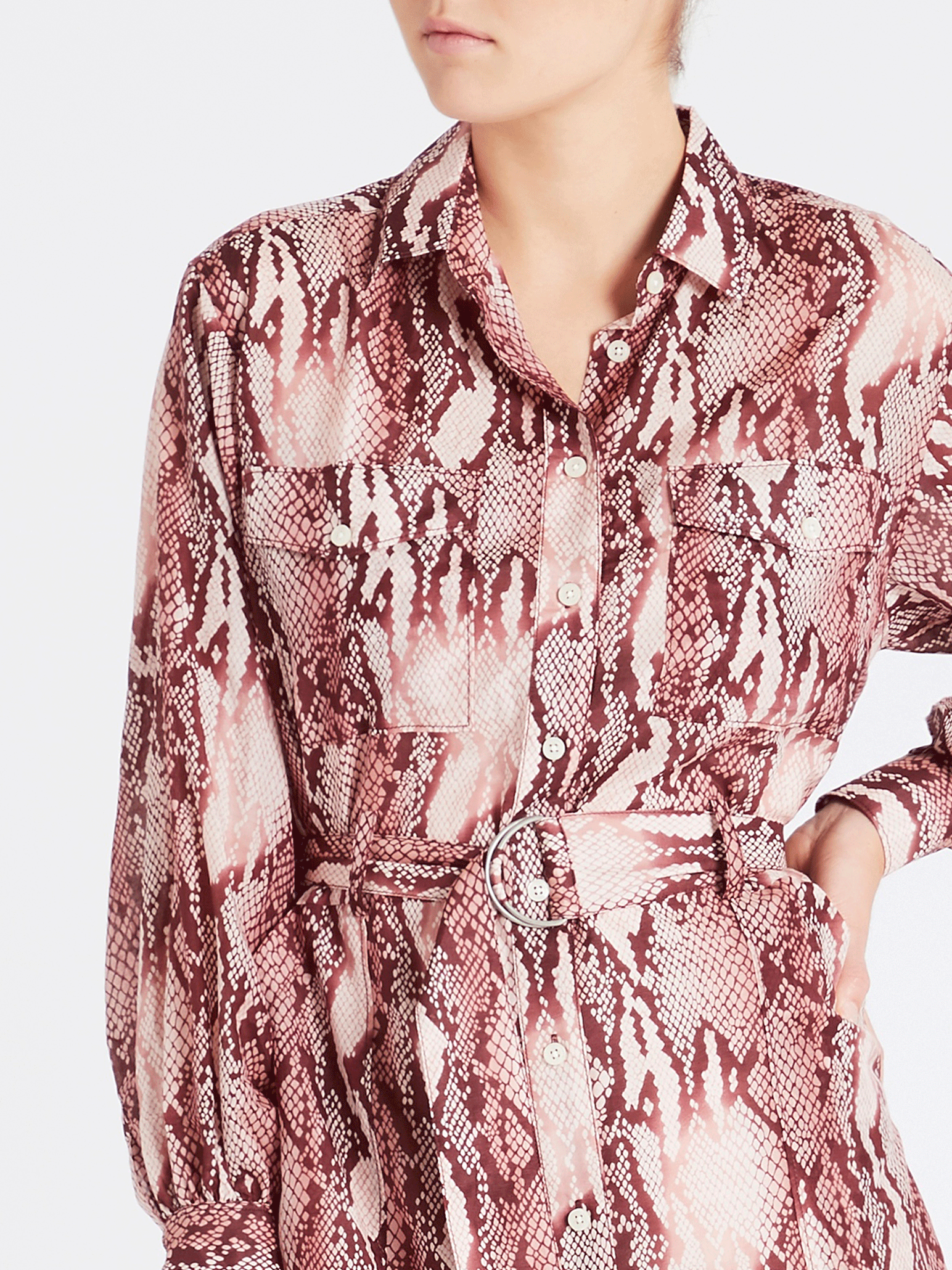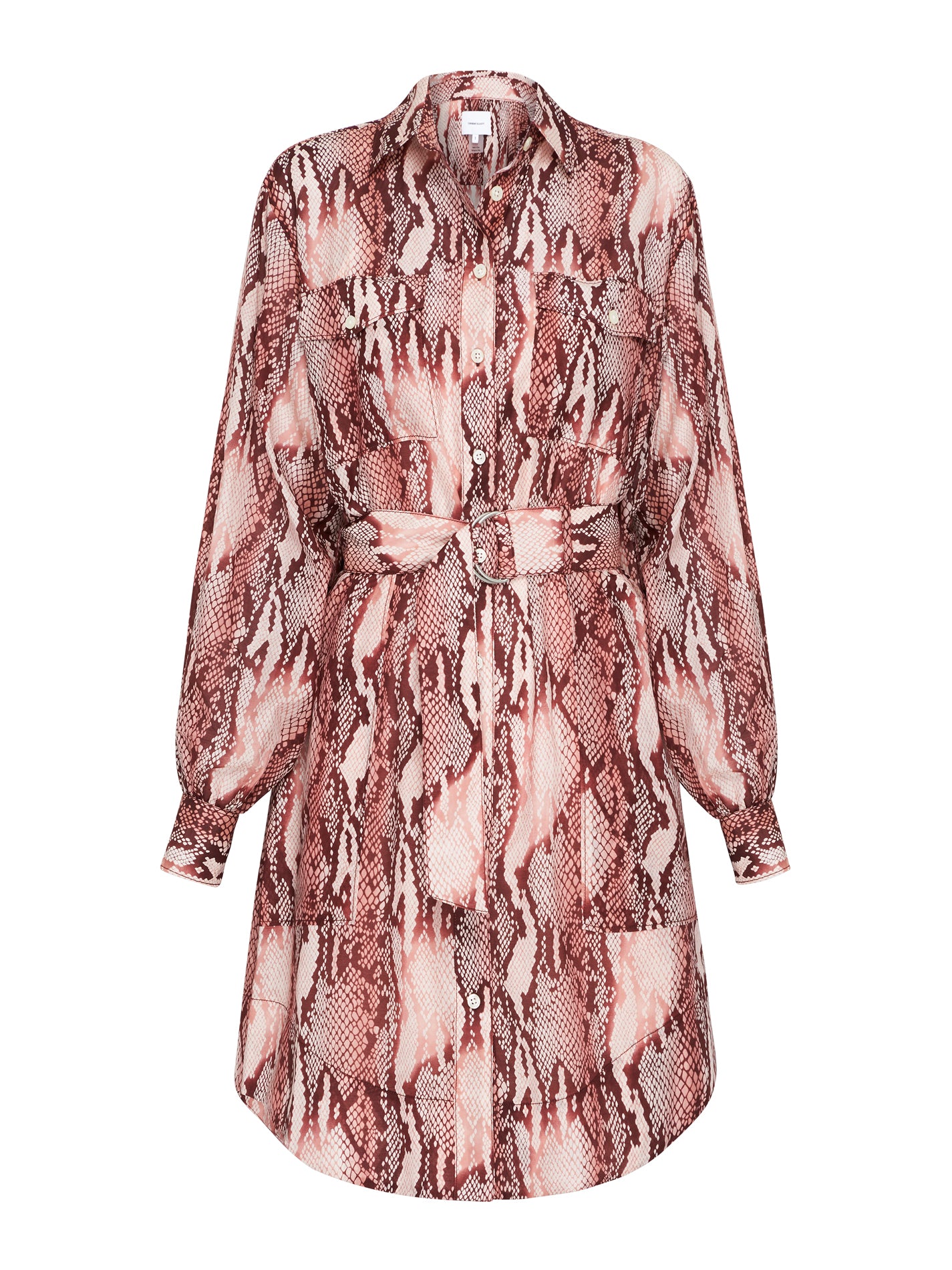 Slither into action with The Carmel Dress in Peach Whip Python by Current Elliott. A modern take on the classic shirt dress, The button down Carmel Dress features a flattering belted waist band, pockets and cuffed sleeves. Constructed from a soft and comfortable silky material, turn heads by pairing the Current Elliott dress with a pair of pumps and hoop earrings.