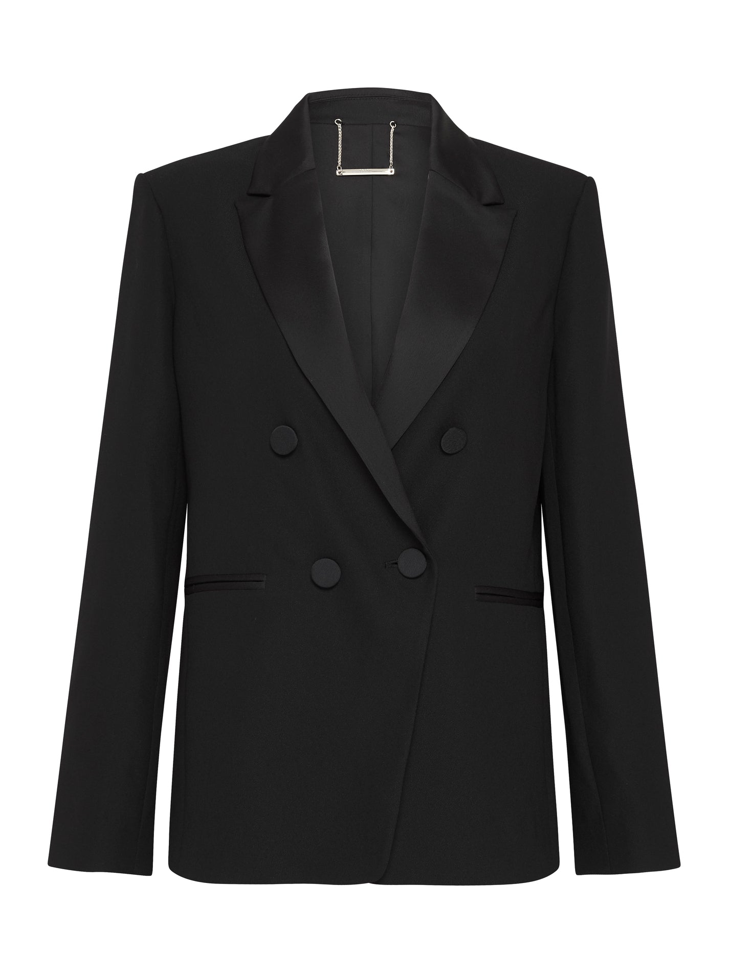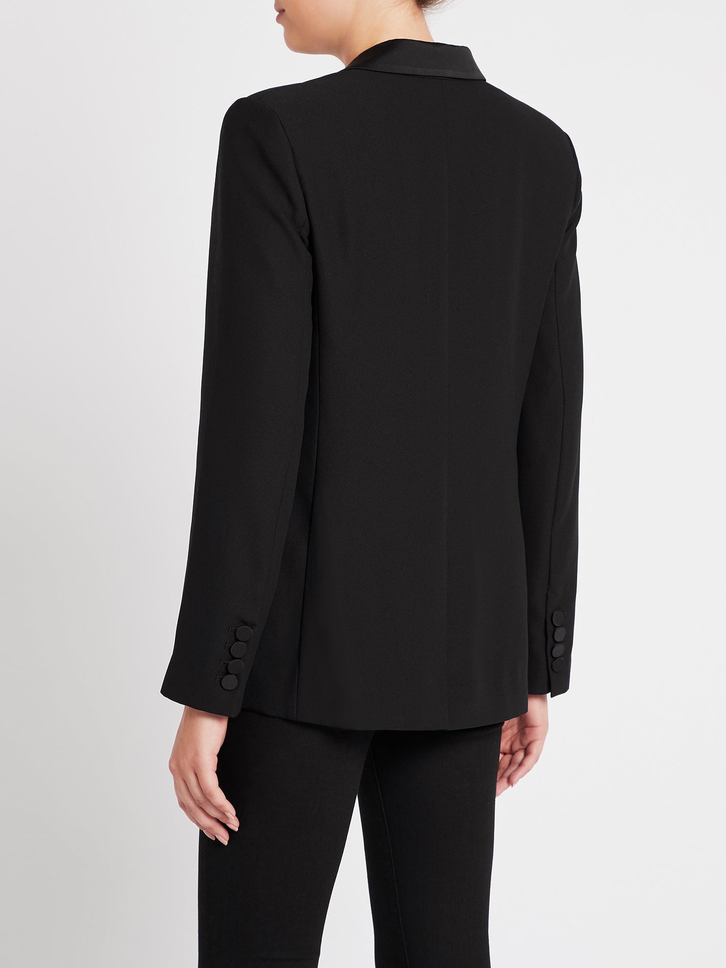 The Frame Denim Tux Satin Blazer in Noir is made from 100% Polyester with a 100% Polyester Lining