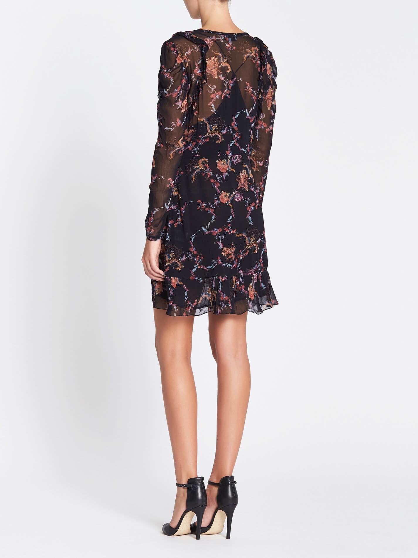 The Loxie Dress by IRO is the perfect blend of feminine charm and modern sophistication. Constructed with sheer long sleeves and a high-low wrap-style skirt, the dress is adorned with delicate frill details that add a touch of whimsy to the overall design.