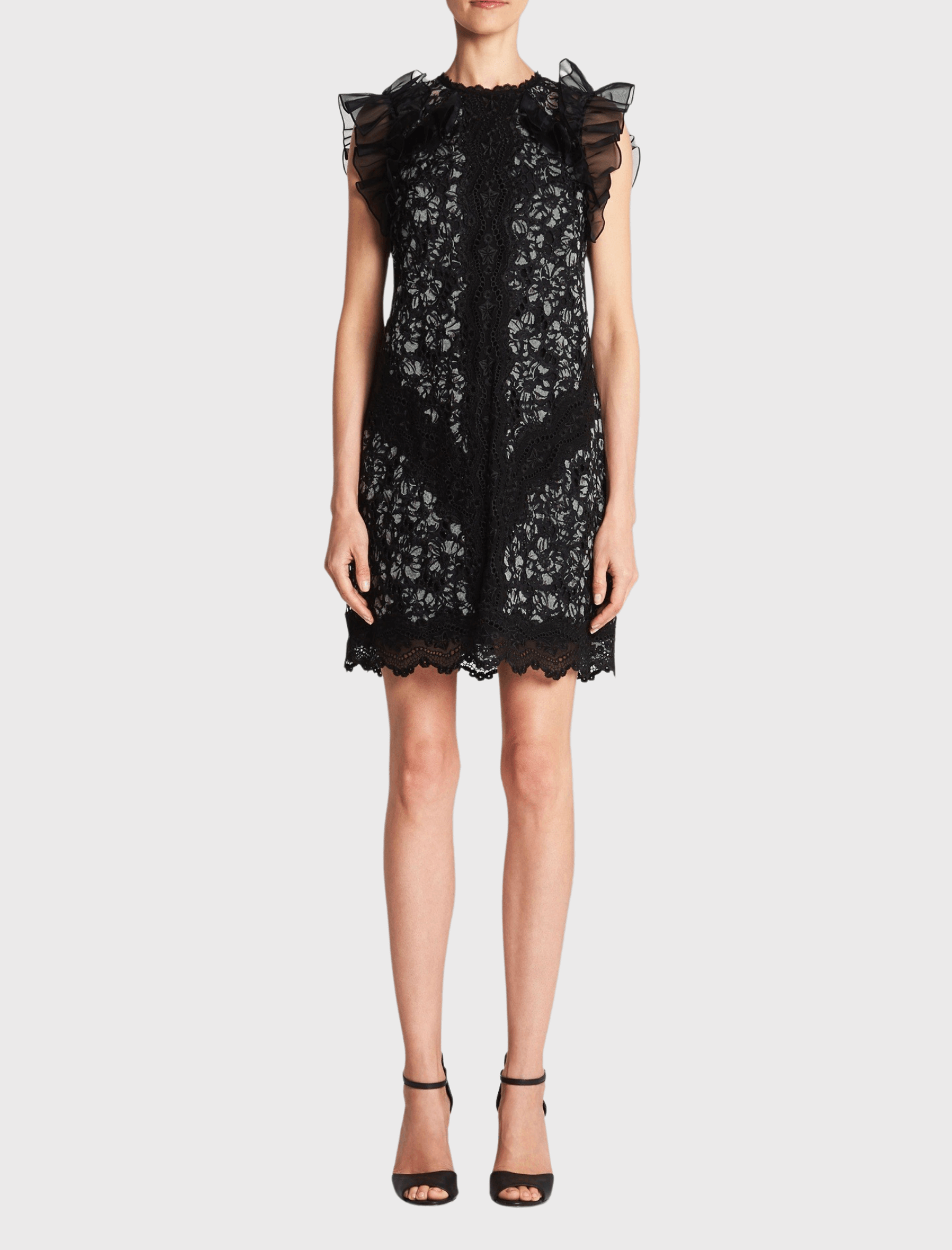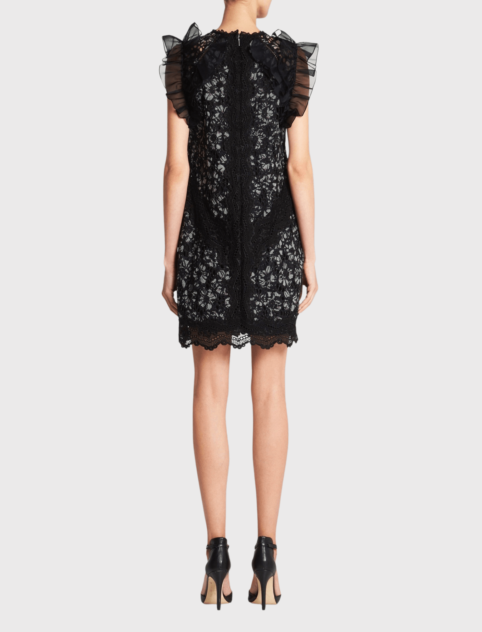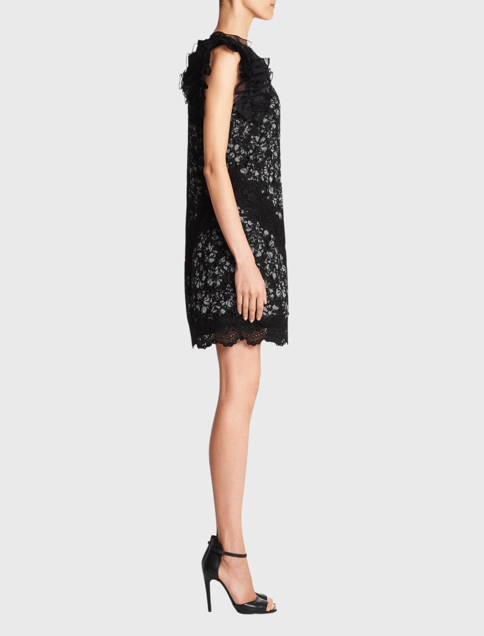 The Rebecca Taylor Sleeveless Mini Floral Embroidery Dress in Black Combo is made from 100% Silk Lining: 100% Polyester 1st Lace: 100% Nylon 2nd Lace: 100% Cotton