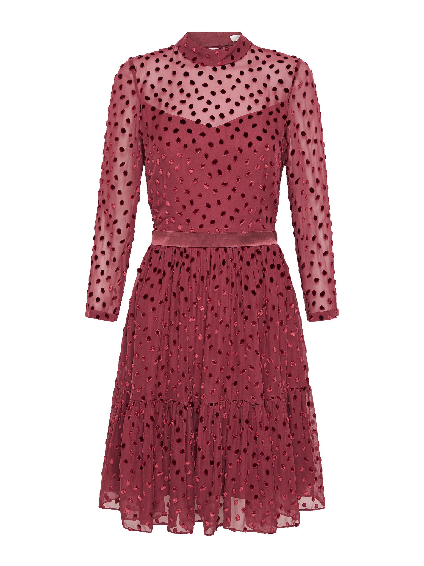 The Rebbeca Talyor Velvet Dot Dress in Wine is made from 58% Silk, 42% Viscose, with a combination fabric of 100% Silk and a 100% Polyester lining
