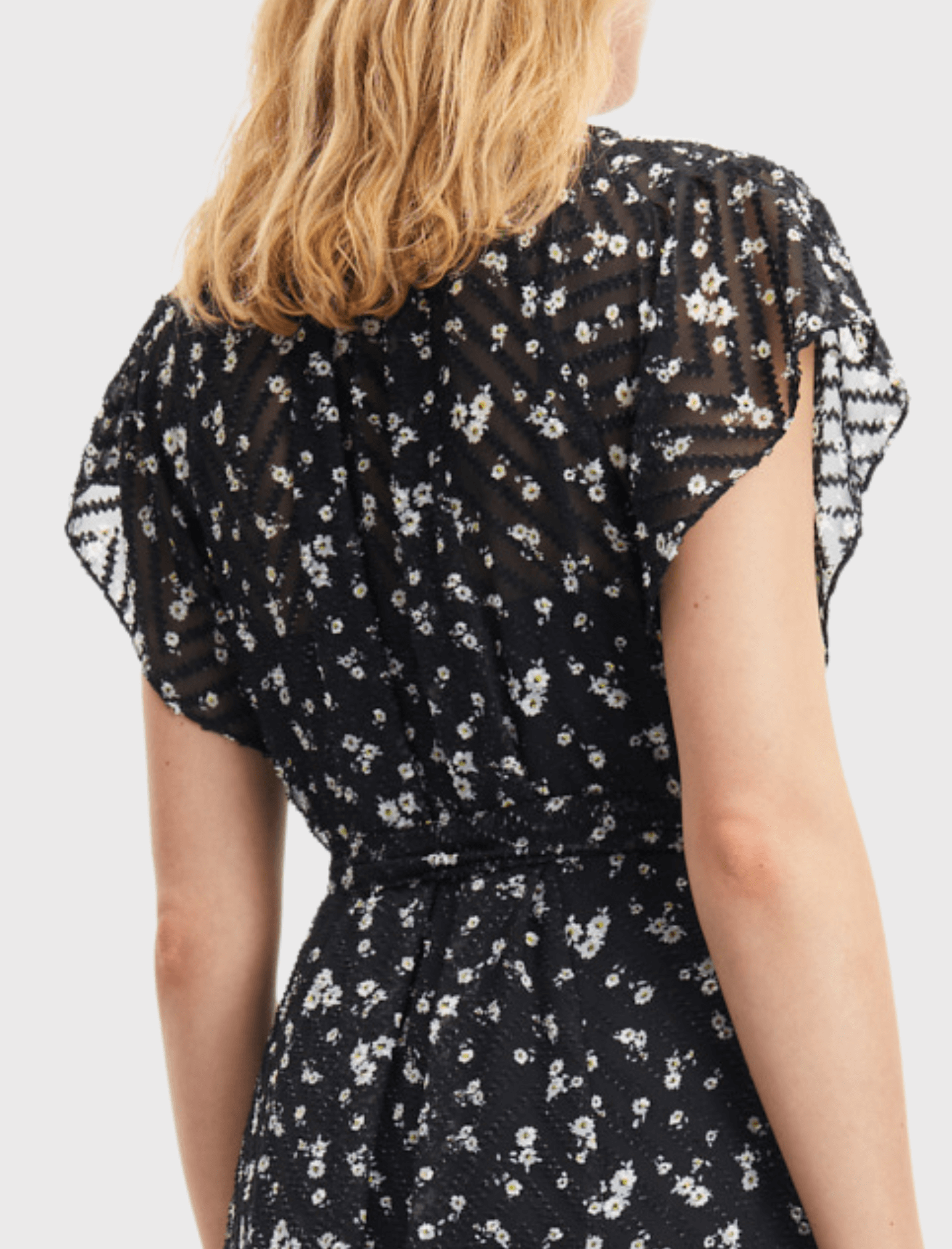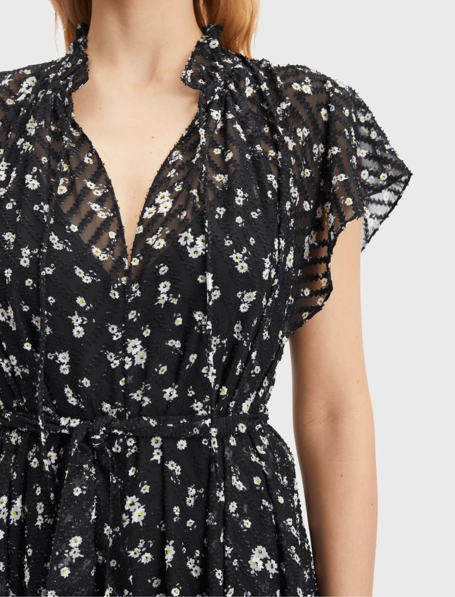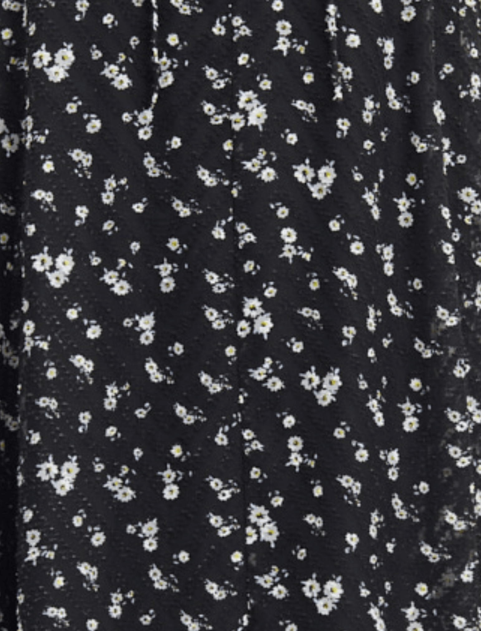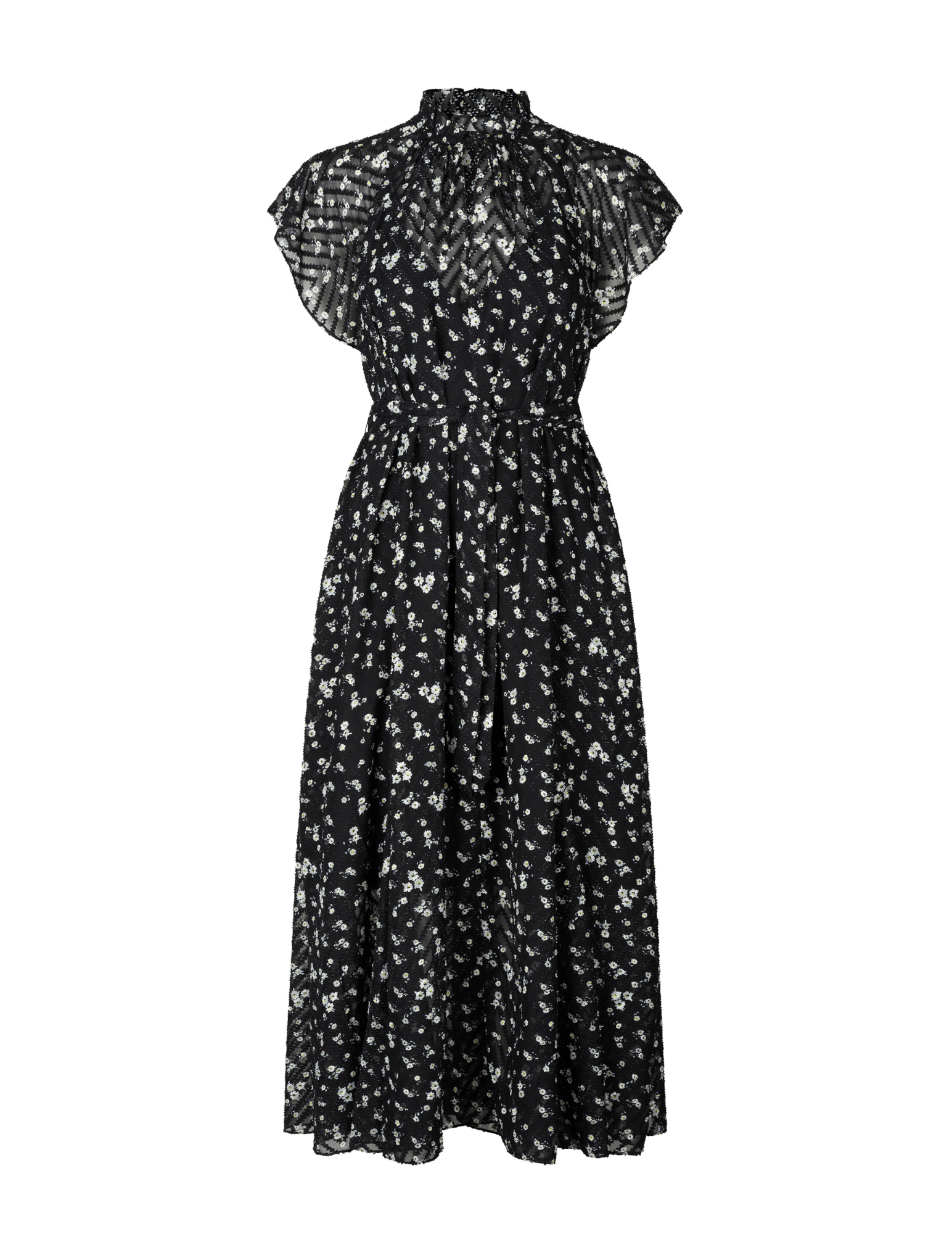 The Karookh Maxi Dress from Samsoe Samsoe is a whimsical summer dress with a edgy vibe. This short sleeved dress is made from a delicate flower embroidered sheer black fabric. It's styled with capped sleeves, a tie up collar with a gathered neckline and a self fabric waistband tie. Dress comes with a slip.