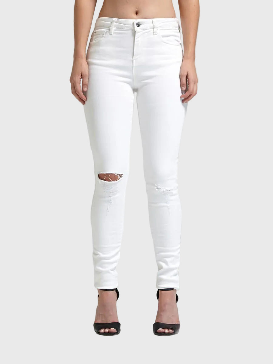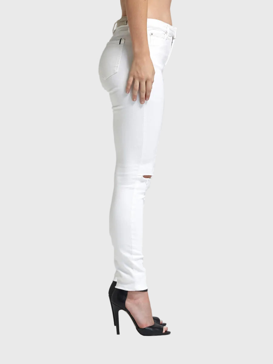Shoot for the stars in the straight legged Moon Jeans by IRO Jeans. Styled with silver hardware, these white denim jeans have a mid rise of 10.5 inches and are detailed with destruction on both knees and a right knee rip.