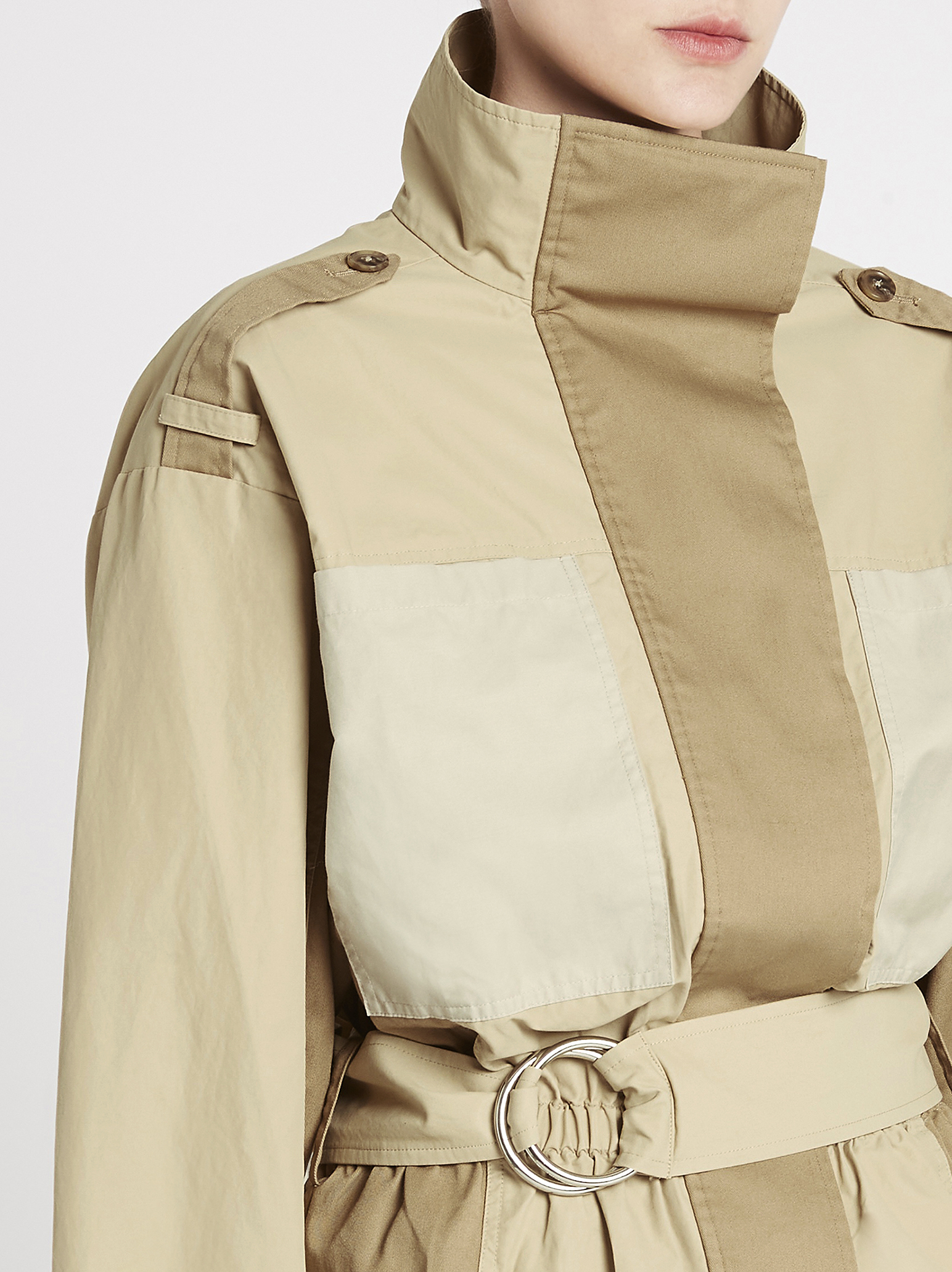 Look no further for a utilitarian inspired look with the Tonal Blocked Jacket in Khaki Multi. Crafted from a cotton blend, this block tonal jacket features a high neckline, an invisible button placket, elasticated lower waistline and is finished with duel breast front pockets and a self tie belt creating a cinched in silhouette. Layer over a simple tee and jeans for a weekend ready look.