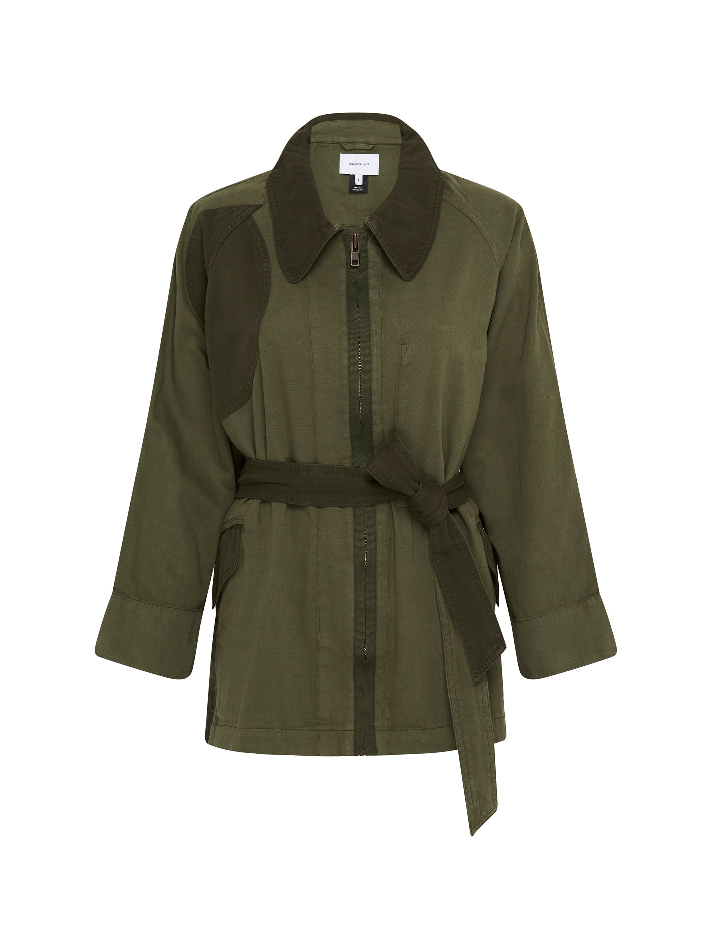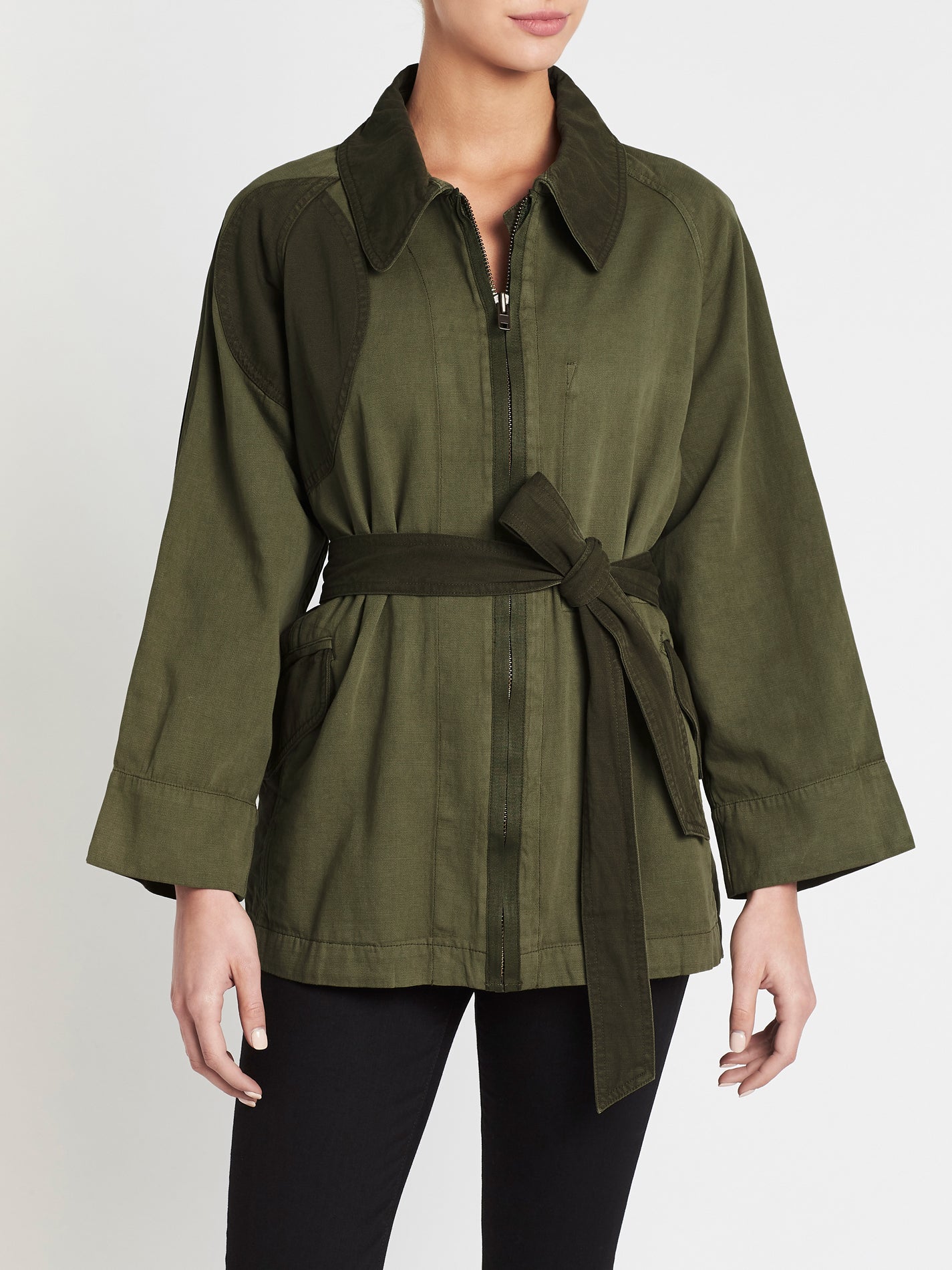 The Relaxed Military Jacket in Army Green by Current Elliott was inspired by vintage military wear. This feminine cool jacket is constructed in a durable cotton linen blend and features a flattering waist tie, kimono sleeves and duel waist side pockets. Finished with a patch paneling detailing and front metal hardware zip closure. Team yours with your favourite denim for an ultra cool re-work of a must have classic.