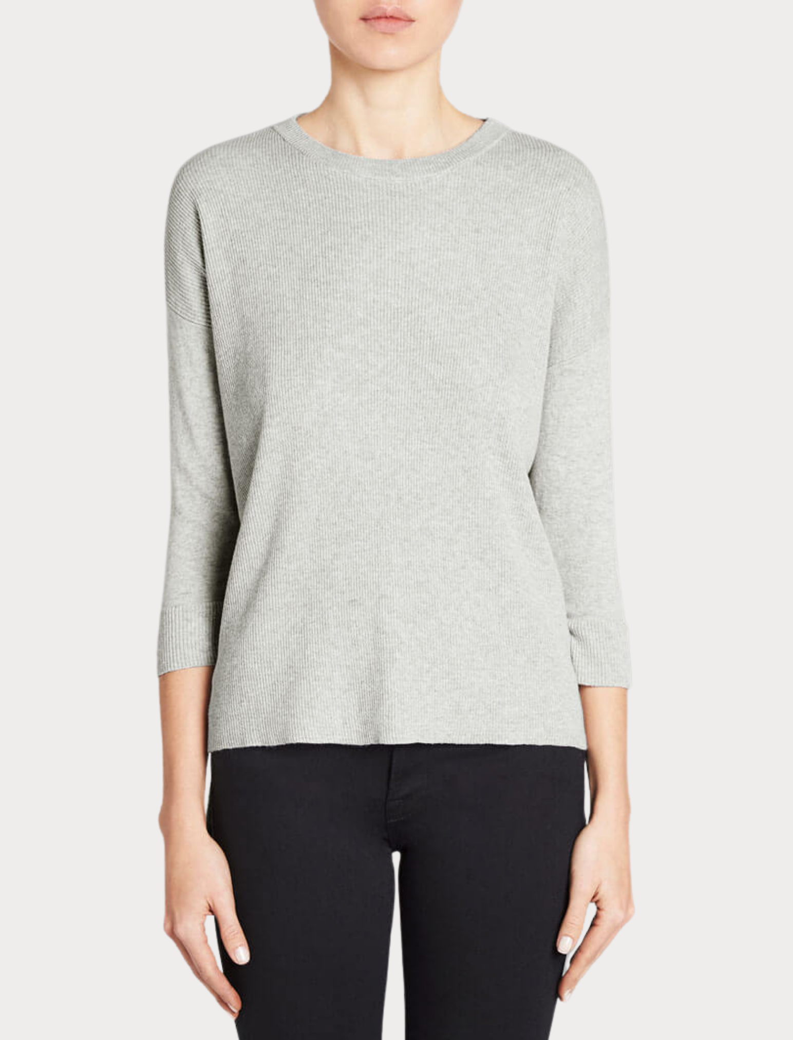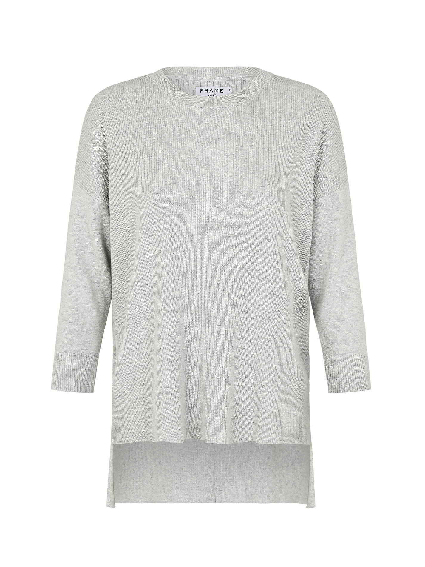 The Le Boxy Sweater in Foggy from Frame Denim is made from a light grey soft ribbed fine knit. Featuring a crew neck, 3/4 length sleeves and a hi lo hem, this style is a slouchy silhouette with dropped shoulder seams and split side detail.