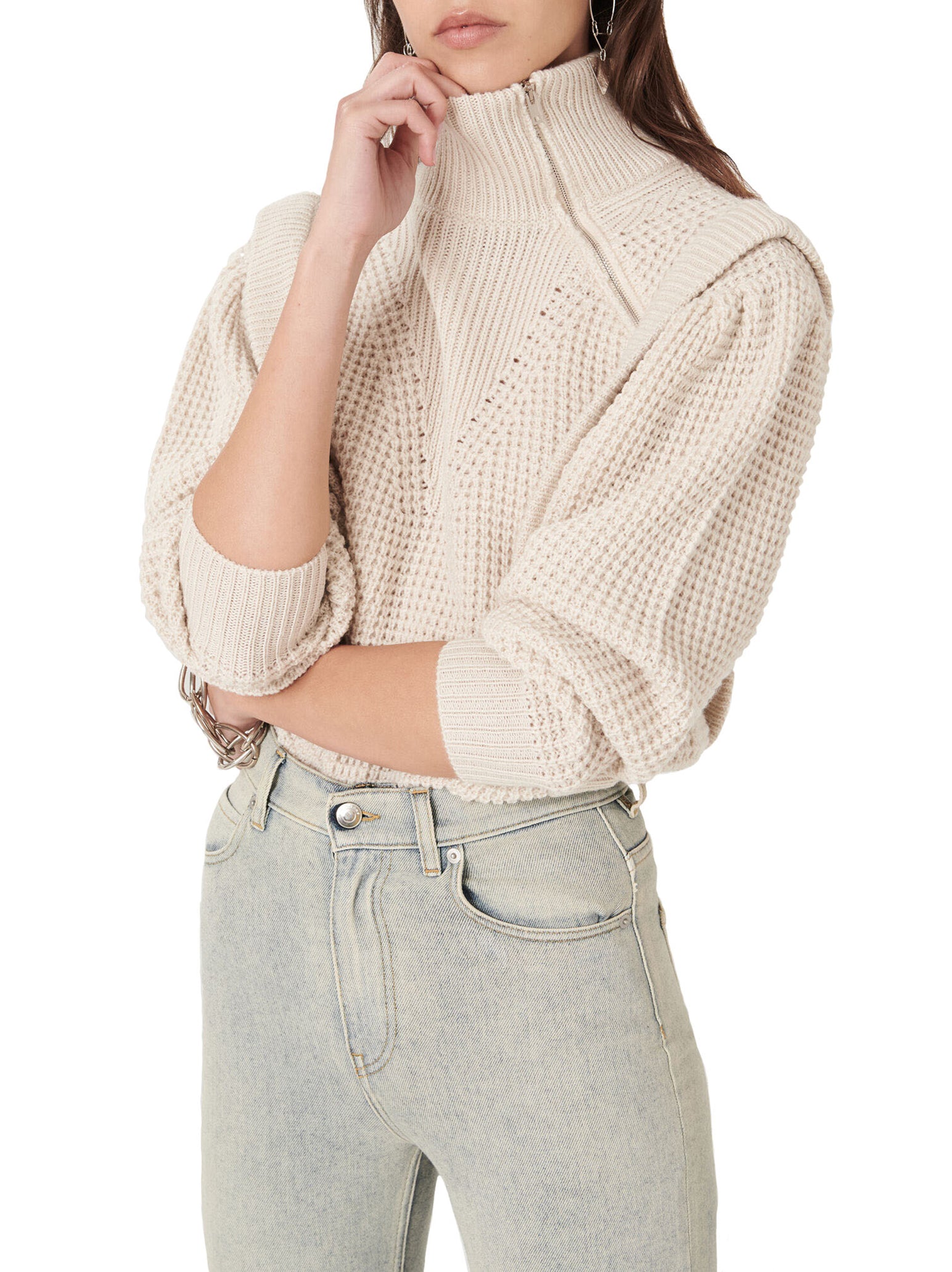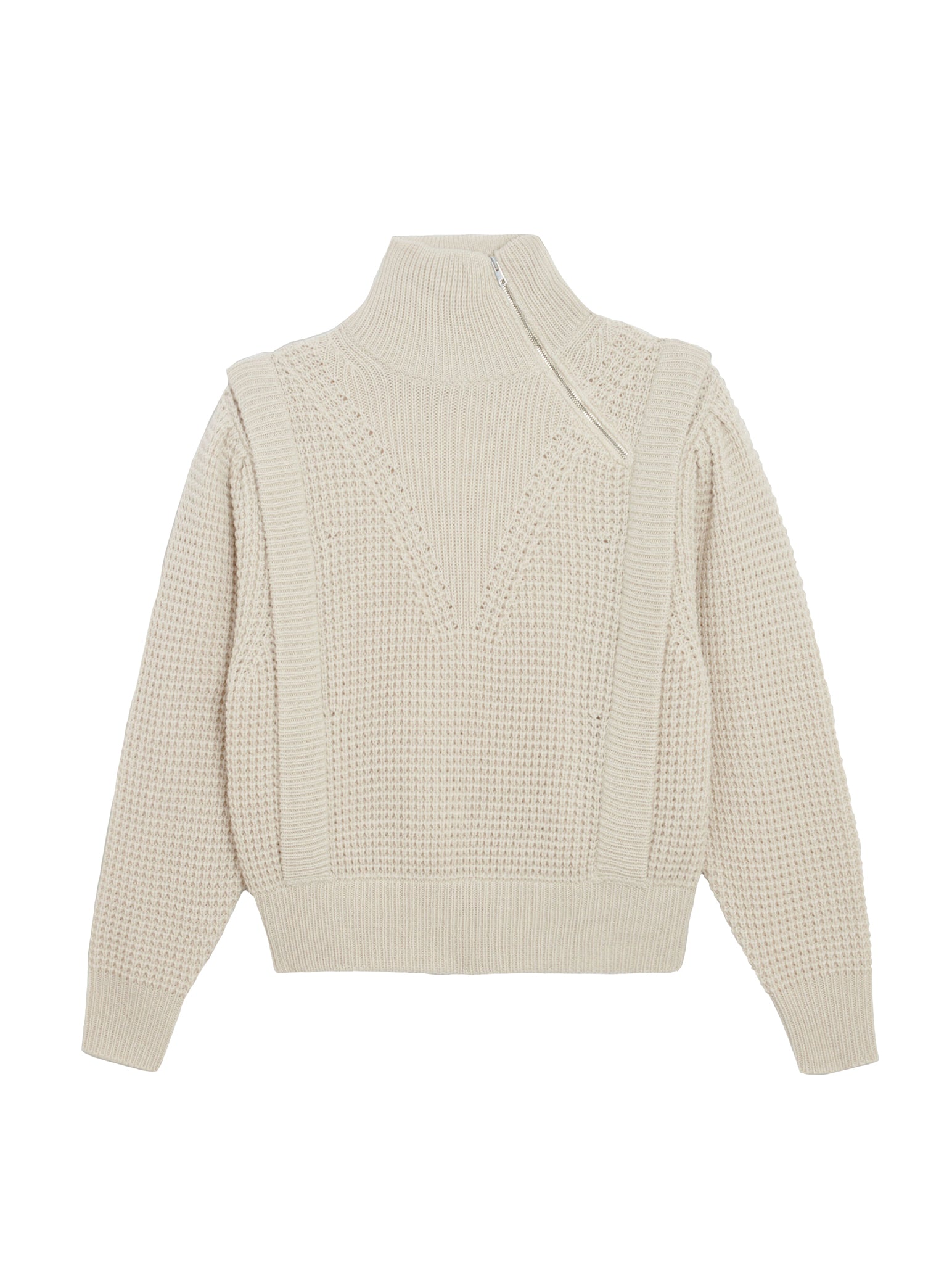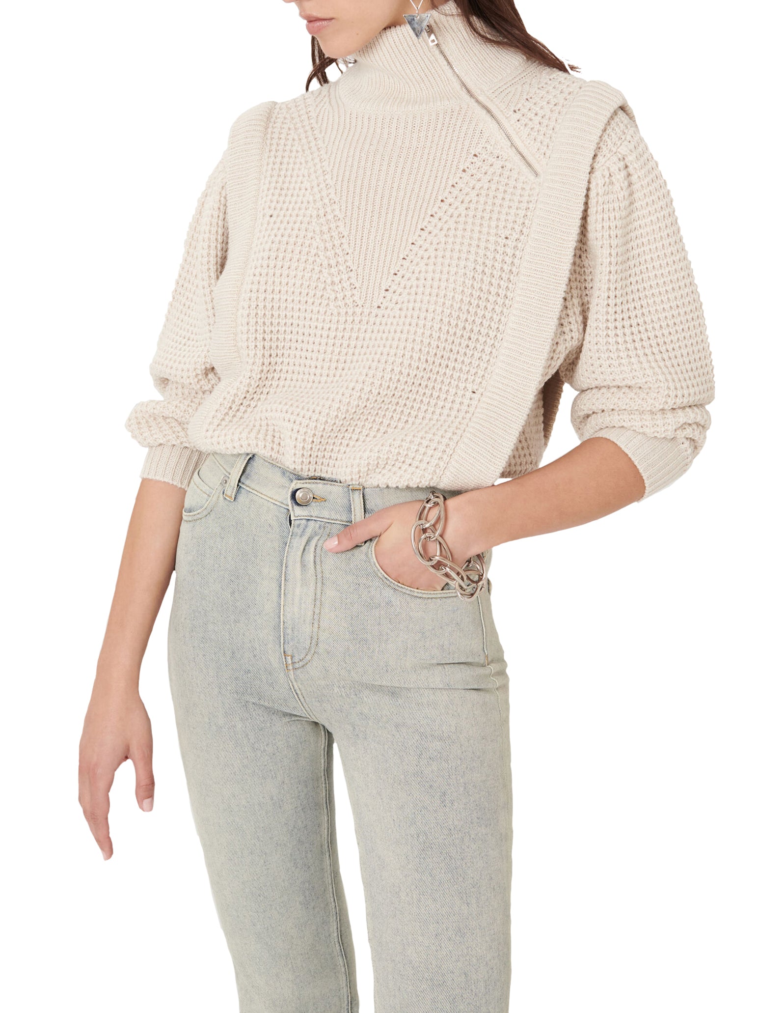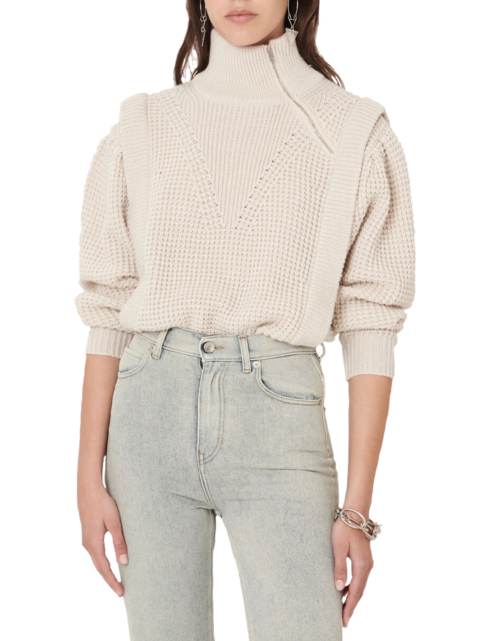 The IRO Macky Sweater in Cream is a dreamy wardrobe addition. Beautifully constructed in a waffle texture with a high neckline with asymmetrical zip closure, ribbed trims and statement shoulders. Perfect paired with some tight leather leggings or your fave distressed boyfriend jeans.