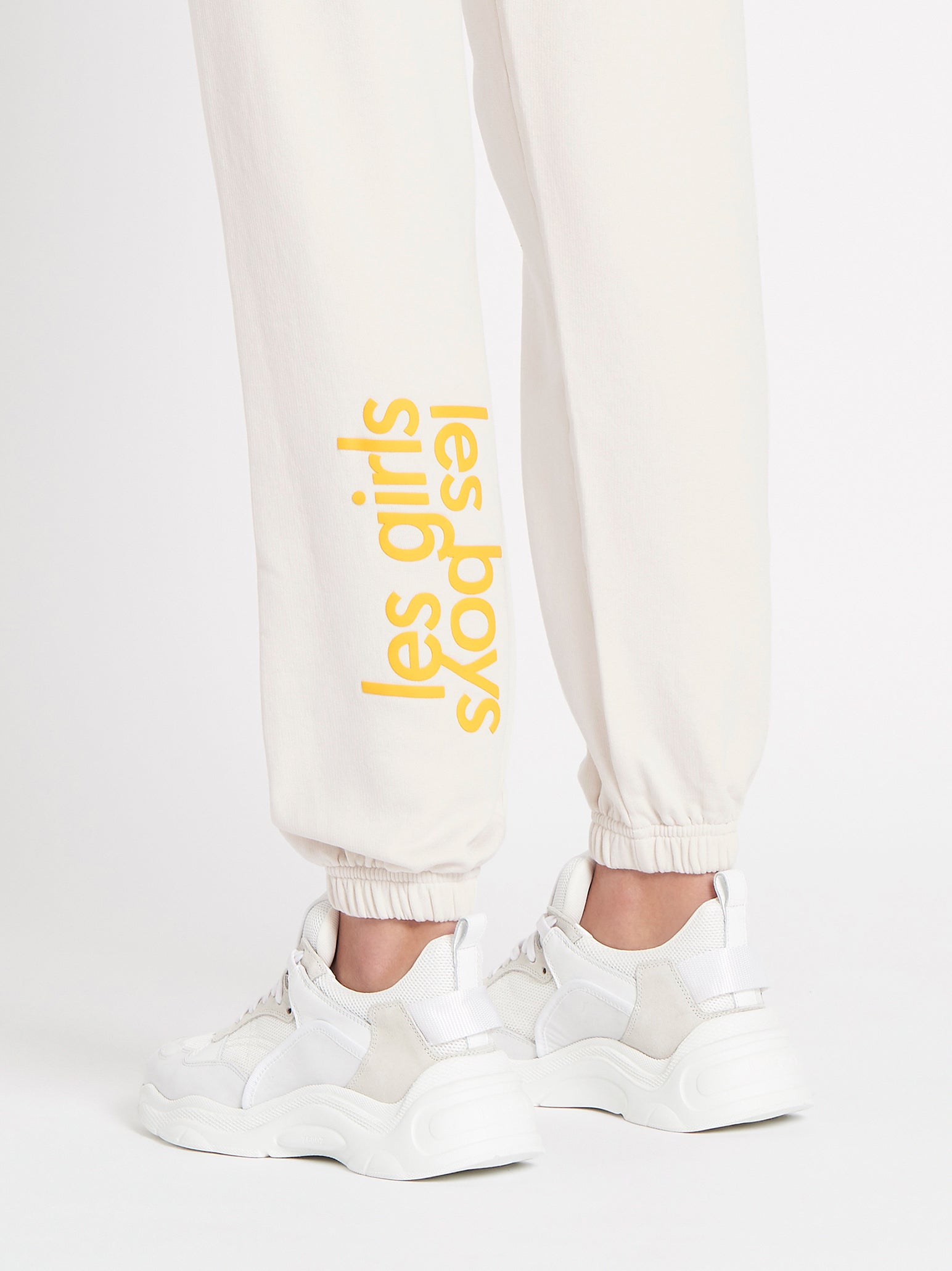 These loopback Les Girls Les Boys Regular Track Pant in soft Vaporous Grey are made from 100% Organic Cotton. Much loved by fashion editors the world over they feature twin zip details across the front hip, a bright rubberised sunshine yellow coloured logo print with a comfortable elasticated waistband and cuffed leg. Pair back with the Les Girls Les Boys Crew Neck Sweatshirt in Vaporous Grey and live your most comfy and fabulous life.