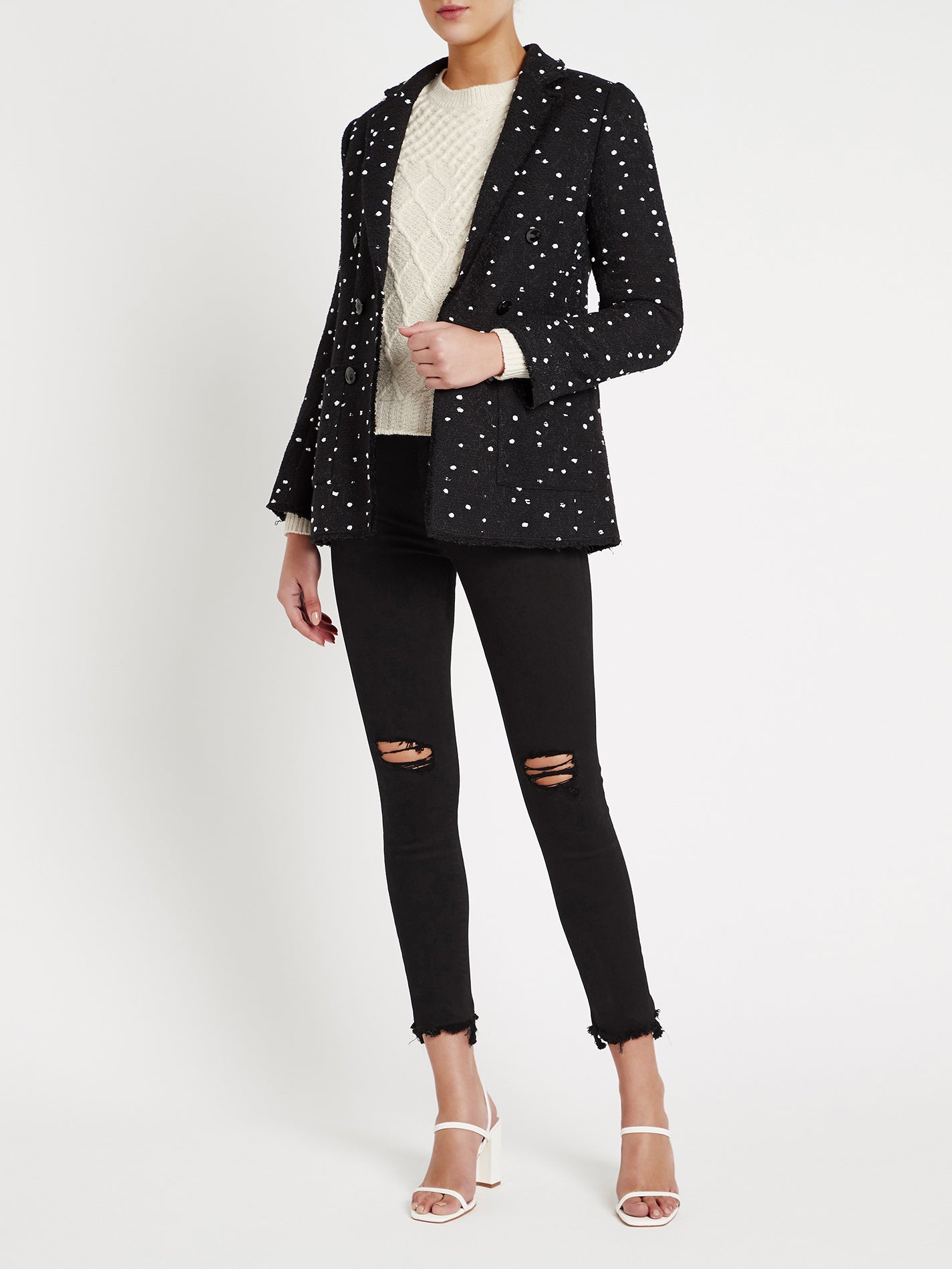 Looking to add fashion sensibility to refresh a wardrobe staple, look no further with the Boucle Dot Tweed Blazer in Black Combo by Rebecca Taylor. Crafted in a tweed polyester blend, this timeless blazer features a double breasted button placket, duel front side pockets and is finished with white woven dots designed to give a modern twist. Pair back with your favourite denim and boots for an effortless polished look.