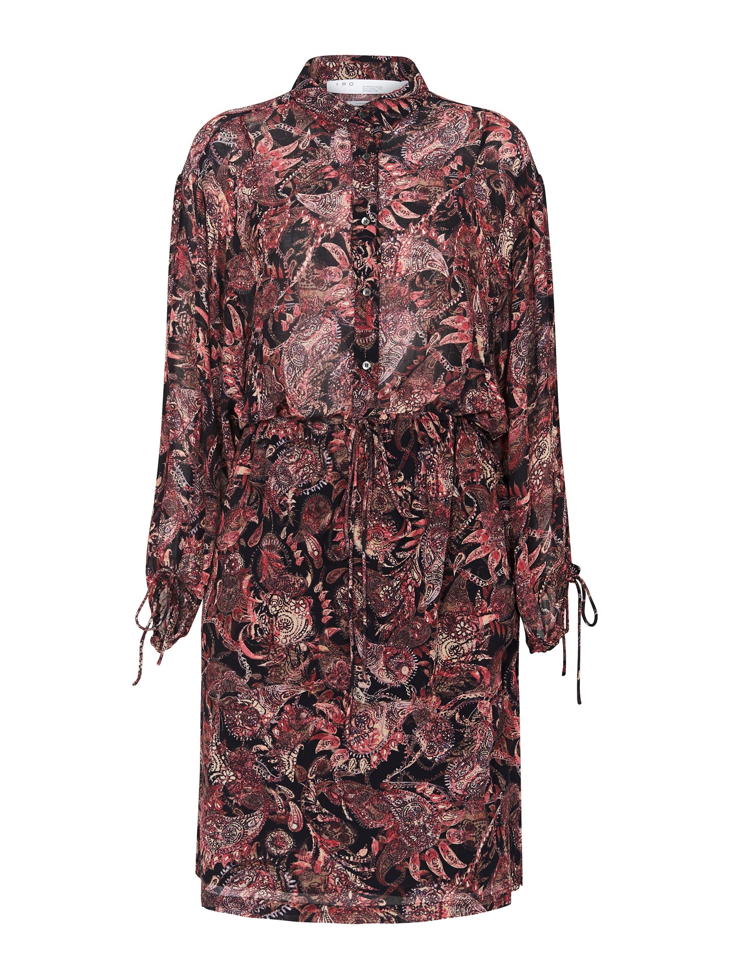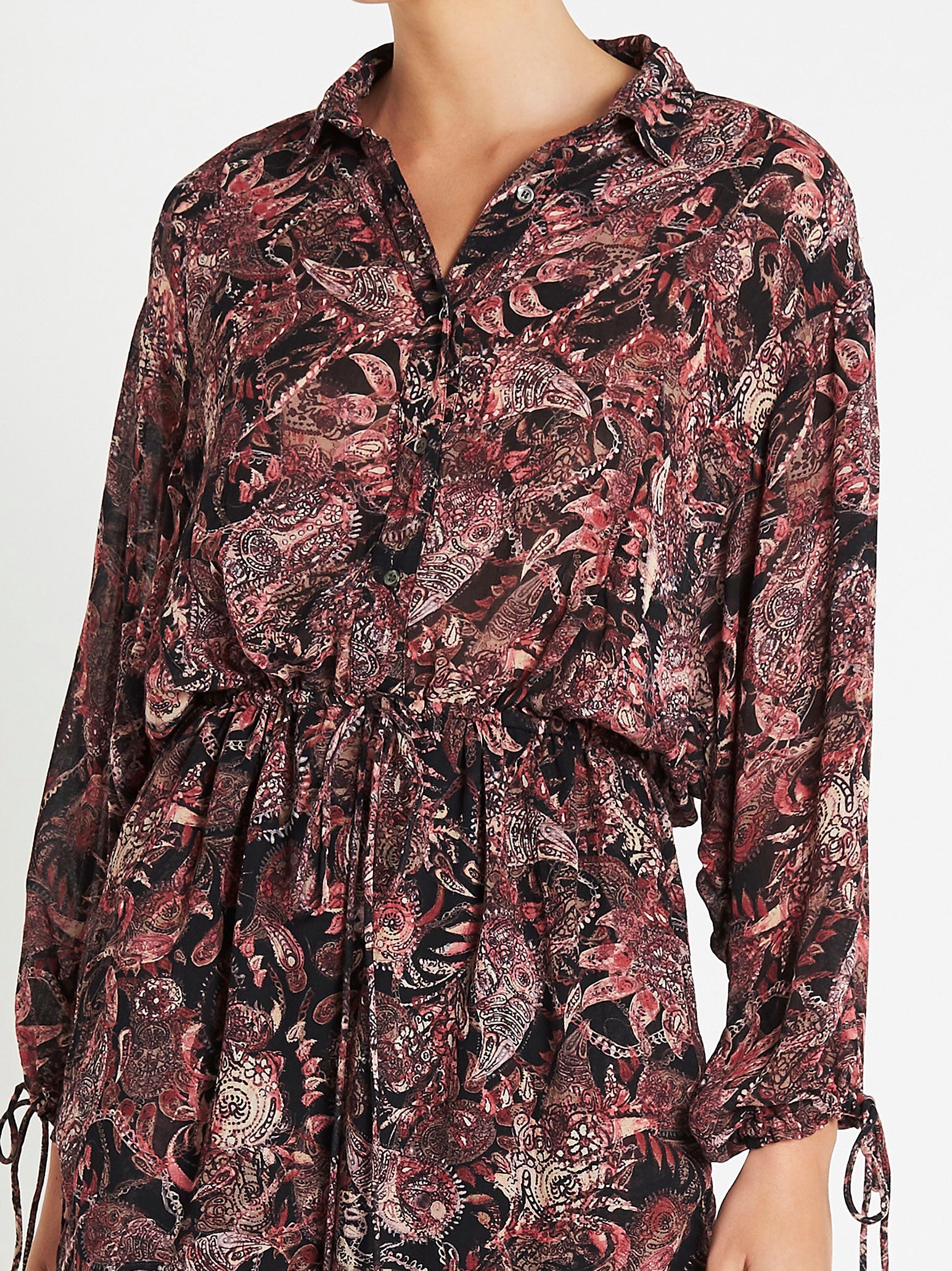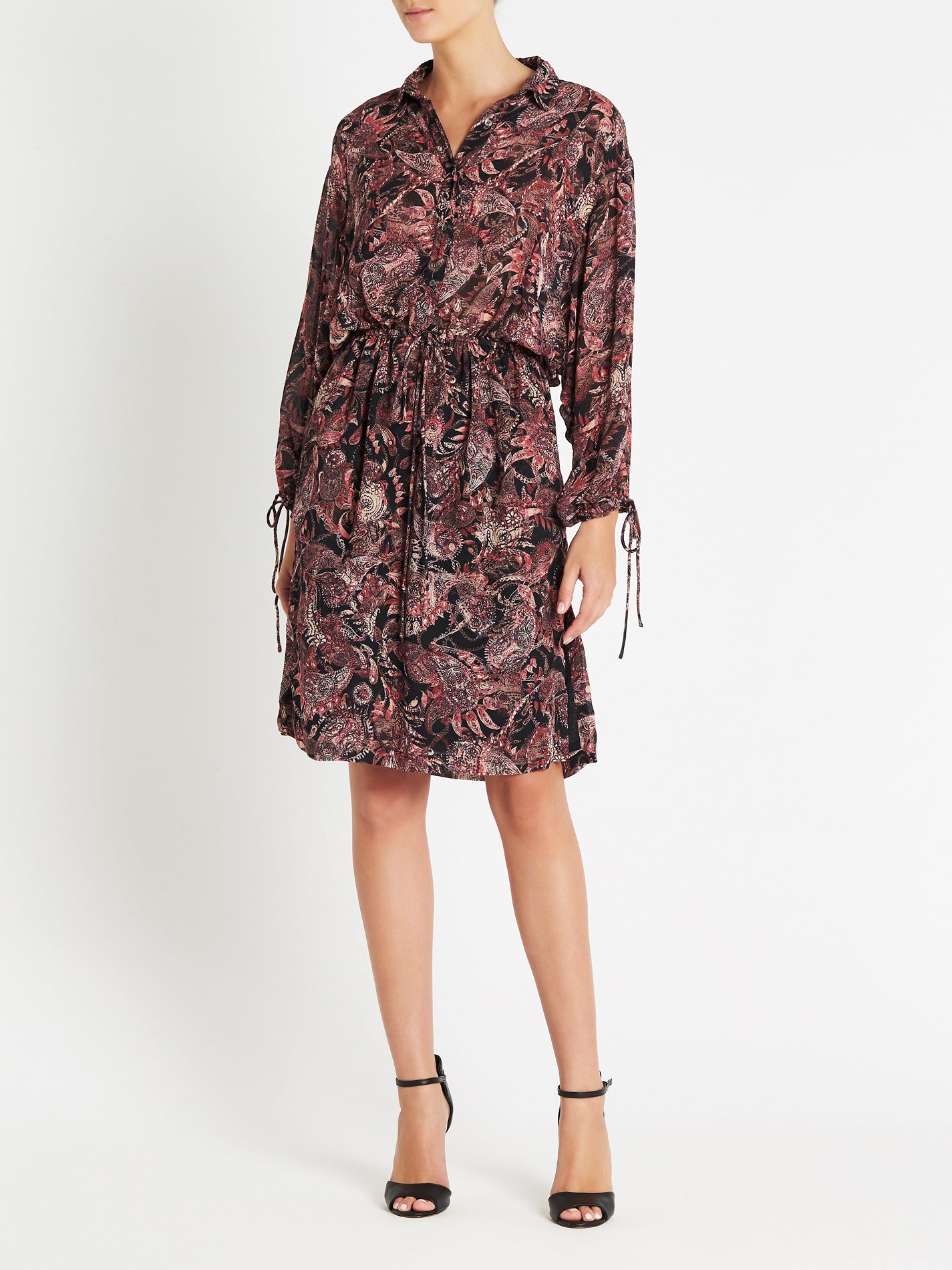 Step out in elegance with the timeless silhouette and glamorous print of the IRO midi Placid Dress. Featuring a waist and sleeve draw and tie, side split and button up front, this dress is a classic chic style that would pair perfectly with slides and a leather bag.