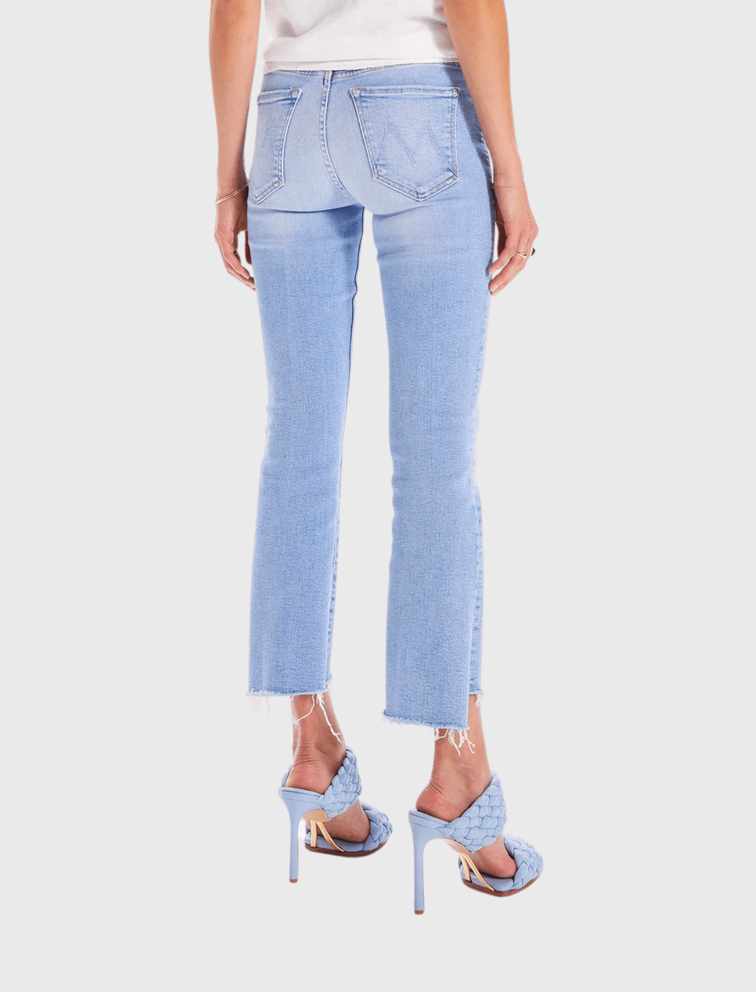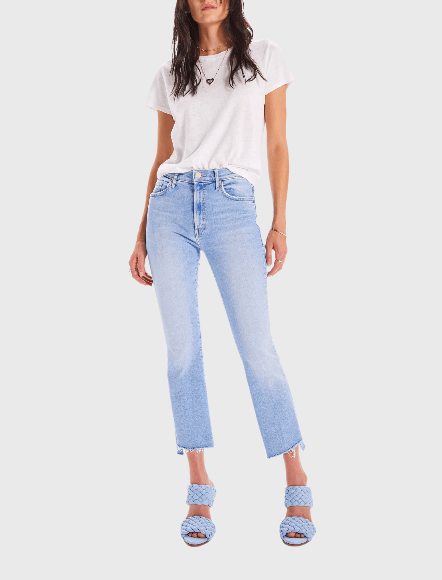 One of One, Number One, Only - UNIQUE. The Mother Denim Insider Crop Step Fray Jean in Limited Edition is a high-waisted bootcut with an ankle crop and a frayed step-hem. Cut from stretch denim, Limited Edition is a bright light blue wash with whiskering and fading throughout. Category? Bad Bitch.