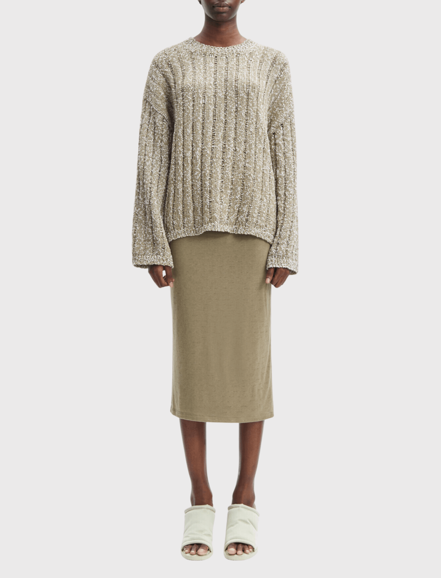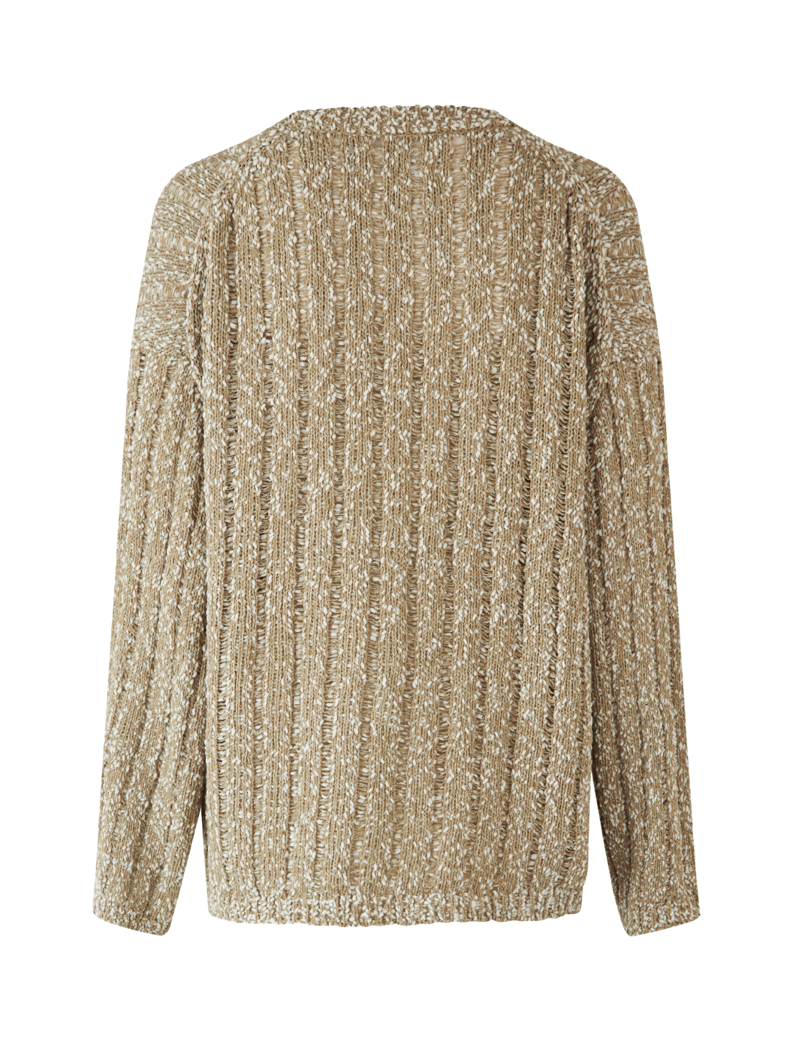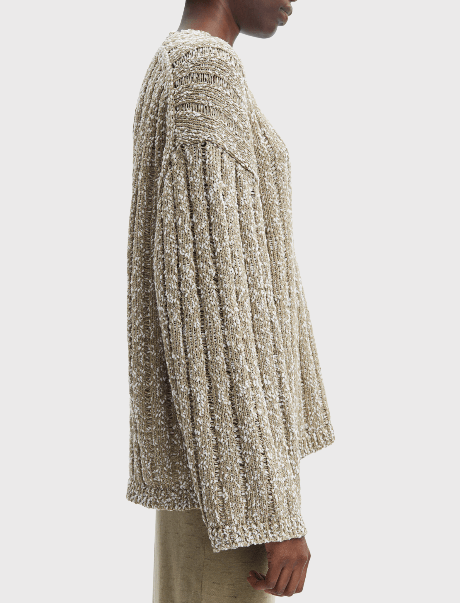 The ladder stitch pattern and rib trims add subtle detailing to this chunky knit, which is crafted from a slub textured yarn blend of cotton and recycled polyester, making it both cozy and eco-friendly.