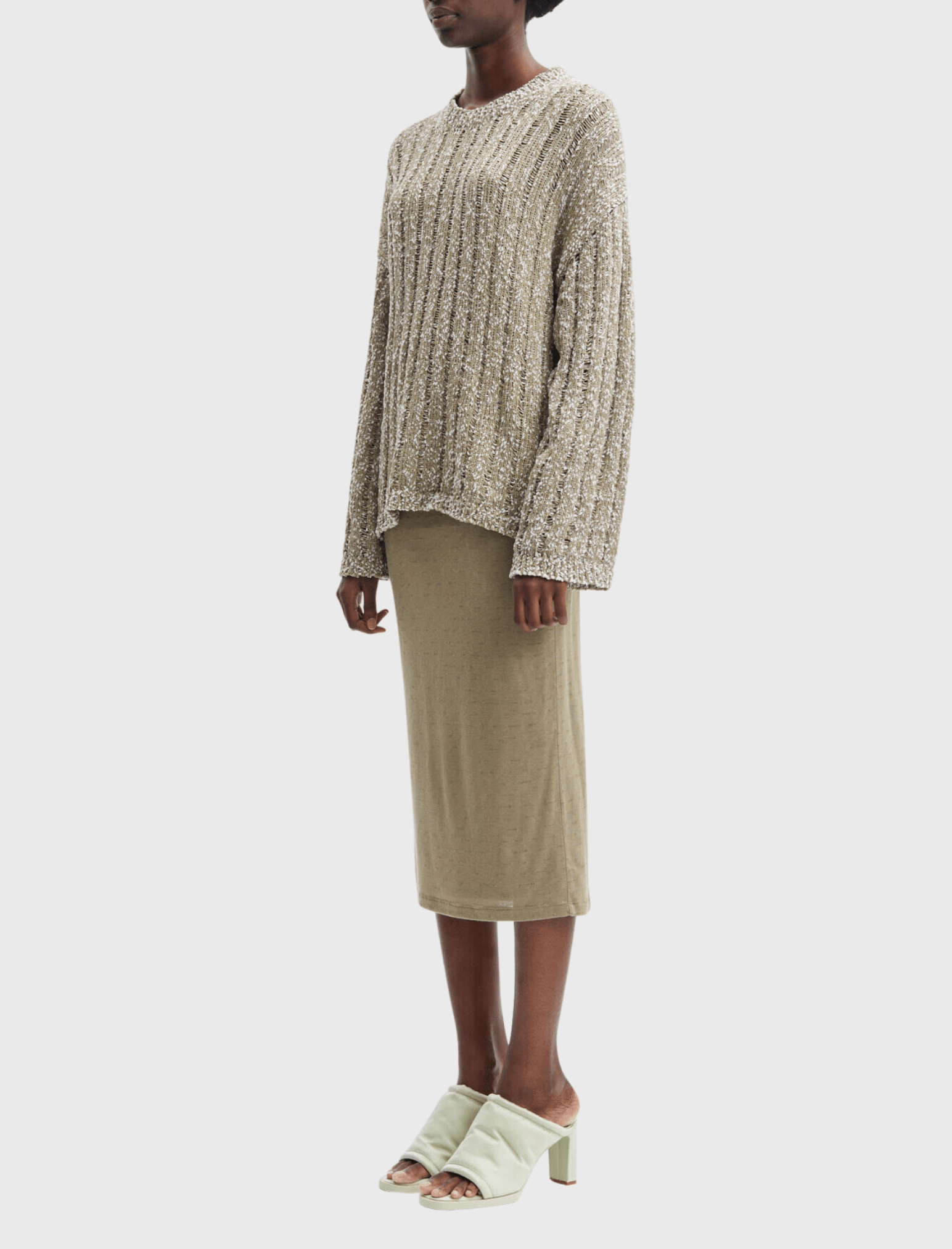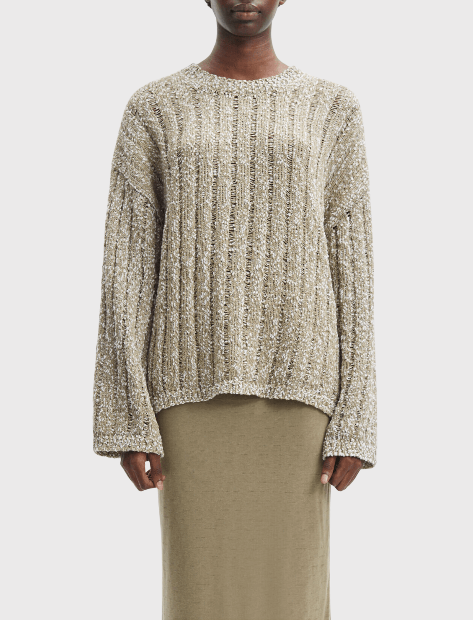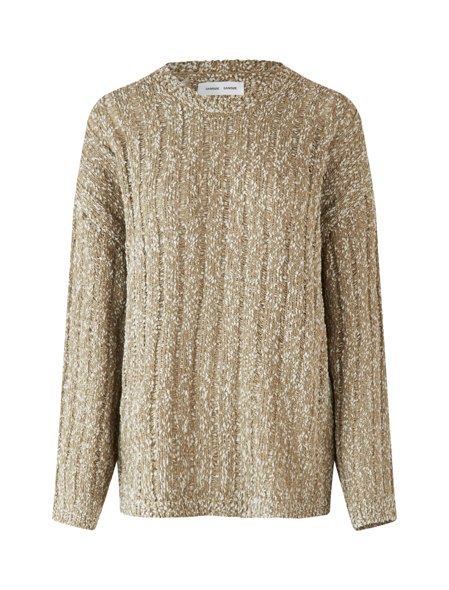 The Samsoe Samsoe Julia Crew Neck Knit Sweater in Silver Sage, a slubby white and taupe dream come true. This boxy fit jumper is all about that casual-cool vibe with dropped shoulders and long sleeves, making it your go-to for effortless style.