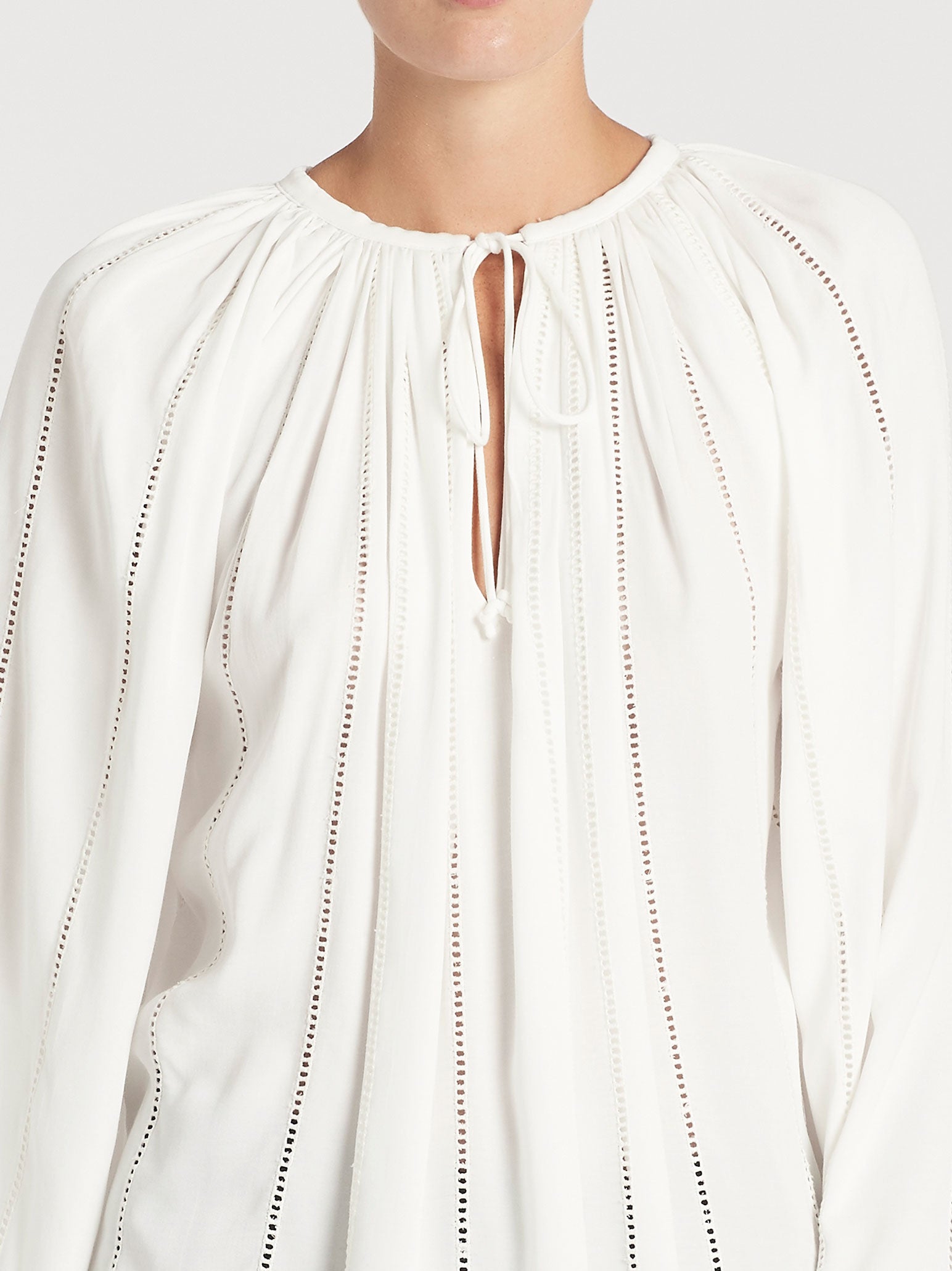 Easy and breezy, the Frame Denim Lattice Peasant Top in Off White is the perfect addition to any wardrobe. Constructed from a lightweight viscose this flowy top features a rounded neckline with a self tie gathered finish, a wide set raglan sleeve and perforated lattice detailing.
