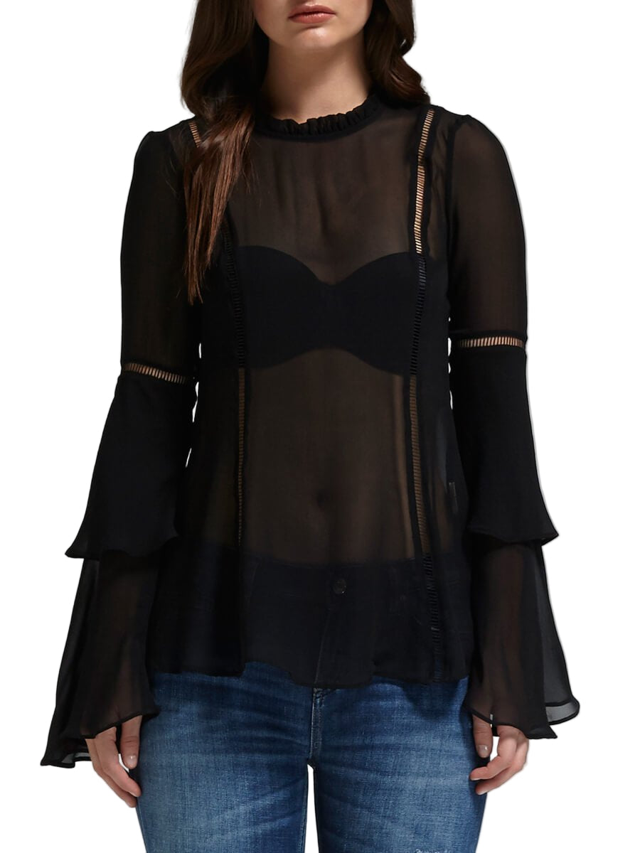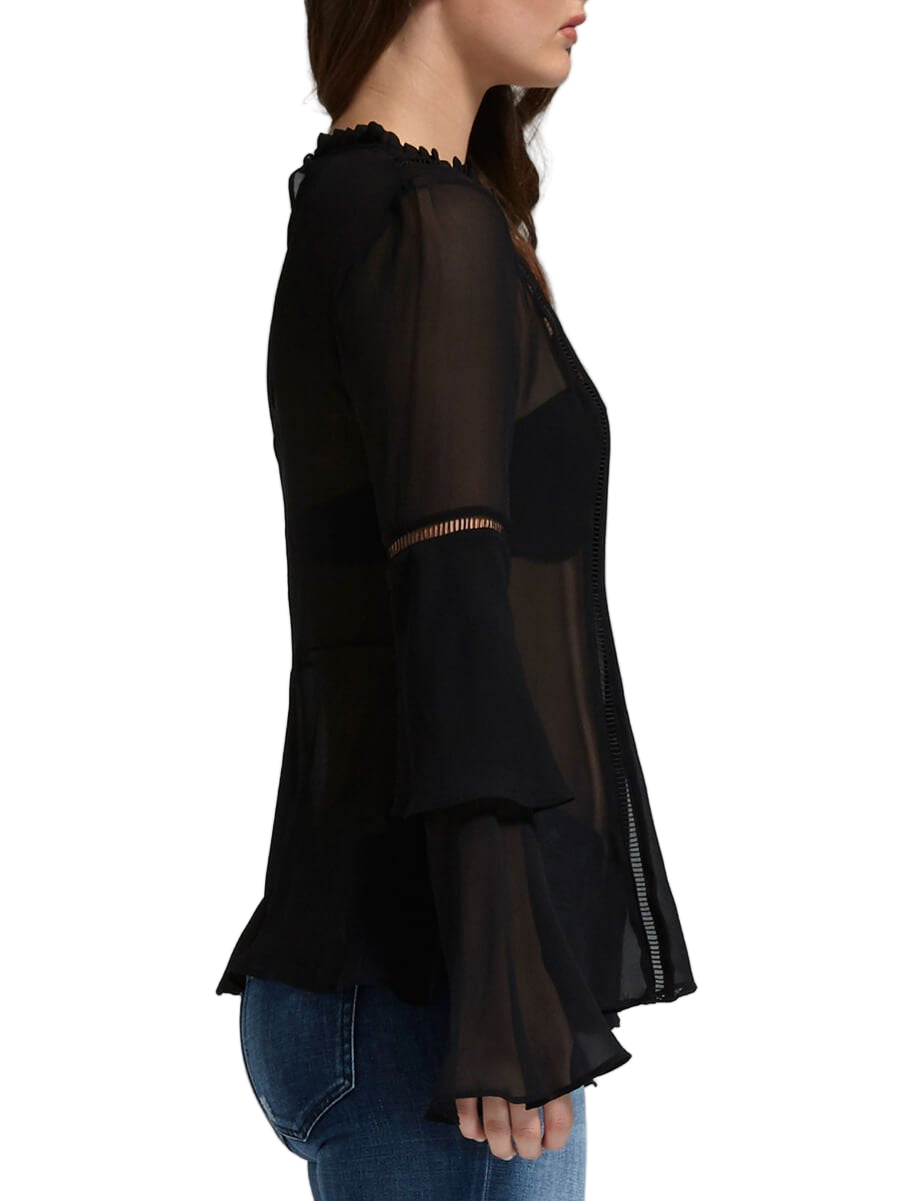The statement twin-layered bell-style sleeves and intricate embroidery-edged lace inserts add a touch of feminine elegance. A short frill banded collar and a keyhole opening with a button at the back neck complete the sophisticated design. Pair this top with high-waisted leather pants or a sleek skirt for an effortlessly chic look.