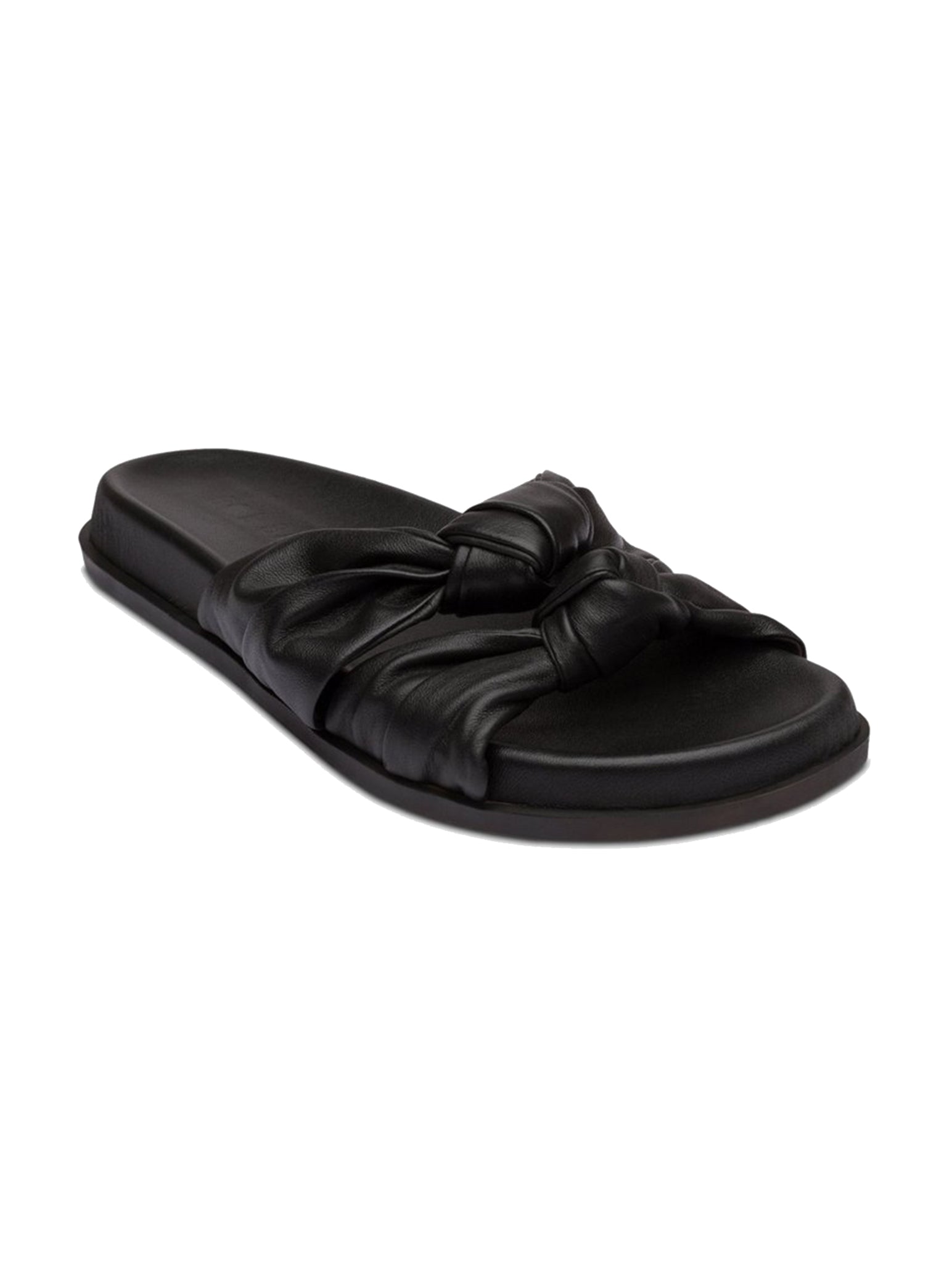 The Sol Sana Memphis slide in Black features a gently rounded toe and deep sole with an open back for a relaxed and sleek summer design. Two thick straps of butter soft black leather twist together to create gentle ruching and an elegant knot detail on the top of the foot.