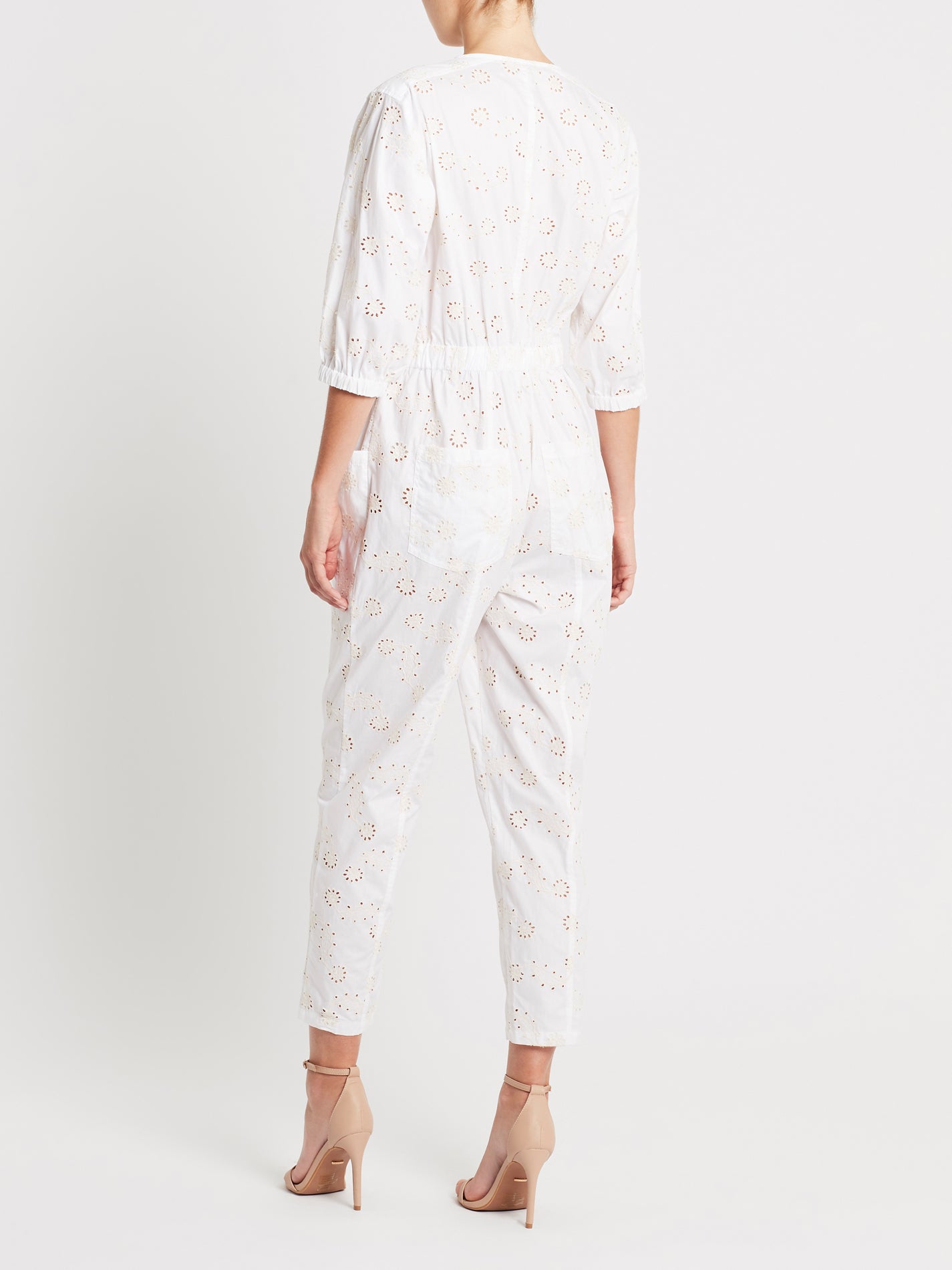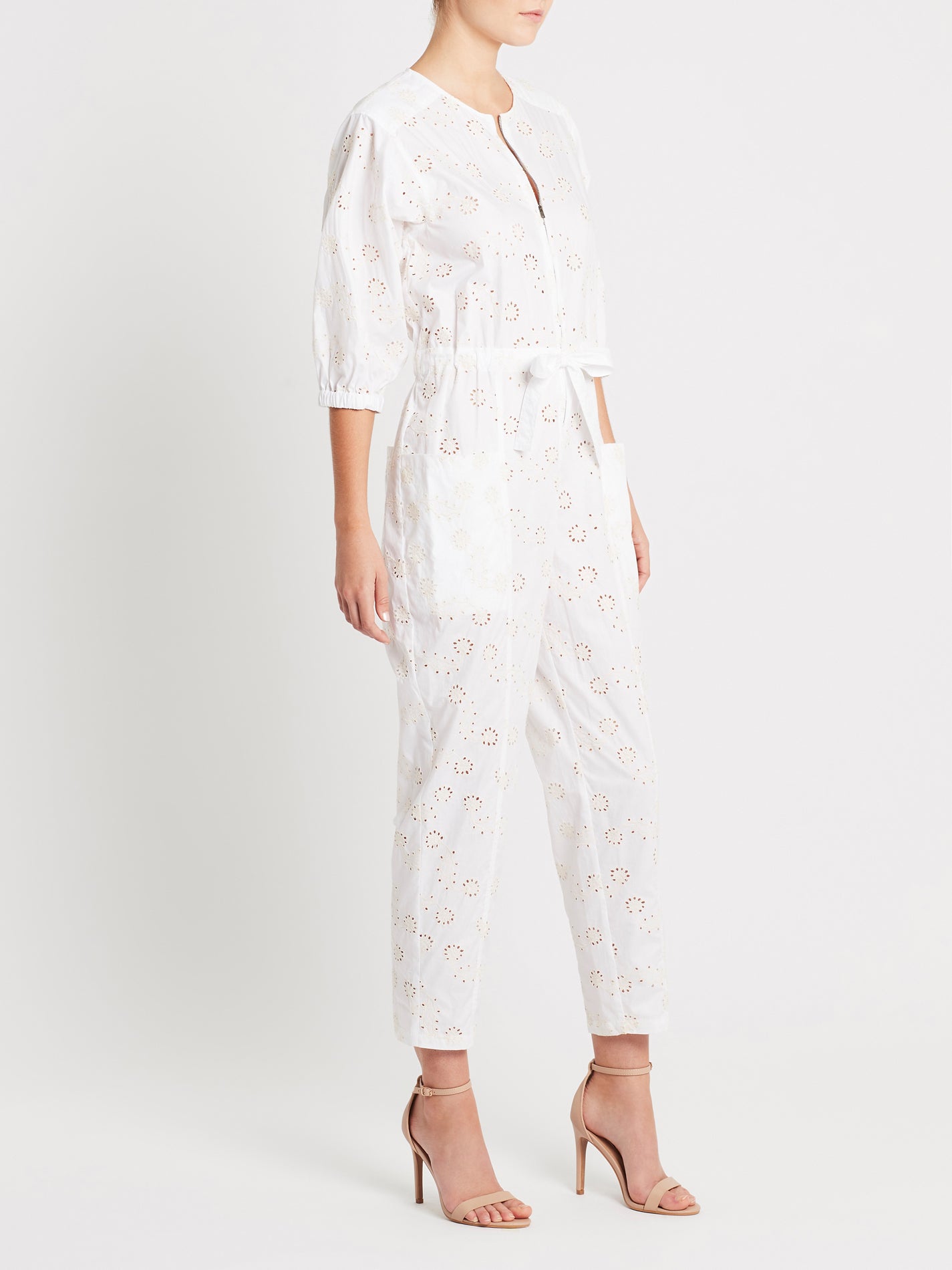 The Rebecca Taylor La Vie Eyelet Poplin Jumpsuit in Milk fits true to size