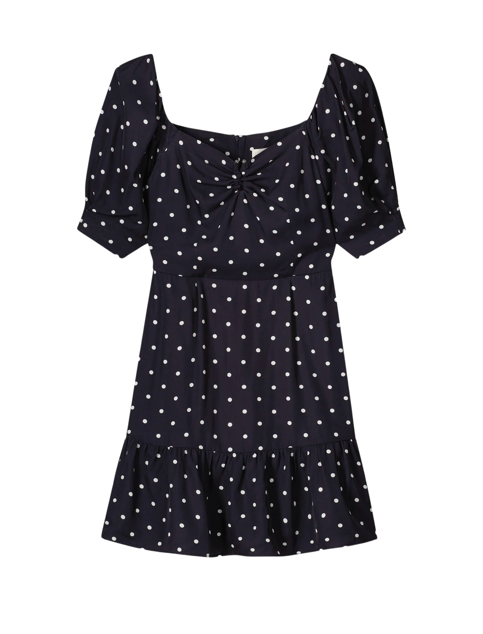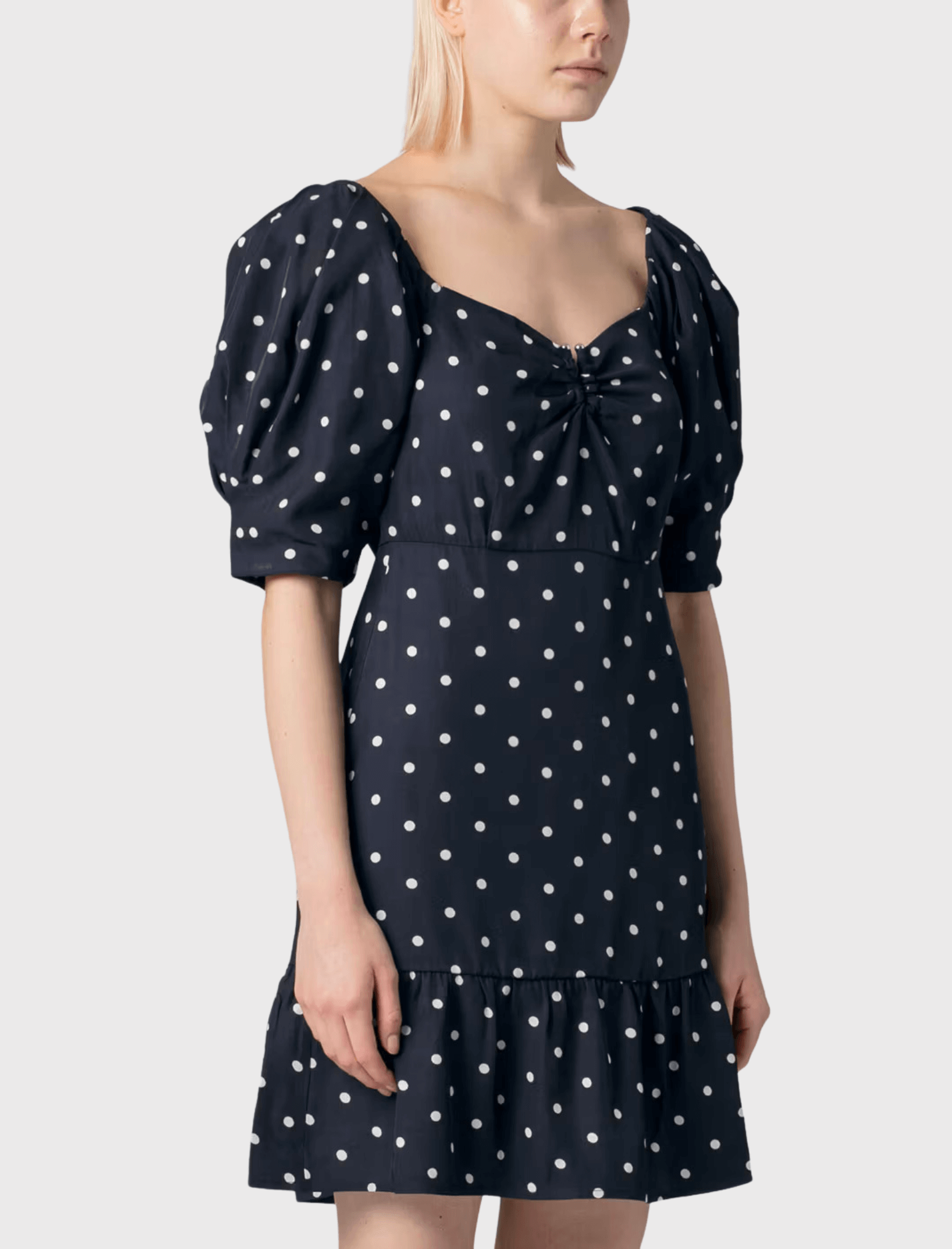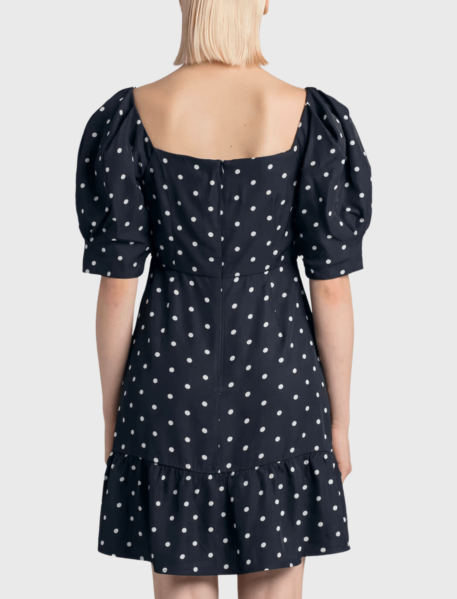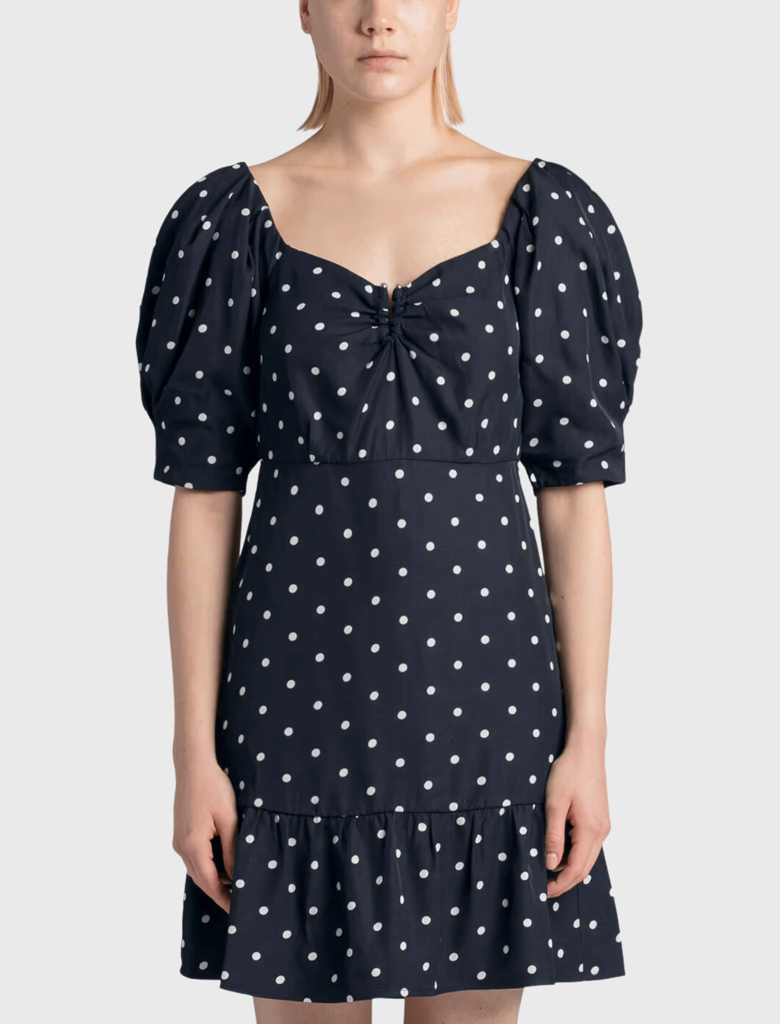 This adorable mini dress is a winning combination of fun and flirty. Featuring a balloon puff sleeve, sweetheart neckline and a fitted skirt with frill detail. This Róhe dress is made from a responsibly sourced viscose twill fabric with a white dot pattern. Features a back zip closure with a shining silver U ring detail at the central front neckline.