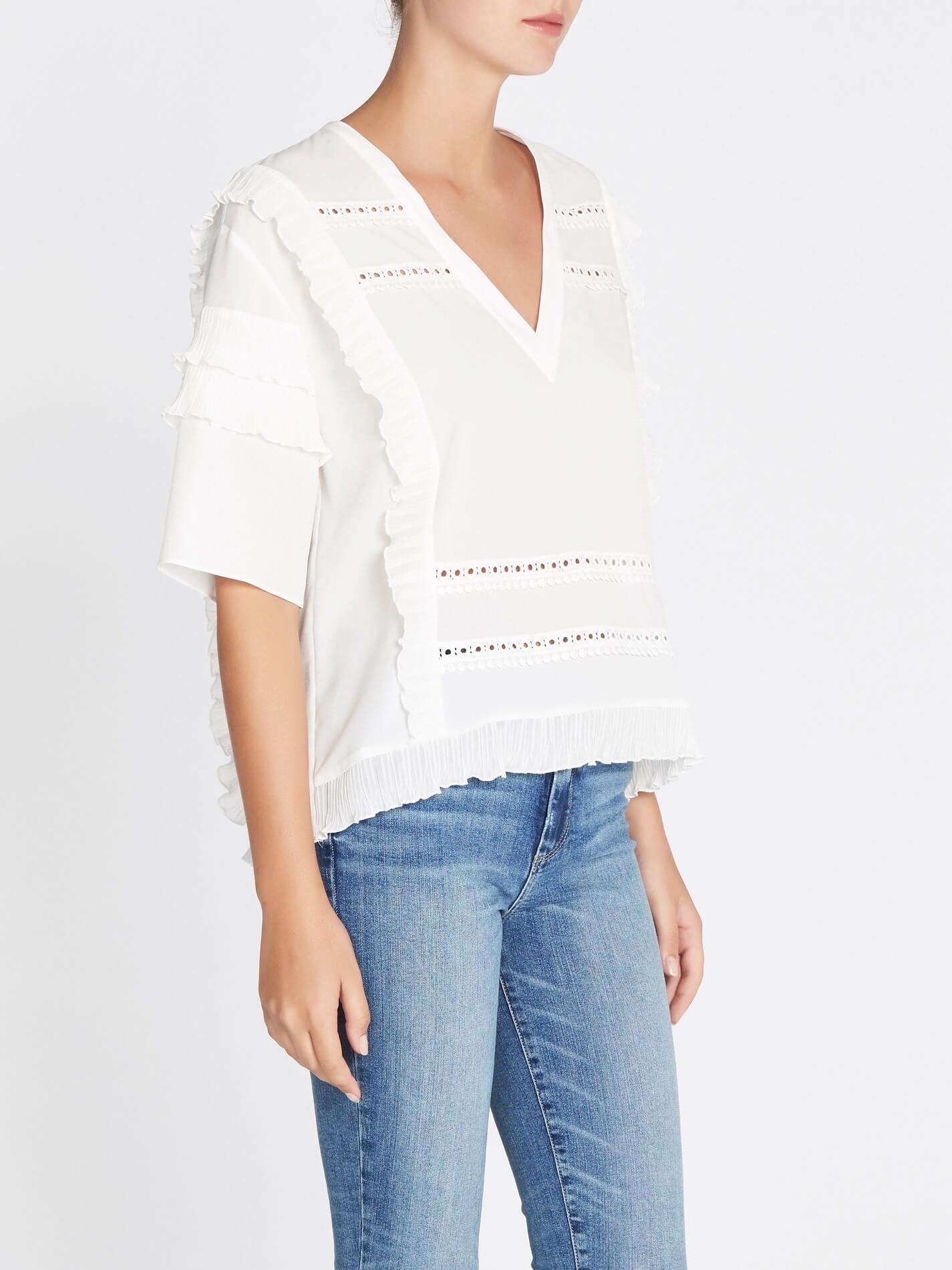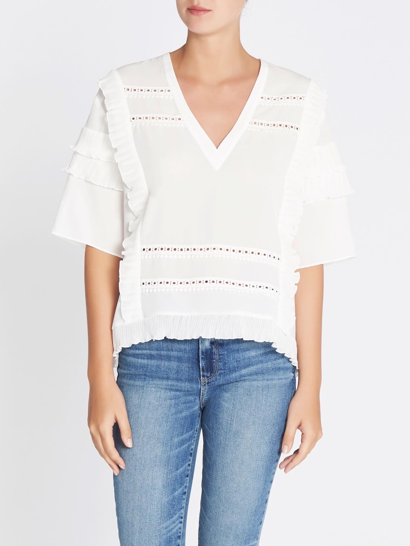 The classic white blouse gets a romantic touch with the IRO Cauland Top in Ecru. Constructed from a lightweight fabric this piece has a v neckline, wide 2/4 length flounce sleeves and ruffle details at the sleeves, chest and hem. Wear yours tucked into a black mini skirt with strappy heels for the perfect date night look.