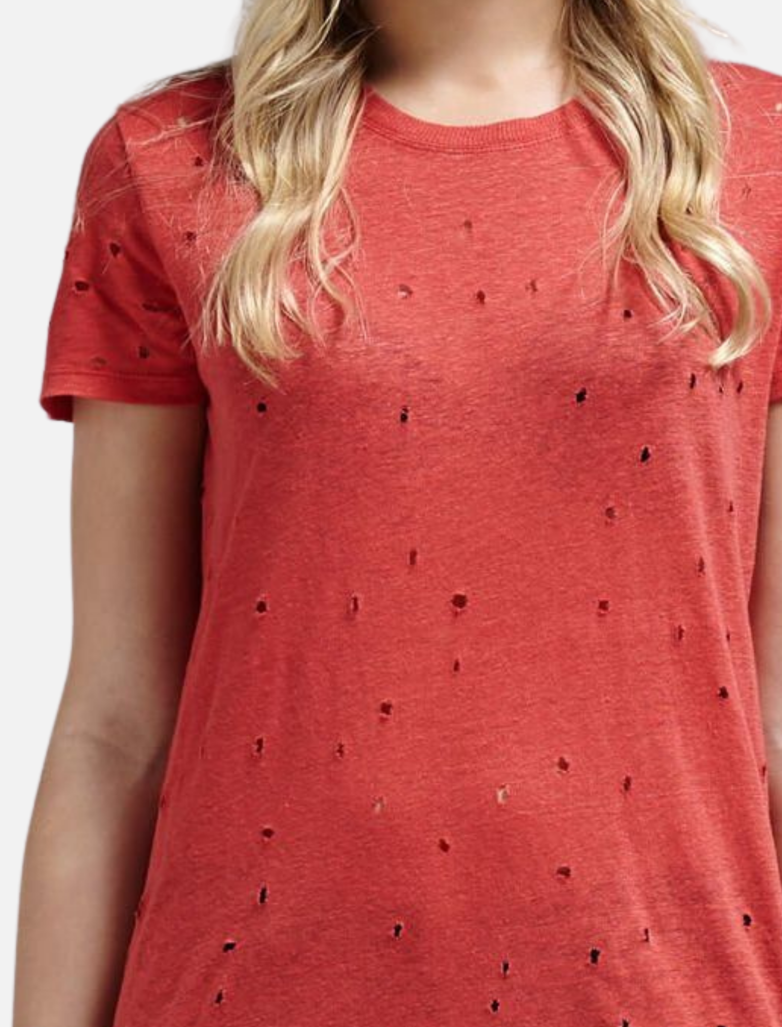 The not so basic basic from IRO. This Clay T-shirt in Bright Red is made from a soft linen and features deliberately distressed cut-out details. Match it back with a faded denim or leather pants for a rock n' roll look.