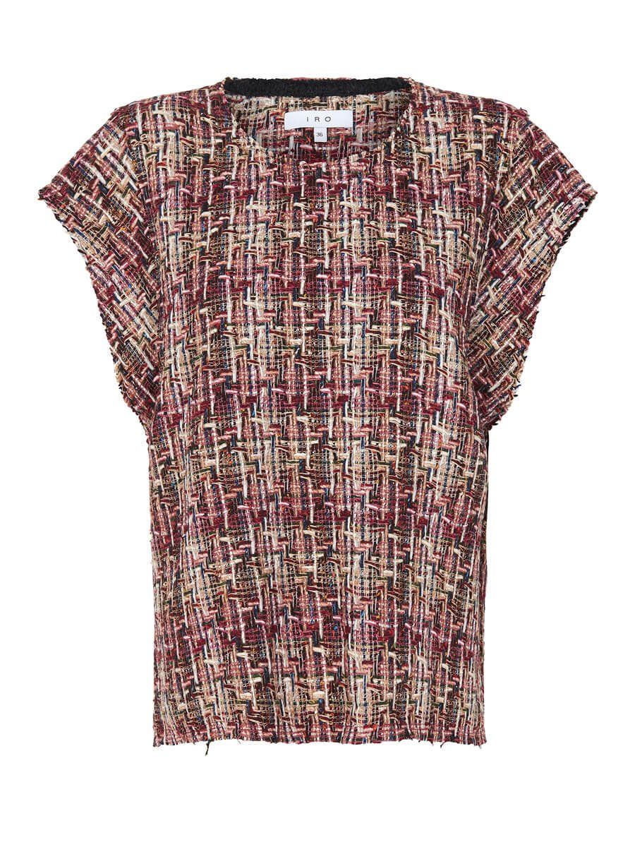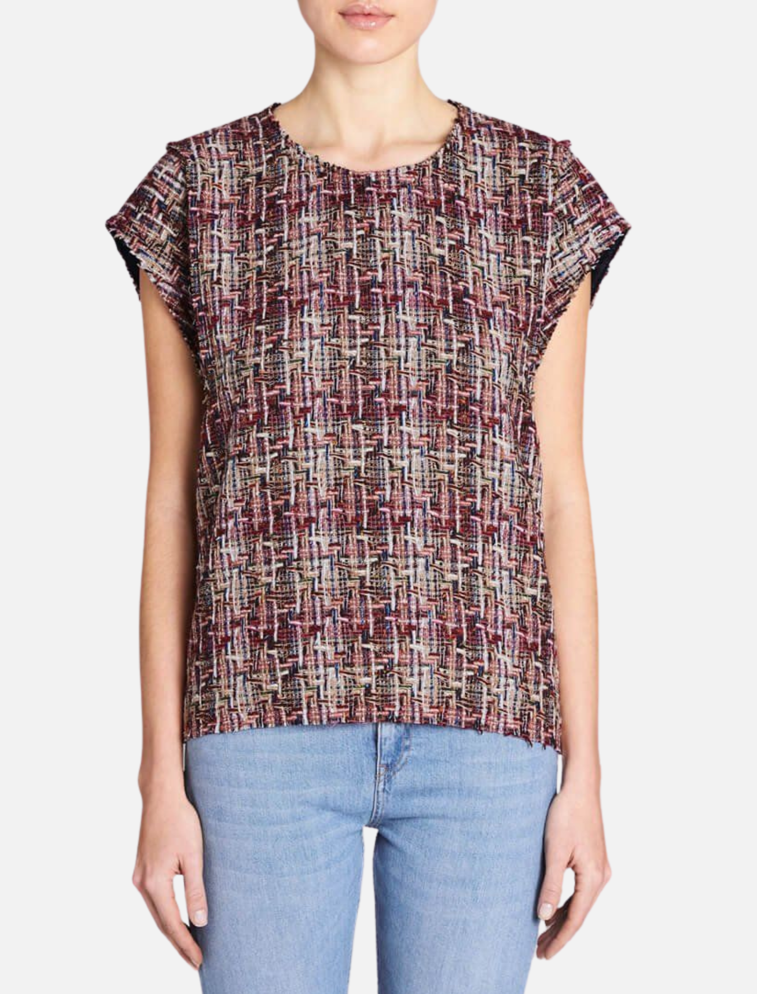 A myriad of warm, neutral and cool colours, the IRO Eline textured tweed Top is a silk blend style with cap sleeves, a round neck and frayed cuffs.