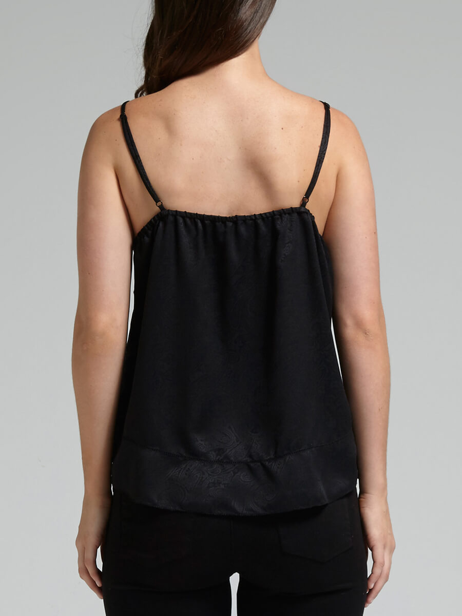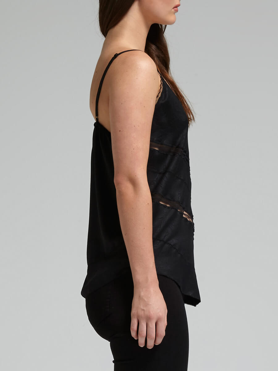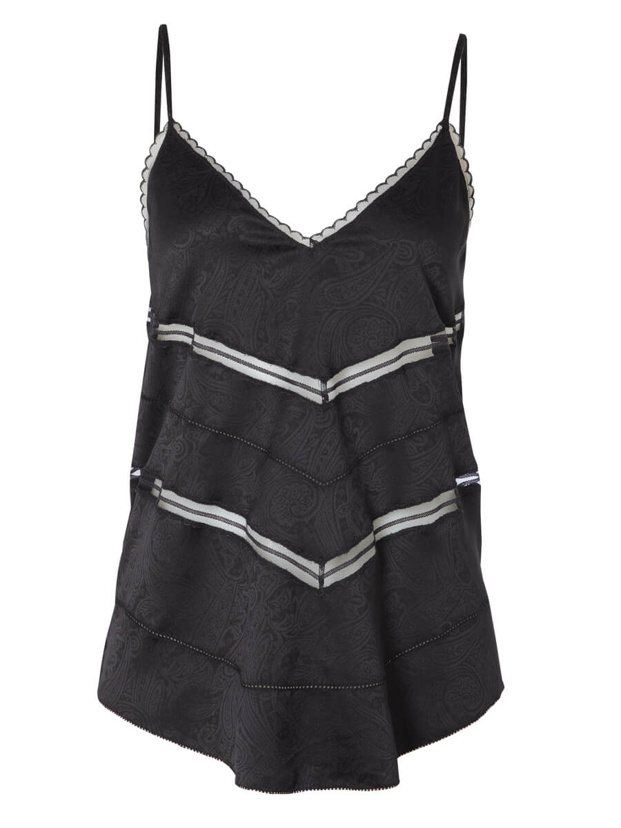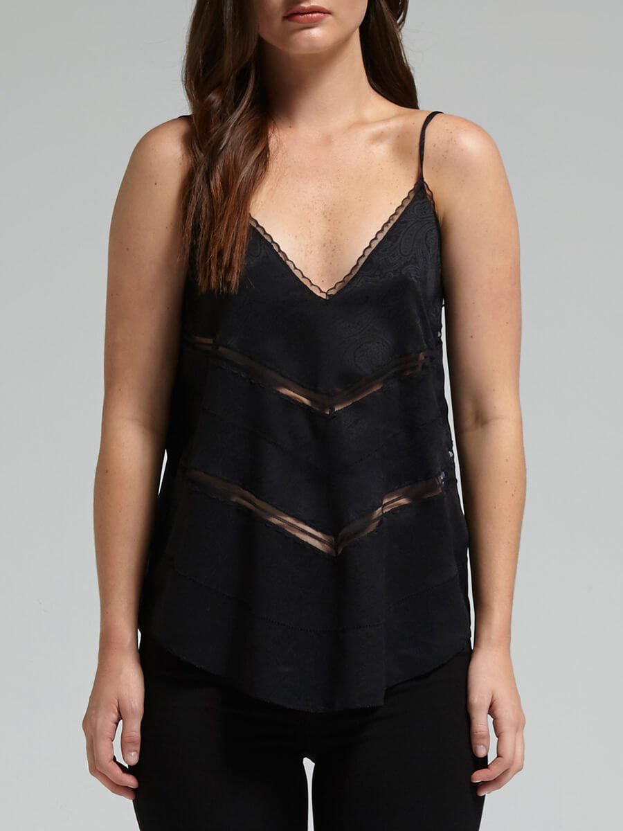 The IRO Maisie Cami is your date night go to top. The flowy V Neck cami features a narrow scalloped lace edge, tonal paisley jacquard and mesh peek-a-boo sections. The back has adjustable straps and a covered elastic back neckline.