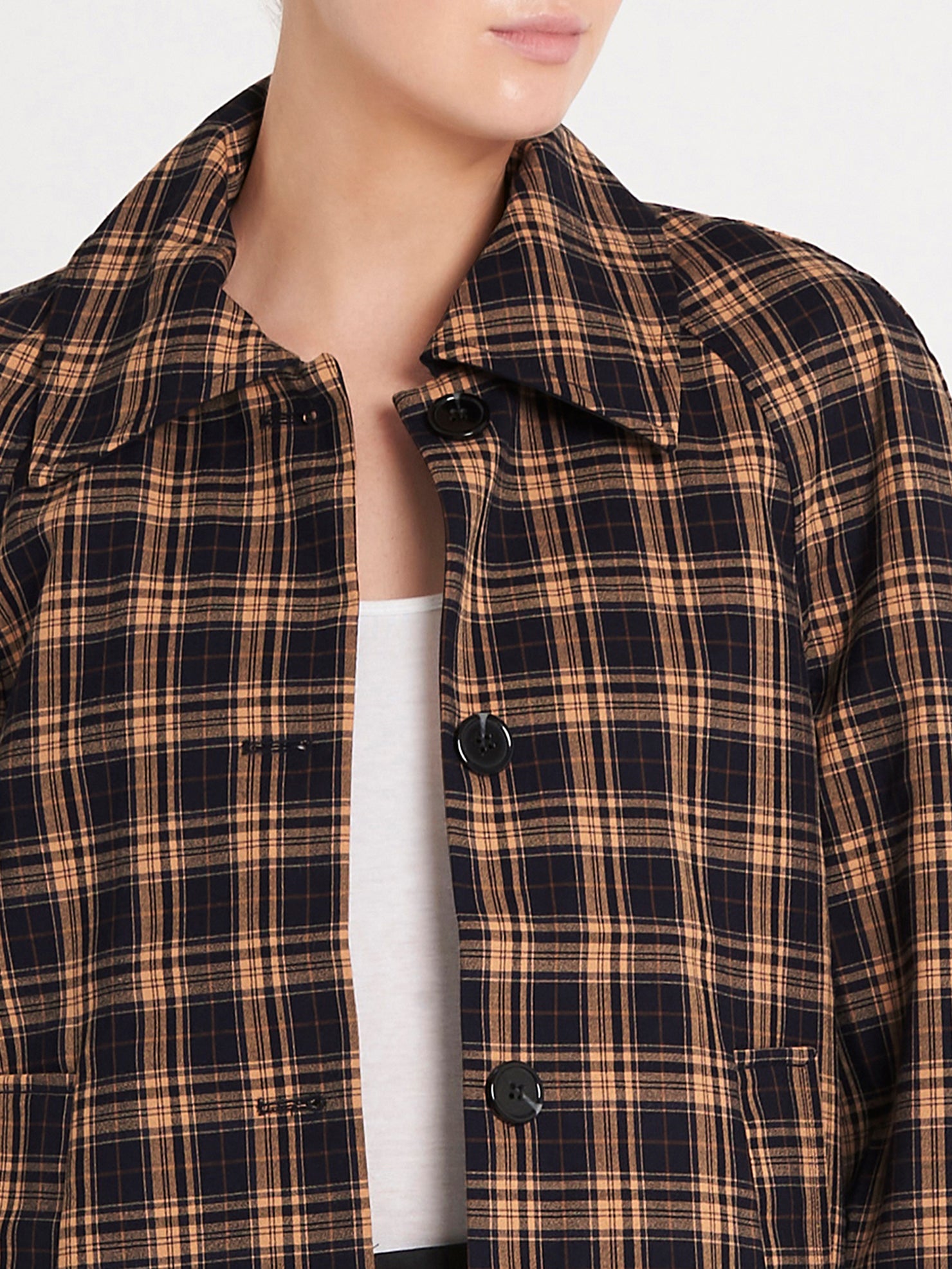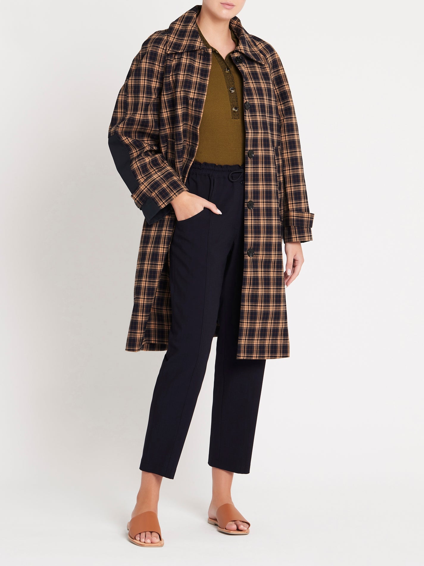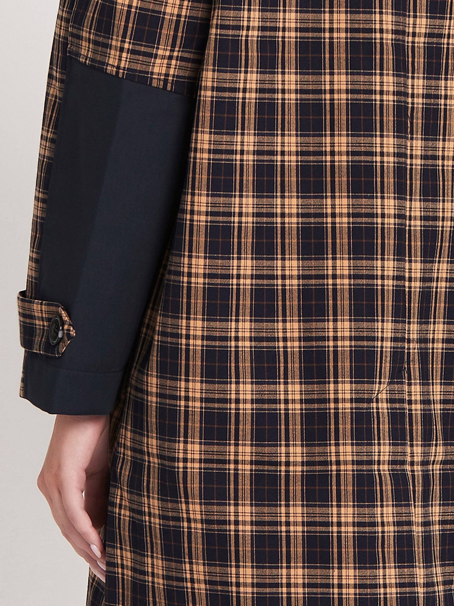 The Baum Und Pferdgarten Danja Coat in Navy Orange Check is a long oversized trench coat with length below the knees. This is a statement Jacket featuring wide sleeves, side pockets, contrast paneling on the forearms, button closures at the front and is unlined.