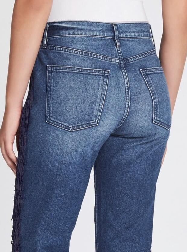 Put some pep to your step with the 3×1 W3 Higher Ground Crop Jean in Spanish Fringe. Constructed from a stretch cotton blend denim these wide leg jeans feature a high waist, single button zip closure, a raw cut cropped hem, authentic lap fades and whiskering and have been finished with fringe detailing at the side seams. Team yours with your favourite slides and a white tee for east off-duty style.