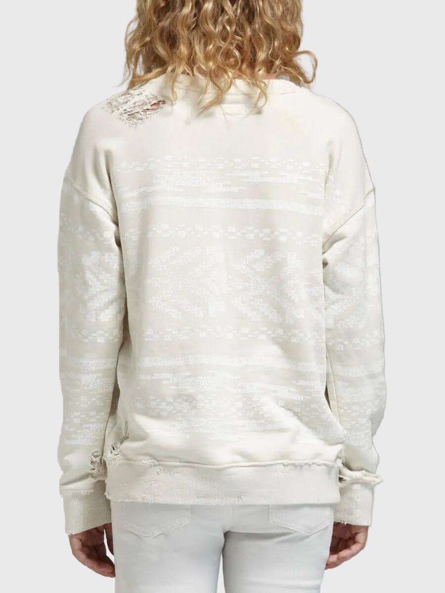 A worn out style you can wear out, The Big Easy Sweat Top from MOTHER is an oversized sweatshirt that features distressing throughout and a white painted Aztec inspired print. It has a round neckline, and is detailed with ribbed edging along the hemline, neckline and cuffs.