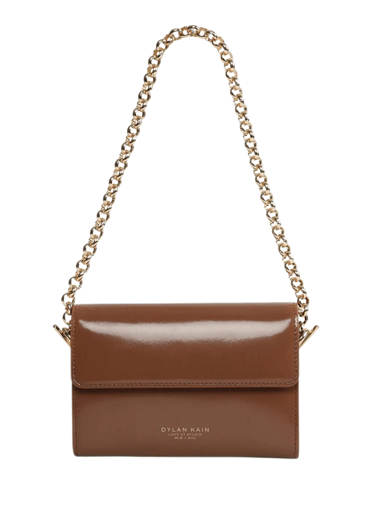 One Wallet To Rule Them All. Dylan Kain has designed your perfect mate - The Juicy Patent Wallet in Chocolate with Light Gold Hardware. More of a mini bag than wallet this piece is made from 100% Italian Patent Leather with polished gold hardware. Featuring a single flap opening, 8 card spaces, and two note pockets to store your secrets. With enough space for your phone, cards, gloss, and keys, throw the Juicy Patent Wallet in Chocolate with Light Gold Hardware in your everyday bag, or wear as a statement mini-bag.