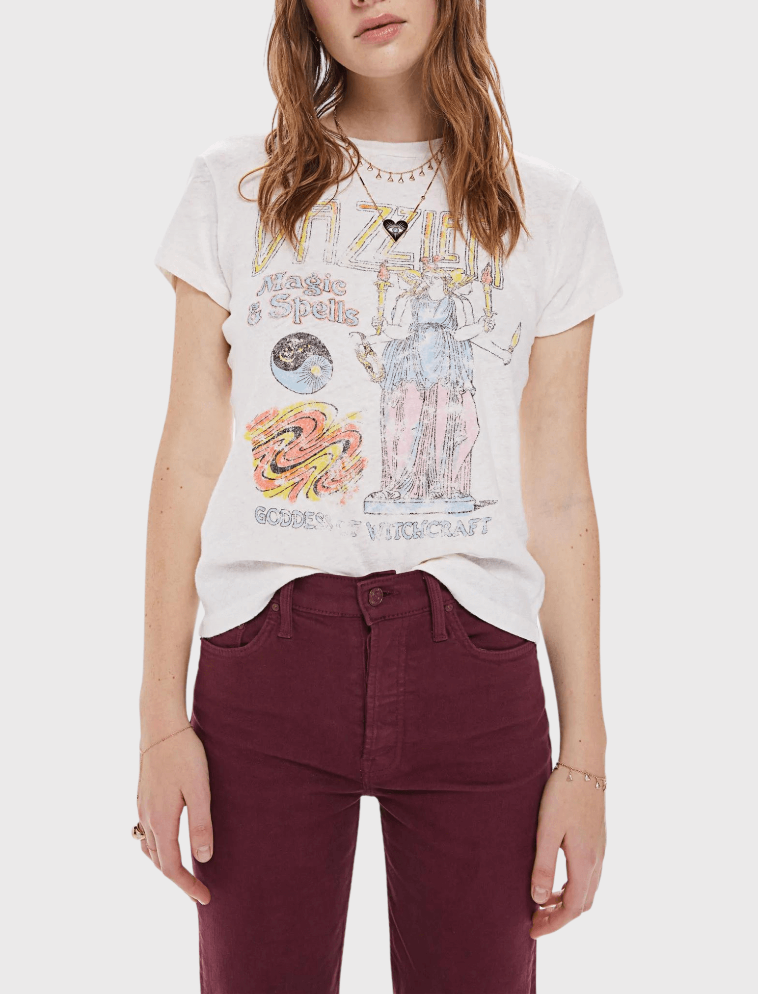 There's a little witch in all of us. Channel your inner magic in the Mother Denim Lil Sinful Tee in Dazzler. Constructed from a cotton and linen blend, this slightly sheer crewneck has a vintage look and feel, featuring a faded graphic with mystical symbols and signs of peace. Slip on the Lil Sinful, plant lavender for luck, and fall in love whenever you can.