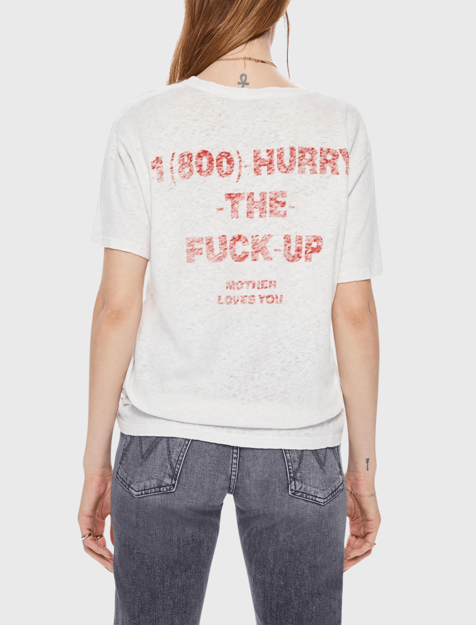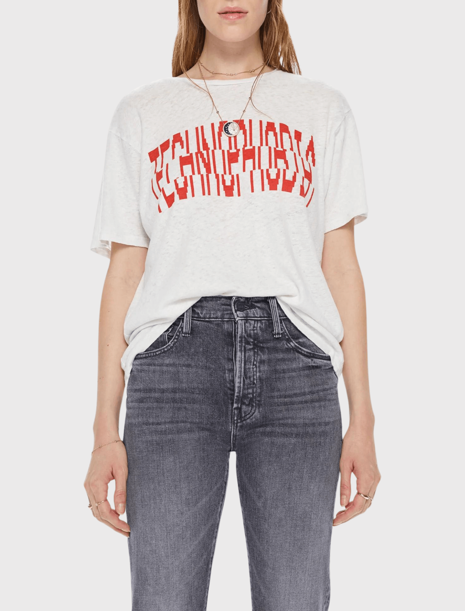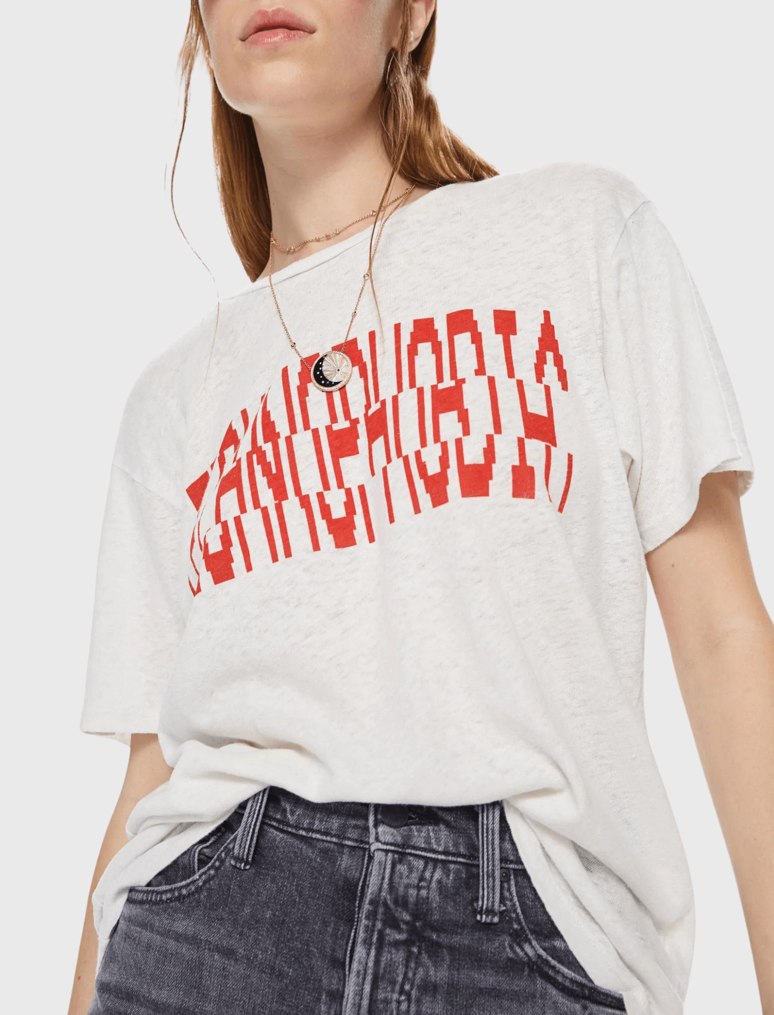 Reboot your style with the Mother Denim The Rowdy Tee in Technophobia White. Constructed from a slubby cotton linen blend, this oversize tee features a glitchy graphic on the front, and an explicit decoy number on the back. You'll look good enough to take a byte - we are Siri-ous!