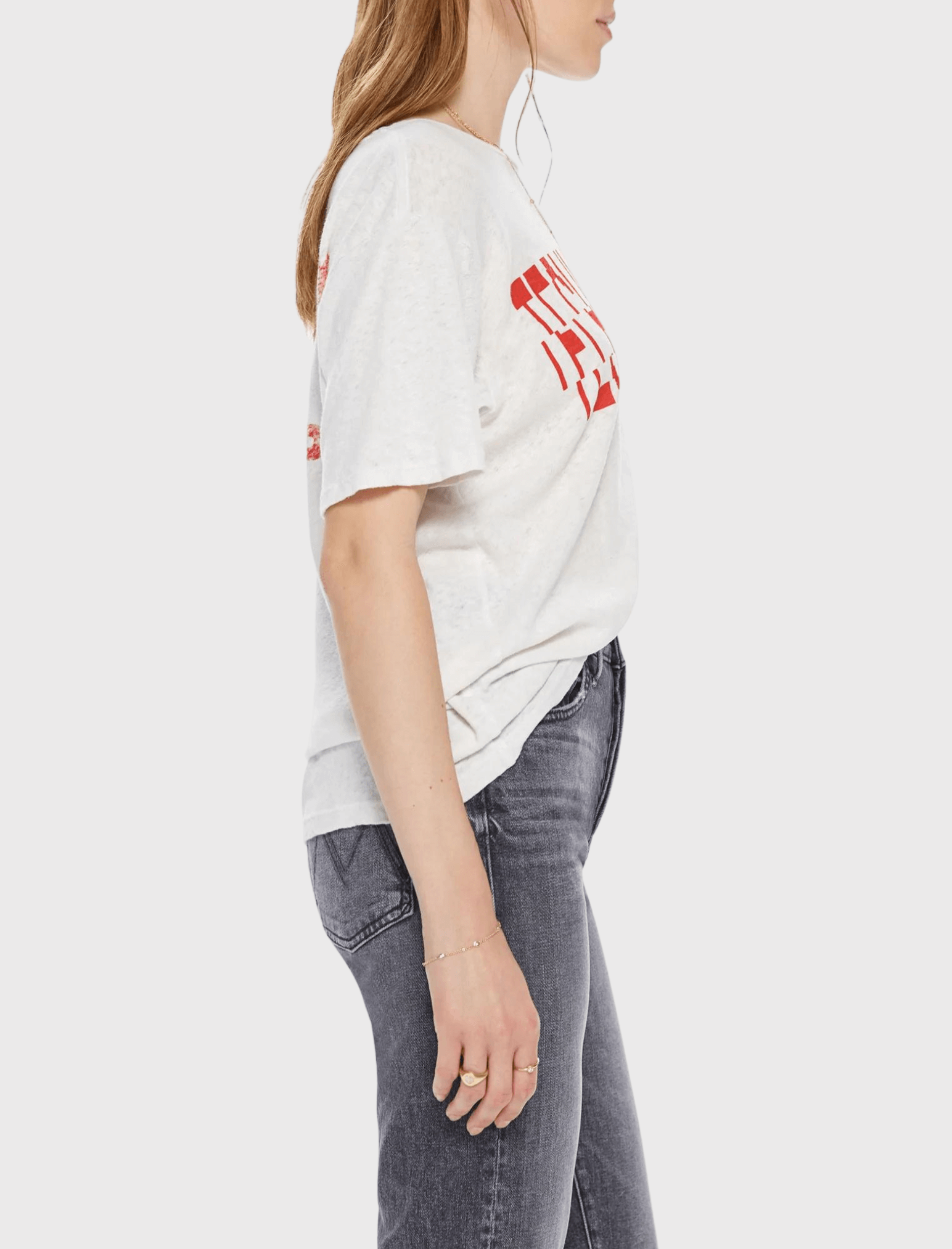 The Mother Denim The Rowdy Tee in Technophobia White is made from 50% Cotton, 50% Linen
