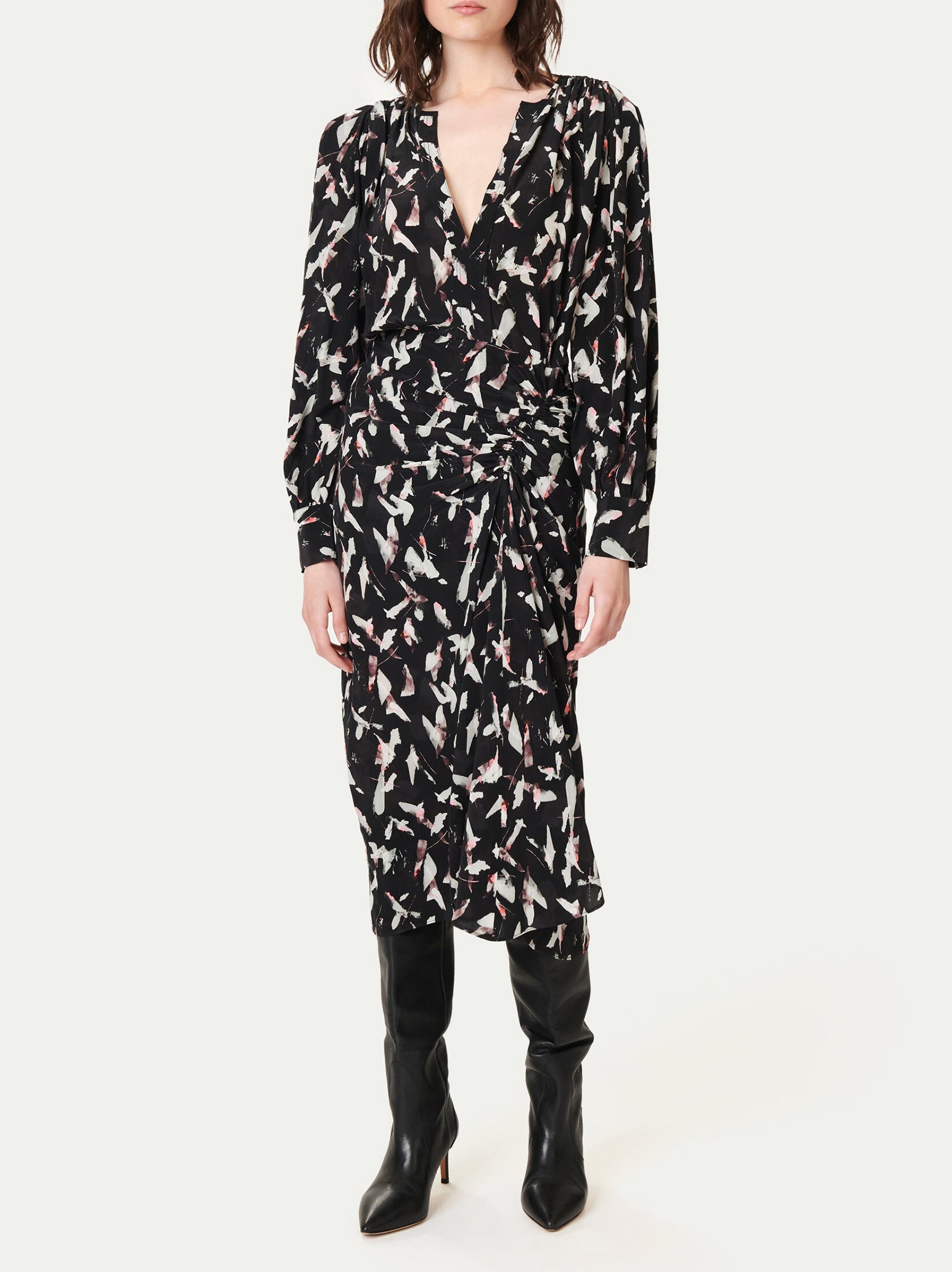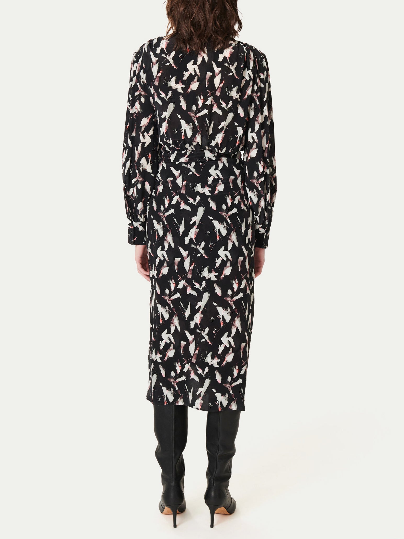 The IRO Carola Dress in Black/Ecru is the perfect dress for a cold wintery day. The long sleeves and fitted waist combine into a faux wrap style skirt with a subtle split that is extremely flattering. The all-over pattern is reminiscent of birds in flight. Other details included buttoned cuffs, pleated shoulder details and a flat taped V Neck line finish.