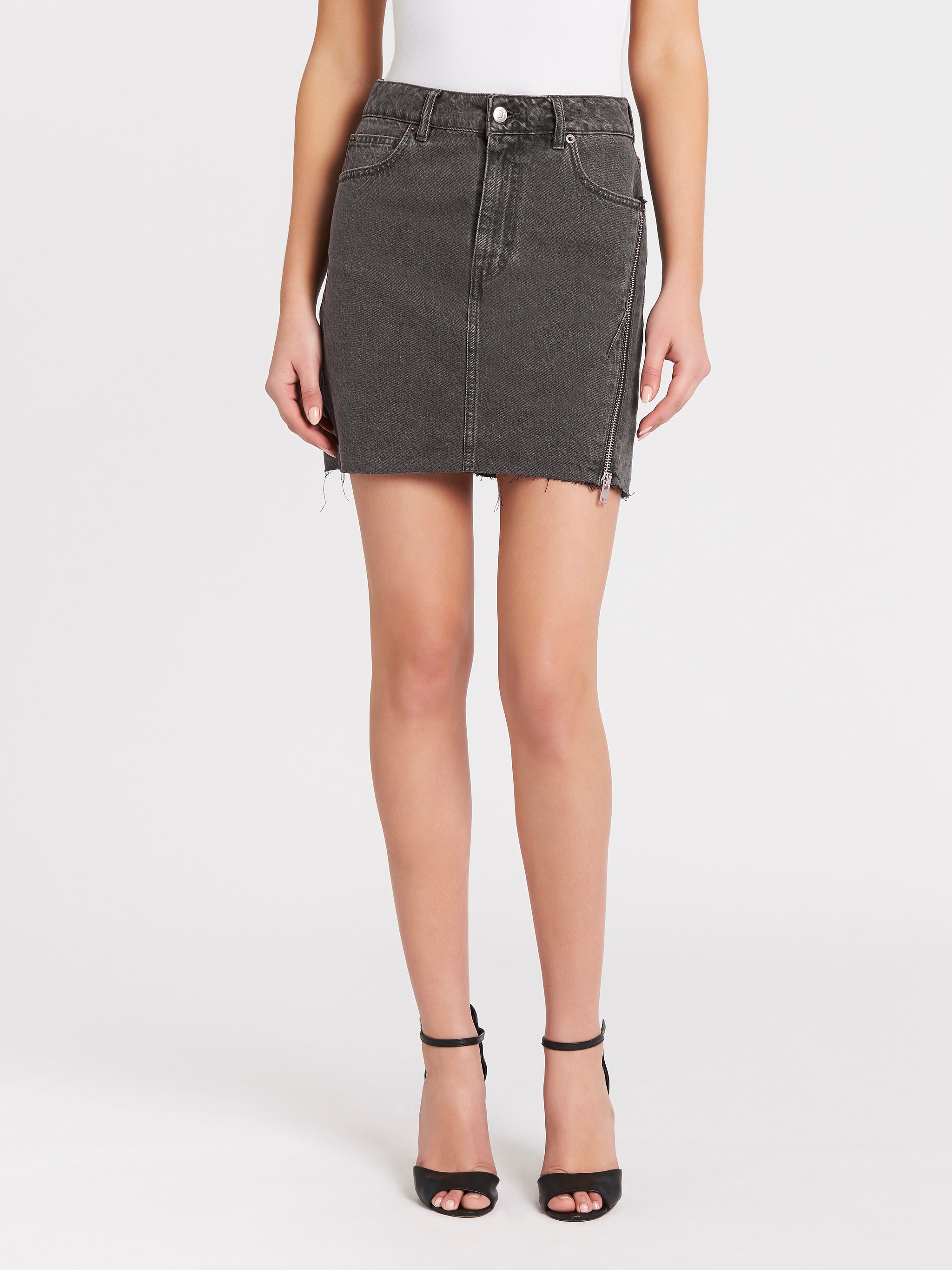The classic denim skirt gets an update with the Emiel Skirt in Black Denim by IRO. Crafted from a soft cotton this mini skirt features an asymmetric side zipper, single zip fly closure and is finished with frayed hemline details. Pair back with a vintage tee and boots for that chic rock and roll appeal.