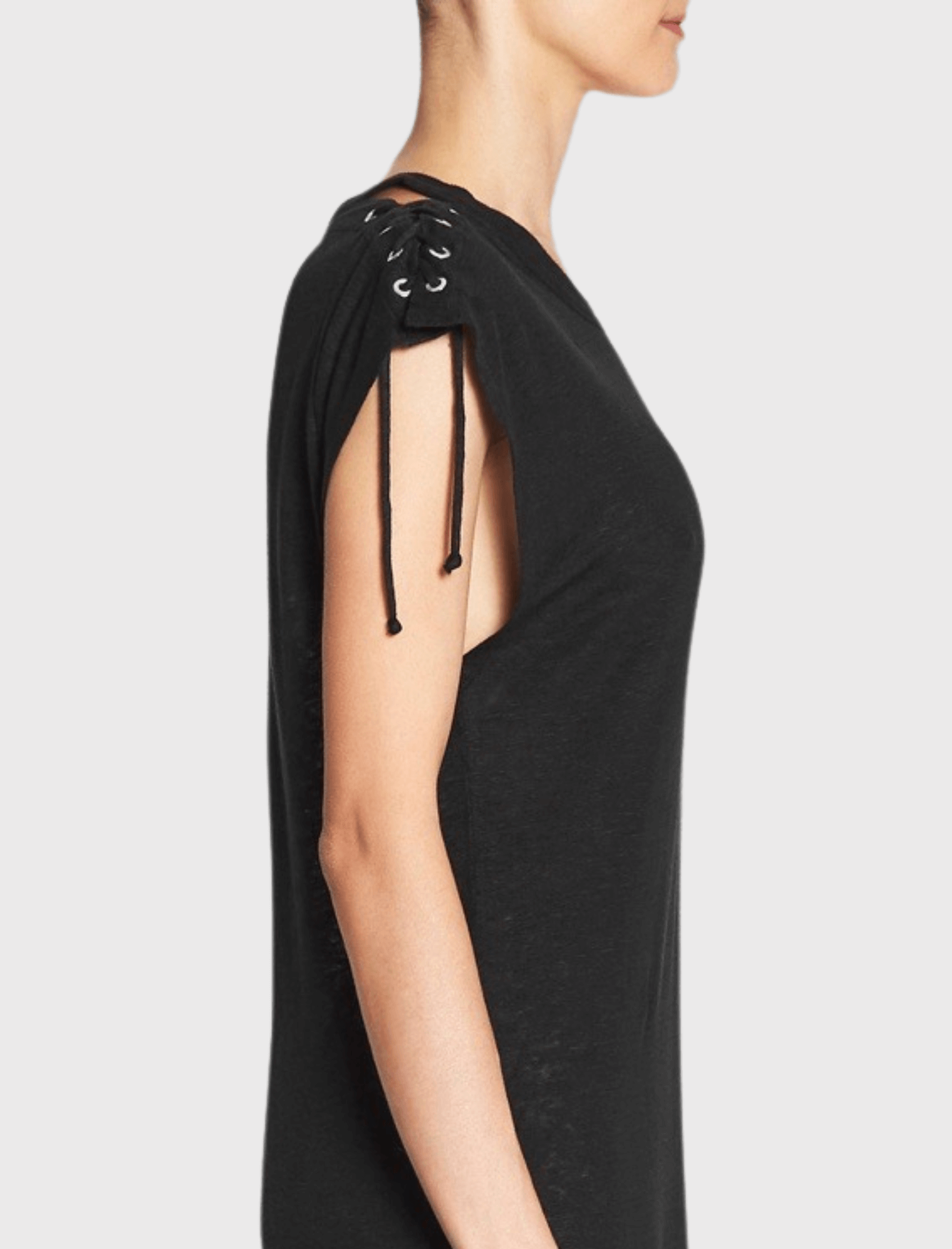 The IRO Iboga Dress in Black is easy to wear and will seamlessly merge into any wardrobe. Constructed from a soft and lightweight stretch linen, this maxi style dress features lace up shoulders with eyelet details and cap sleeves. Team this pullover piece with your favourite leather slides and you'll have the perfect off duty look ready to go.