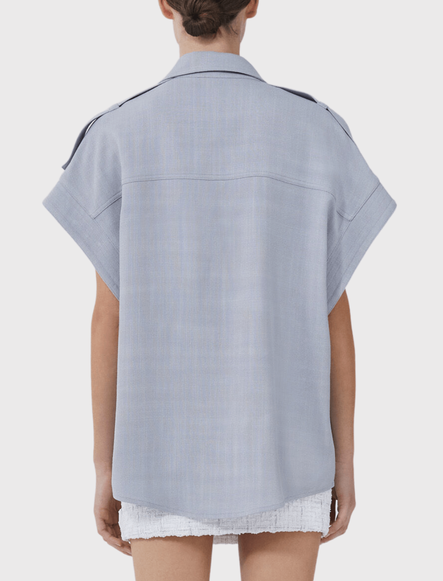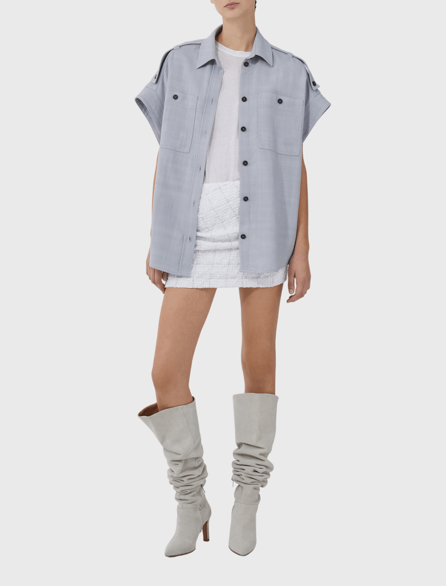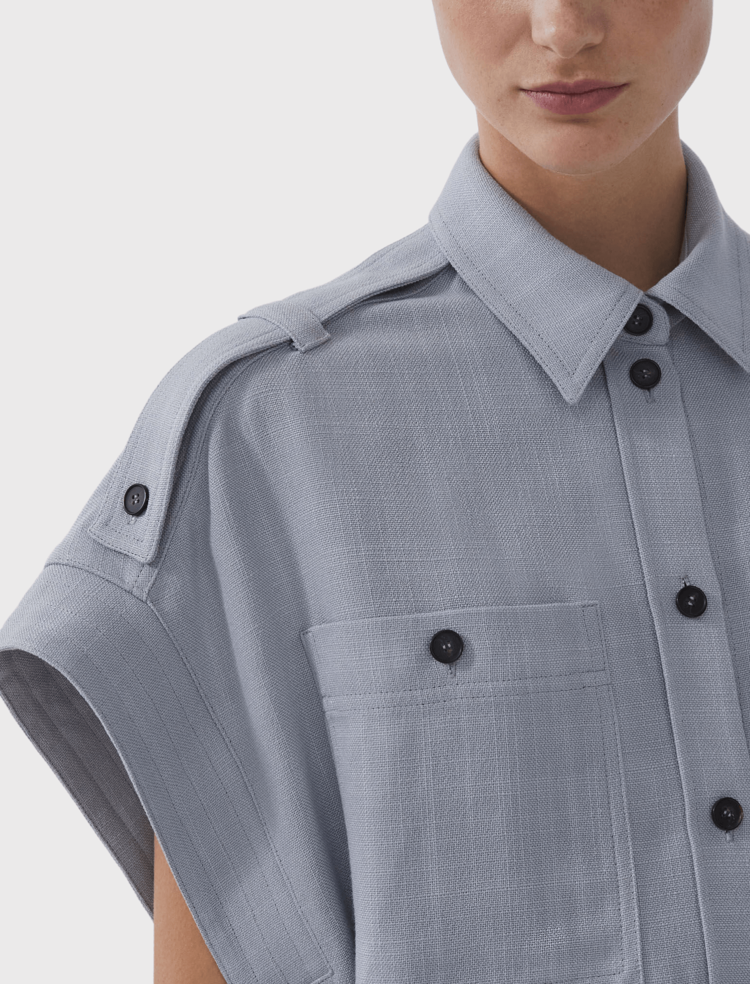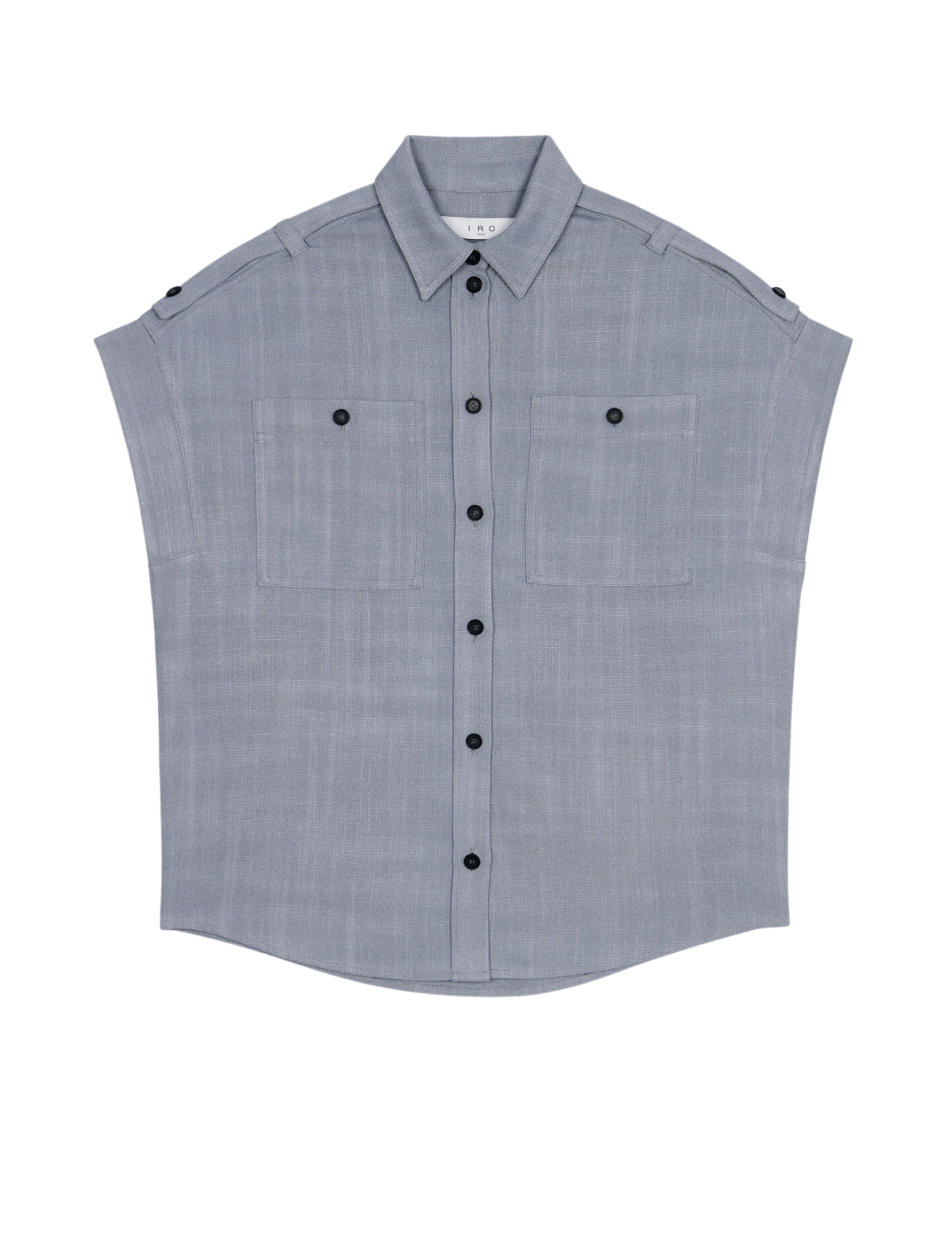 This utilitarian style overtop is a great layering piece in a lightweight breathable fabric. The cap sleeve shacket is perfect for transseasonal weather, layer it over a long sleeved t-shirt or wear on it's own. Featuring shoulder epaulette detail, matte black buttons and twin flat stitch front breast pockets. Complete the look by pairing it will the IRO Miels Pant.