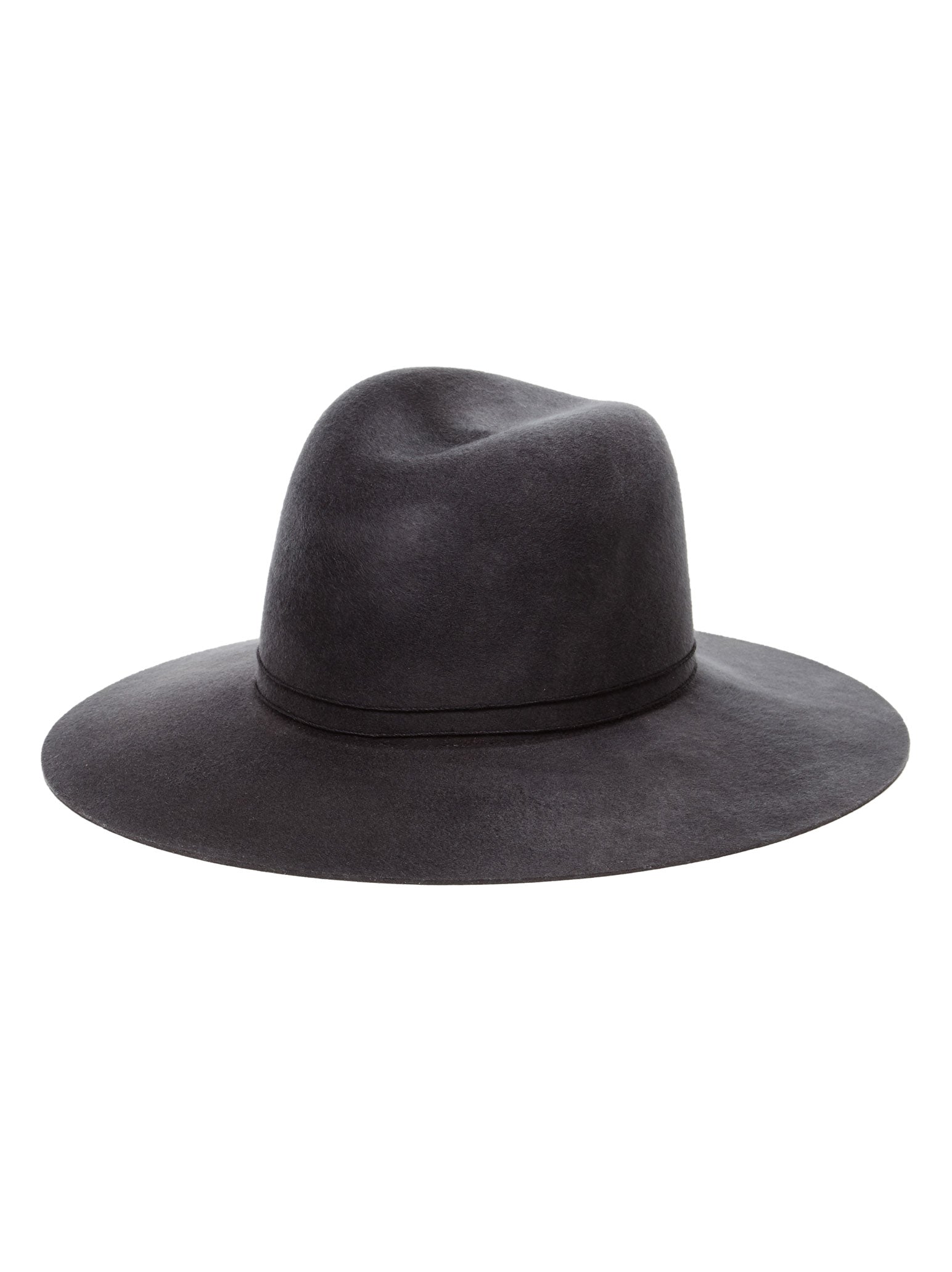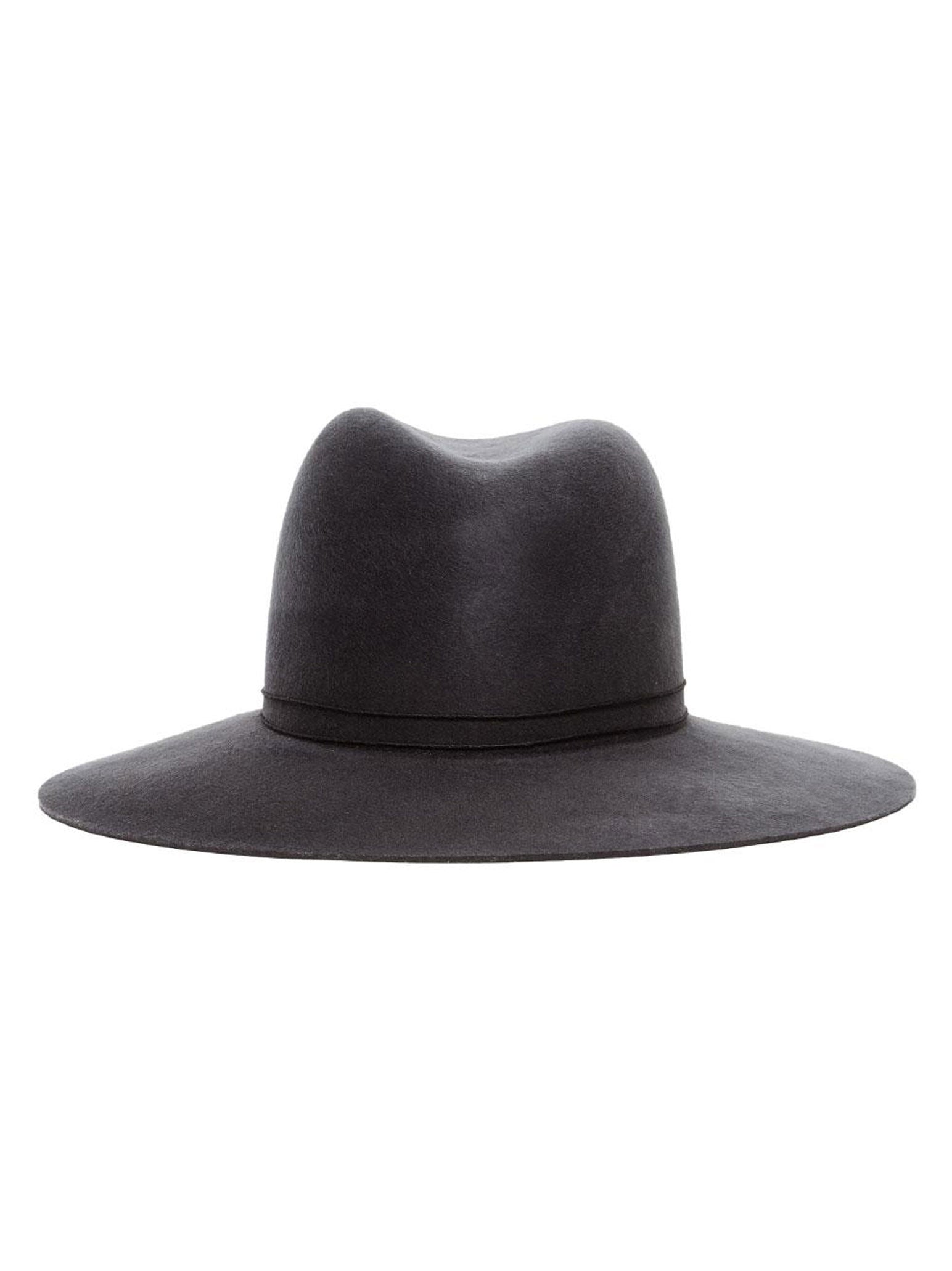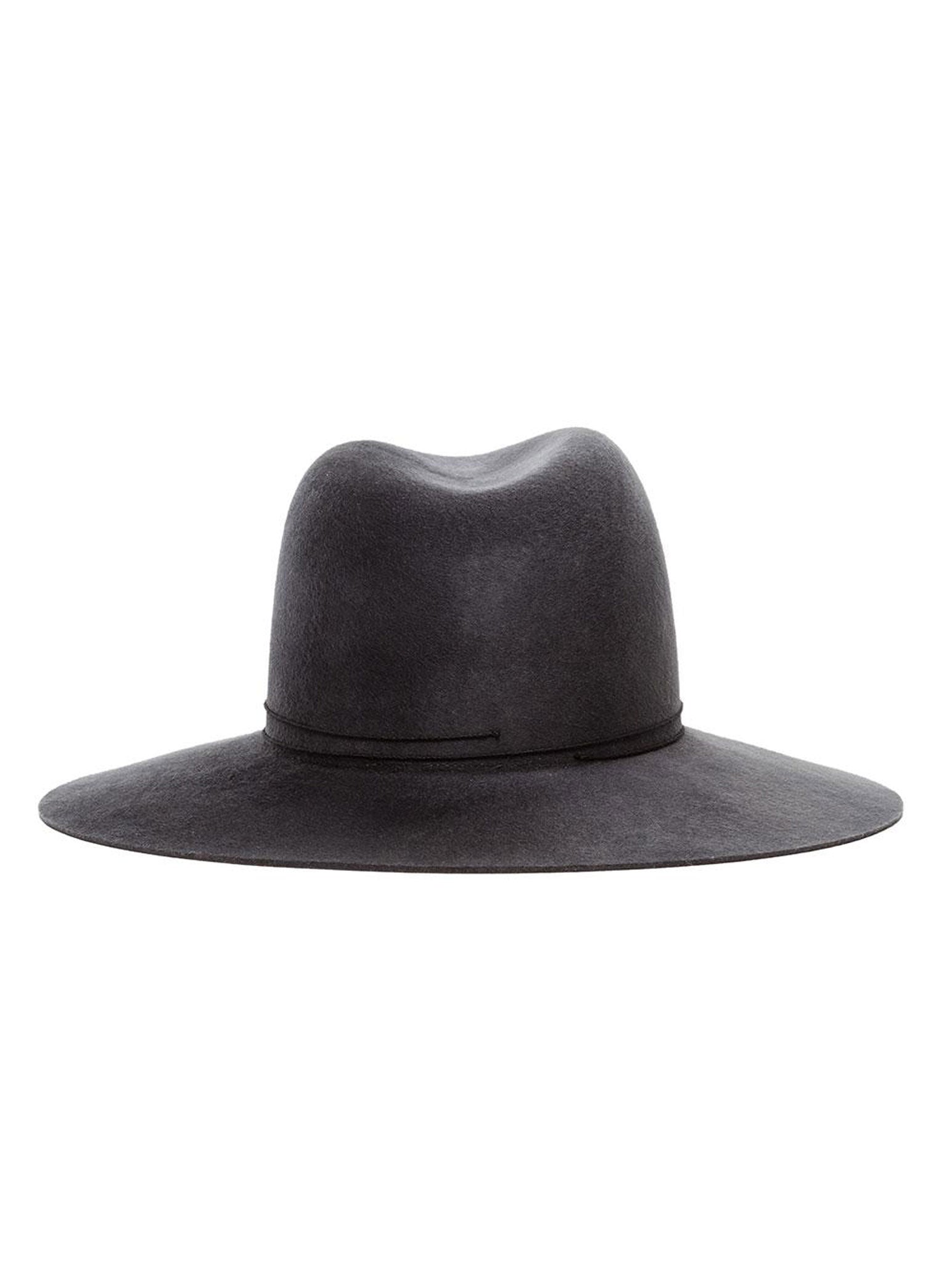 A Janessa Leone classic wide-brimmed fedora silhouette with a hand-polished velour finish. Made with a stiffened brim to maintain structure, this dark grey color is dense and luxurious while the thin cord detail offers a unique detail making this hat a statement.