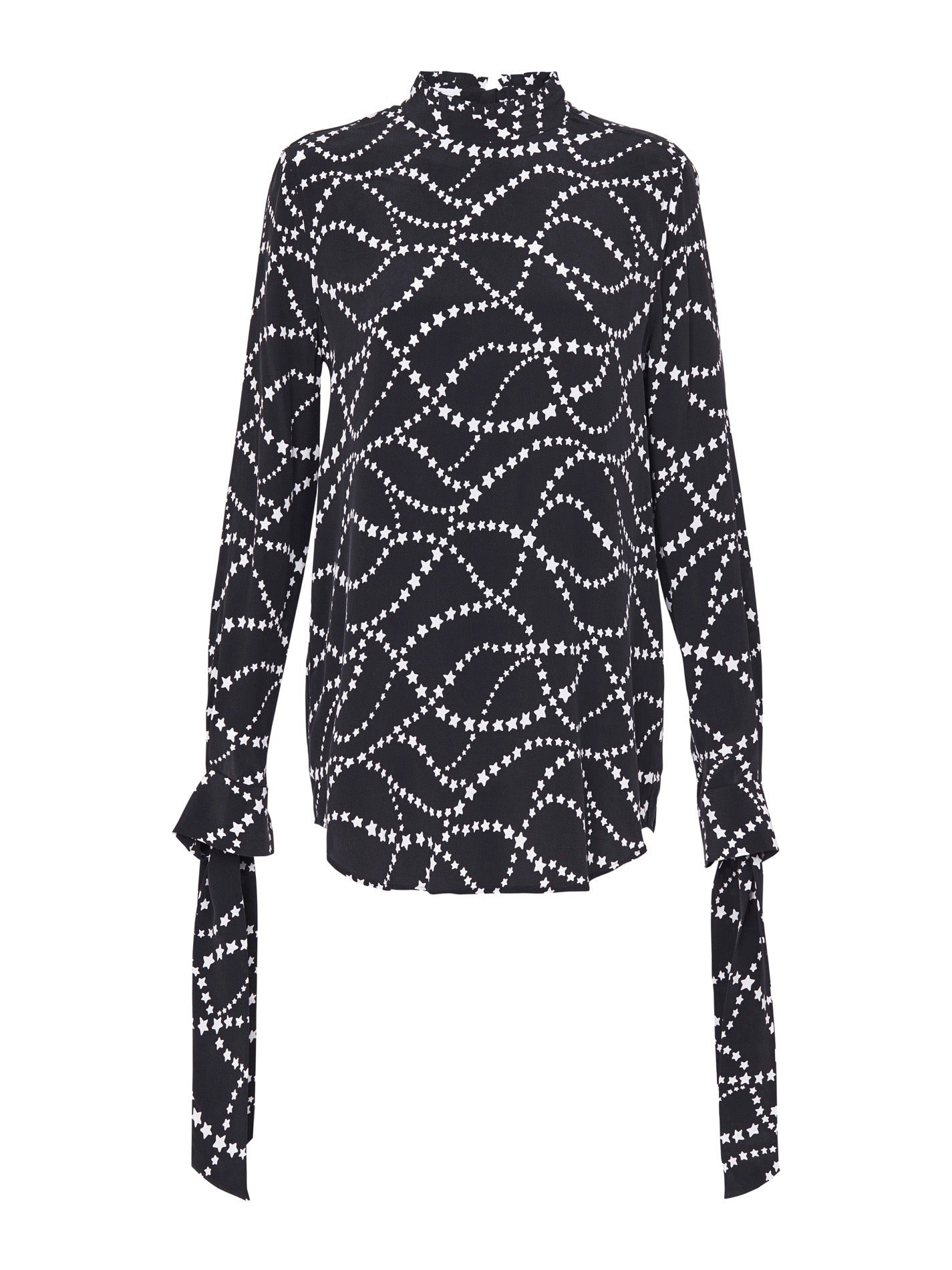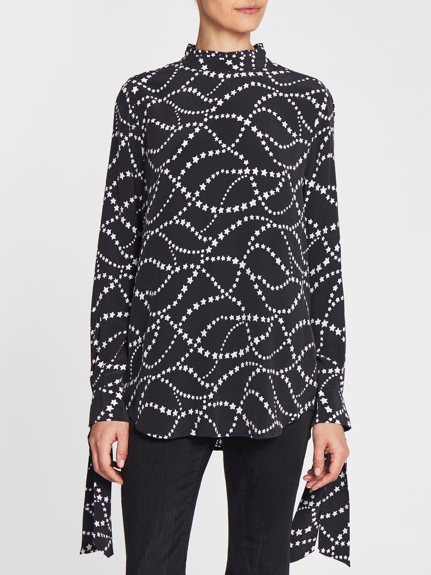 The ultra feminine Aurora Shirt from Equipment is re-imagined in a graphic ribbon style star print giving it a glamorous rock and roll edge. The elizabethan style collar is a combination of pleated ruffles and elegance while the self-tie ribbons over the back keyhole and cuffs add a decidedly romantic vibe.
