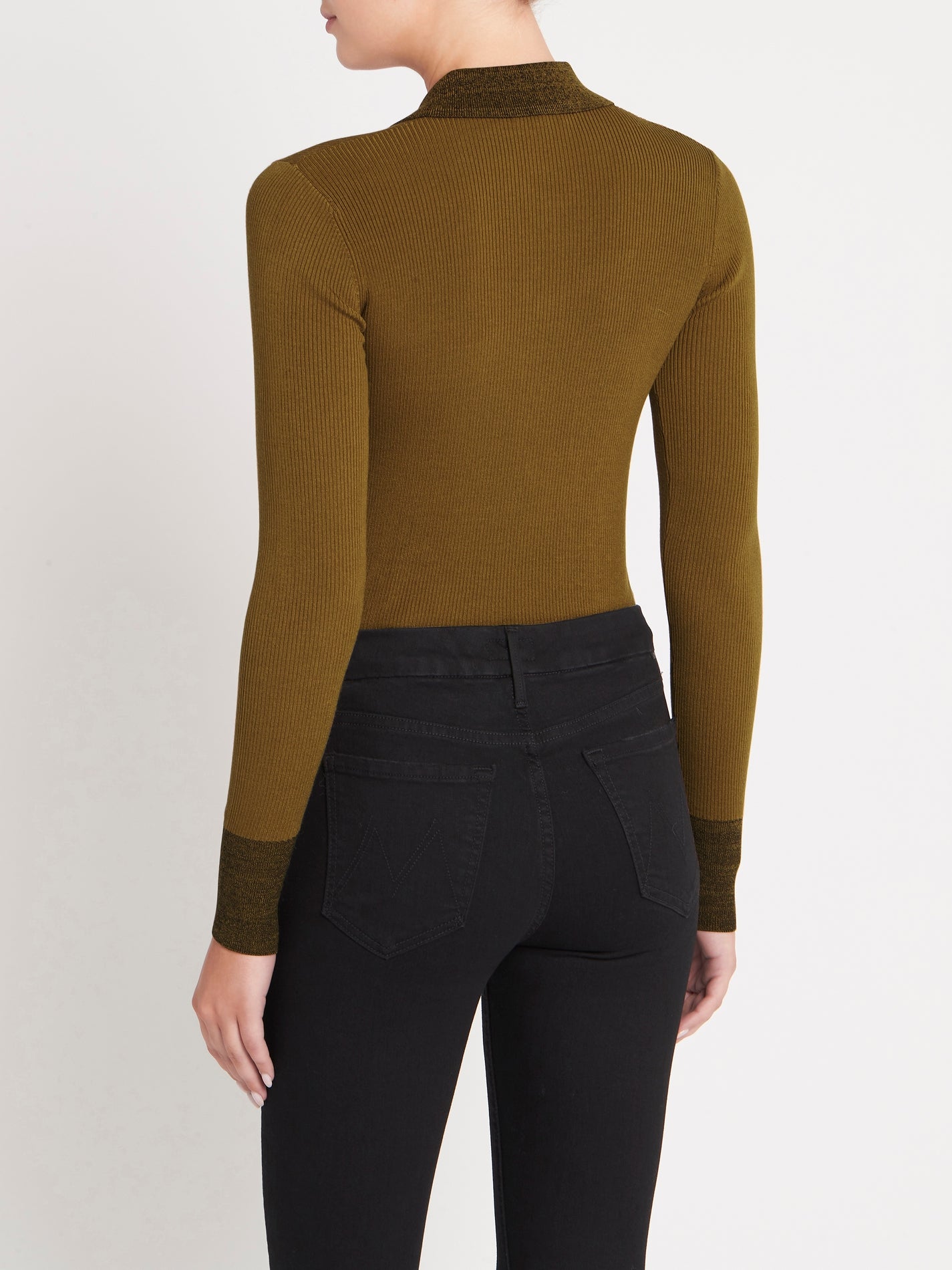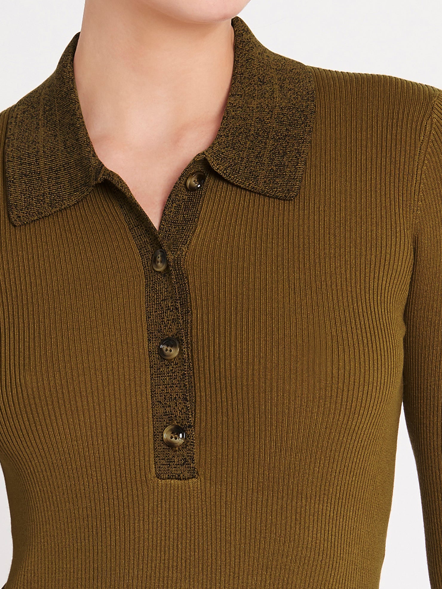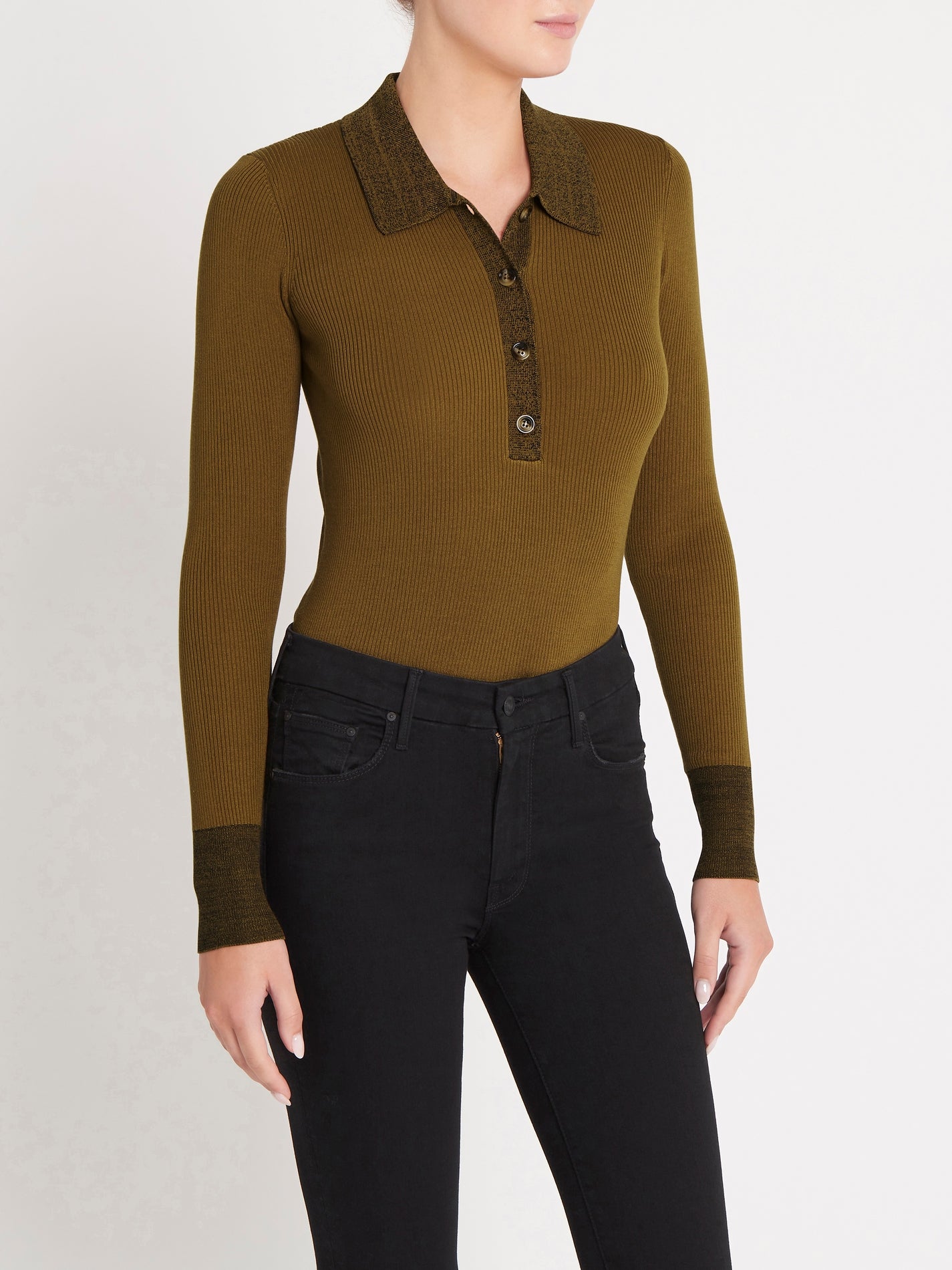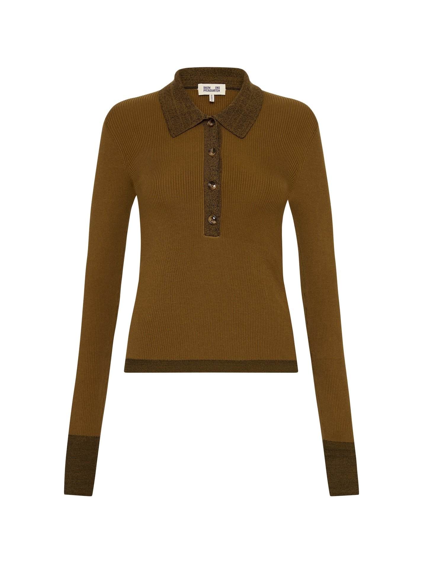 The Baum Und Pferdgarten Clariette Top in Tapenade is a flattering ribbed knit top with a short collar, button down neckline and contrasted trims. Wear tucked into any high waisted pants with loafers for a trendy everyday style.