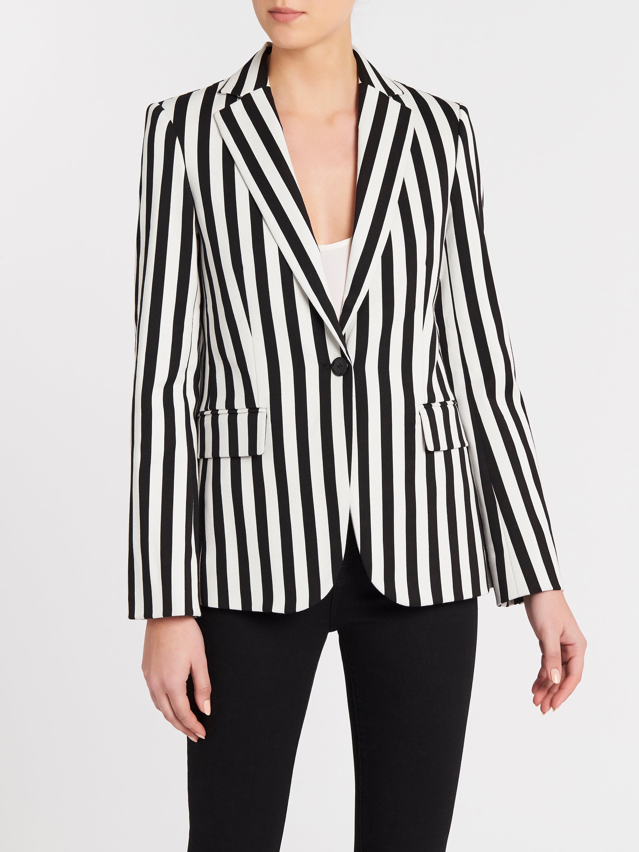 The Classic Blazer in Noir by Frame Denim is the perfect autumn layer piece. Crafted from an ultra soft cotton blend this statement blazer features bold noir stripes accentuating this classic silhouette with a peaked lapel collar, centre back vent and is finished with a single button fastening. Layer over a crisp button down and leather look denim for a modern muse inspired weekend look.