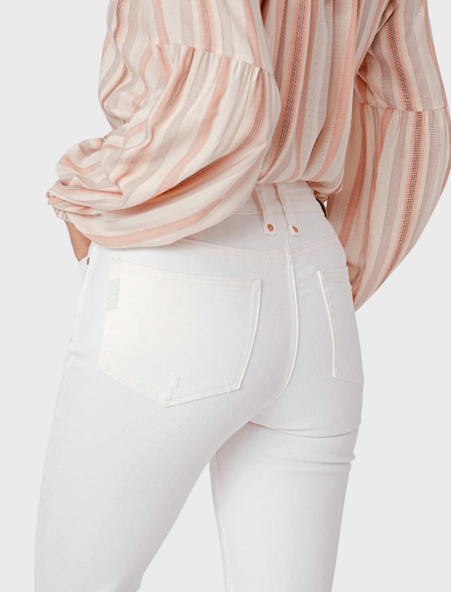The perfect white Jean does exists and it's made by Paige. The Cindy Jean in Tonal Ecru is a classic high-rise with a straight cut leg. This jean ends with a raw hem finish, with some intentional distressing across the back pockets and has a special feature of double back belt. Using tonal stitching and a combination of silver and rose metal hardware this must have pair of jeans is the perfect style to take you from spring into summer.