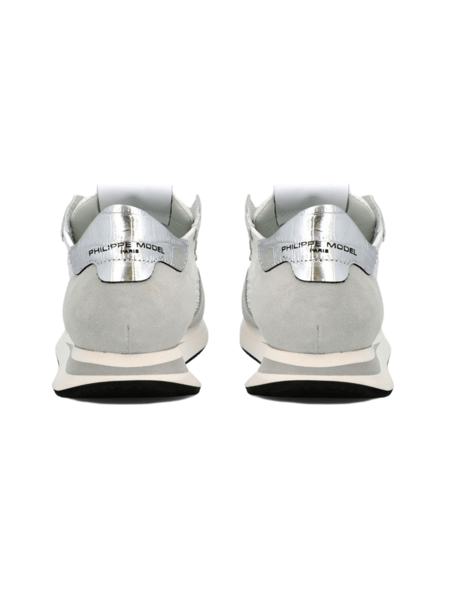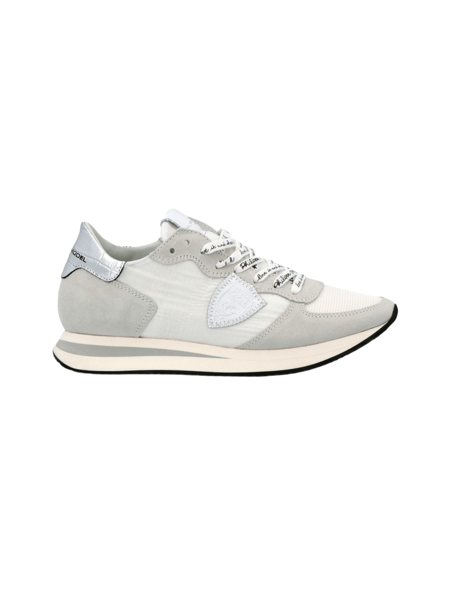 Step up your white sneaker game in the Philippe Model TRPX Low Sneaker in Croco Blanc. This iconic vintage inspired style has a upper panel made from suede with nylon mesh fabric and a silver crocodile effect print laminated calfskin heel tabs. The logo printed laces have a worn effect, the style is completed with a slight wedge heel ensuring the TRPX will always make your weekend outfit fresh.